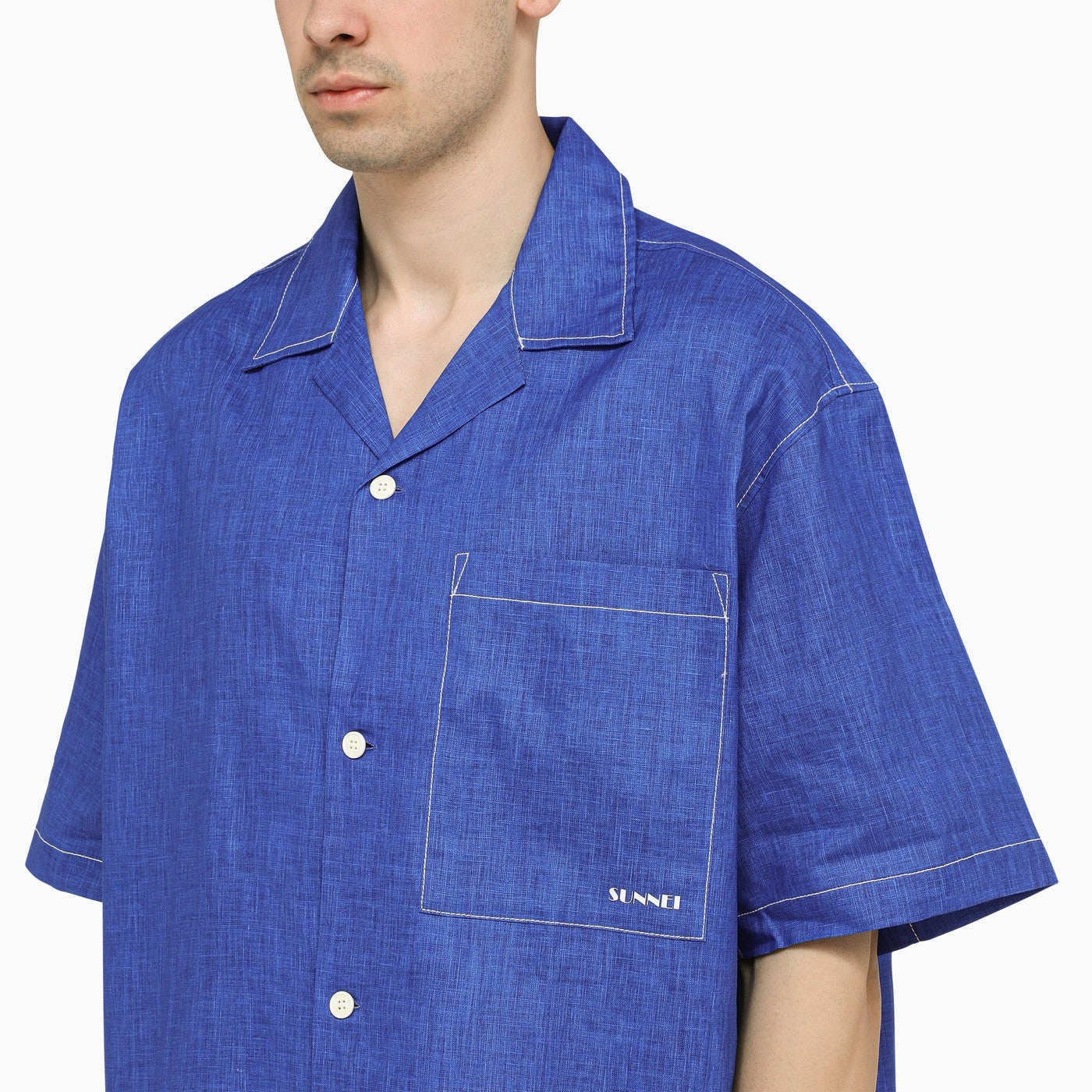 Blue linen wide bowling shirt from Sunnei featuring a front button placket, chest pocket, short sleeves, embroidered logo and decorative stitching.