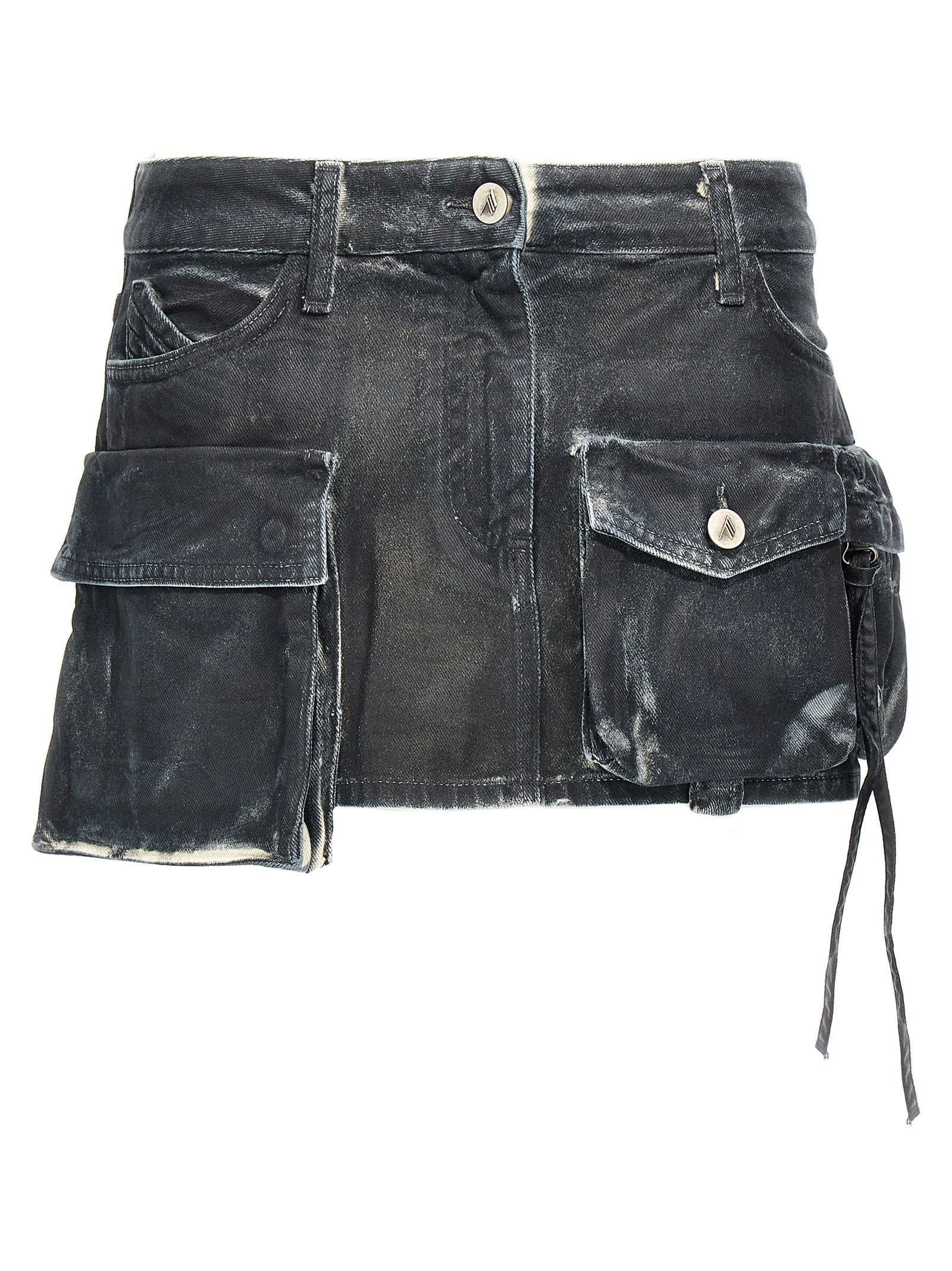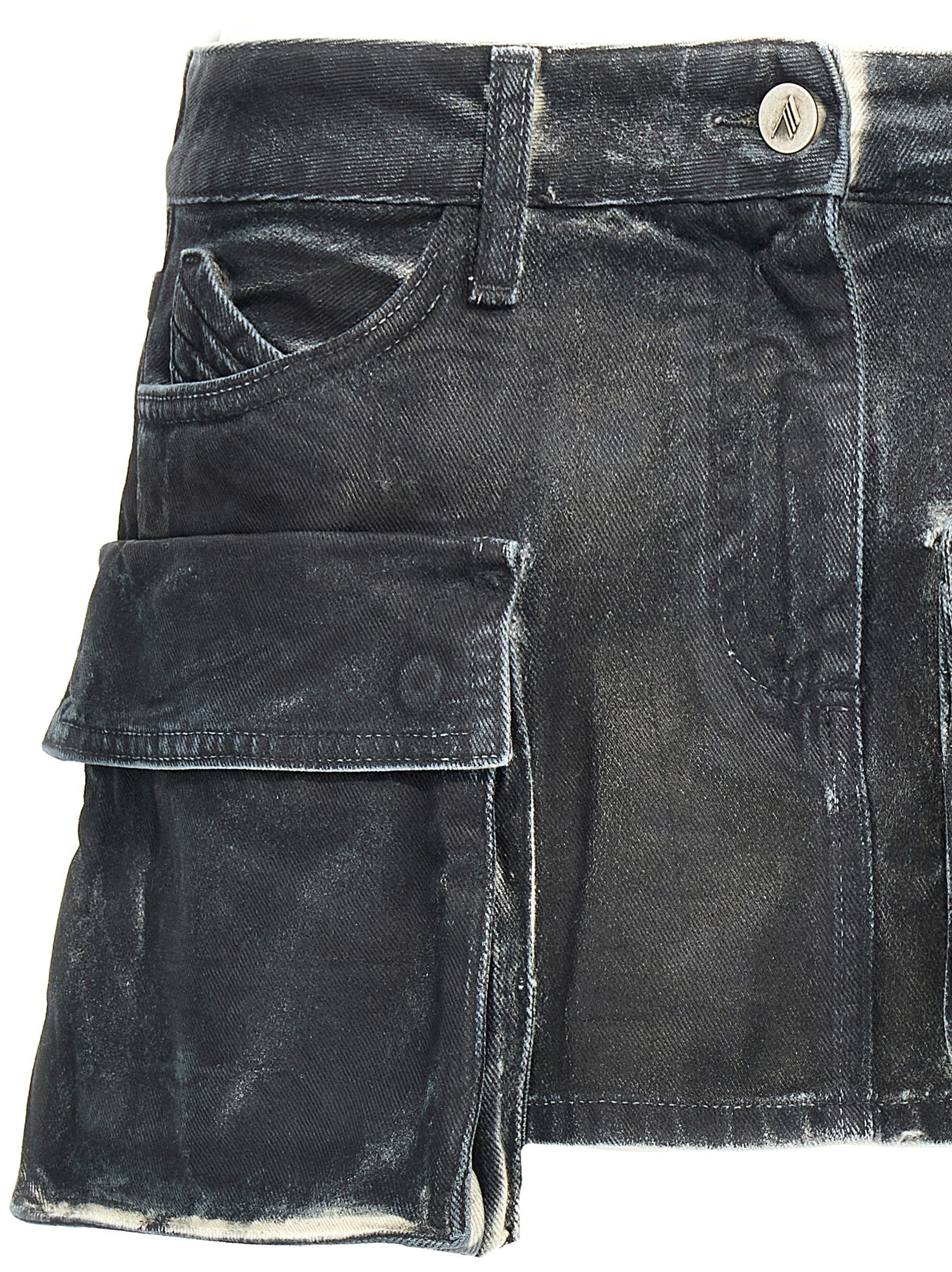 Cargo denim mini skirt with multipockets, low waist, zip and button closure, and leather logo label at the back.