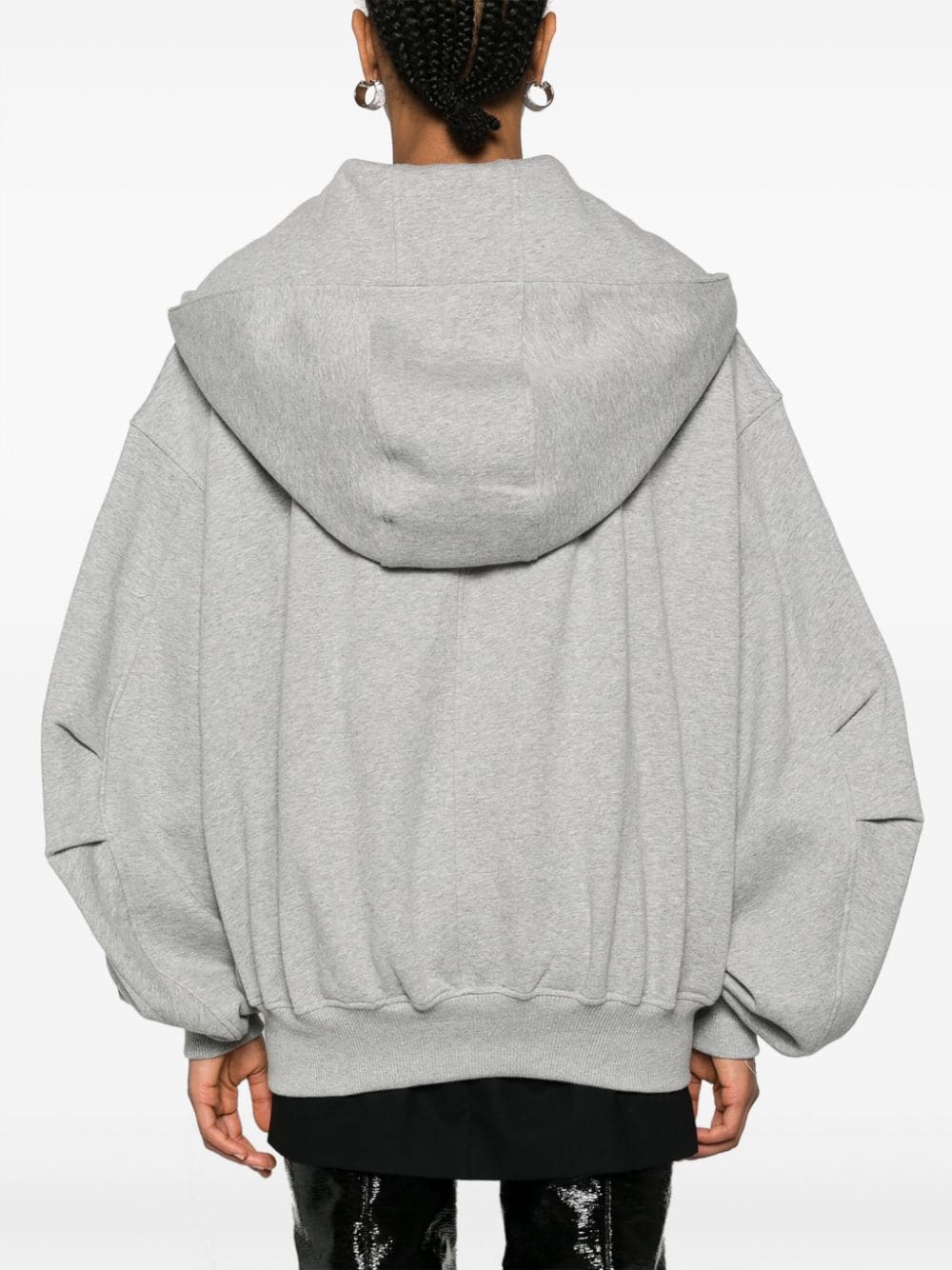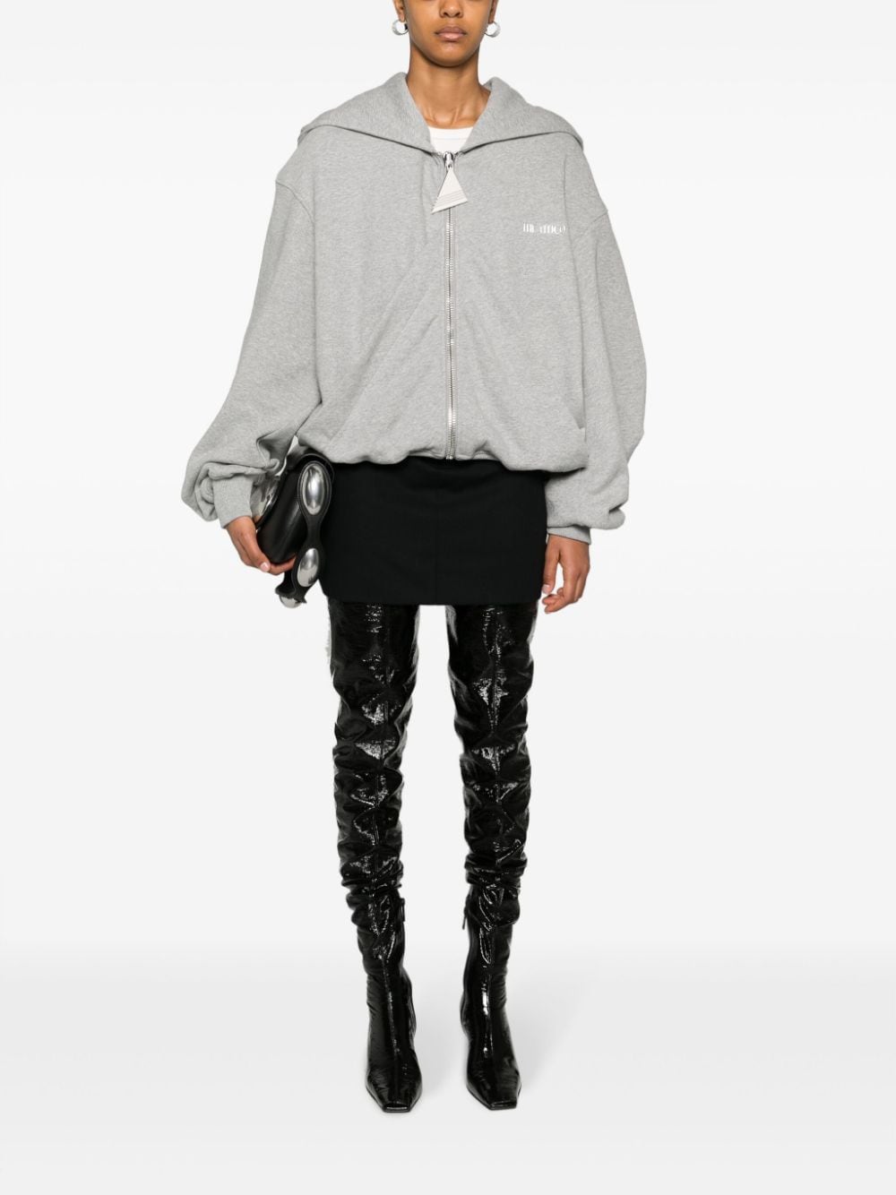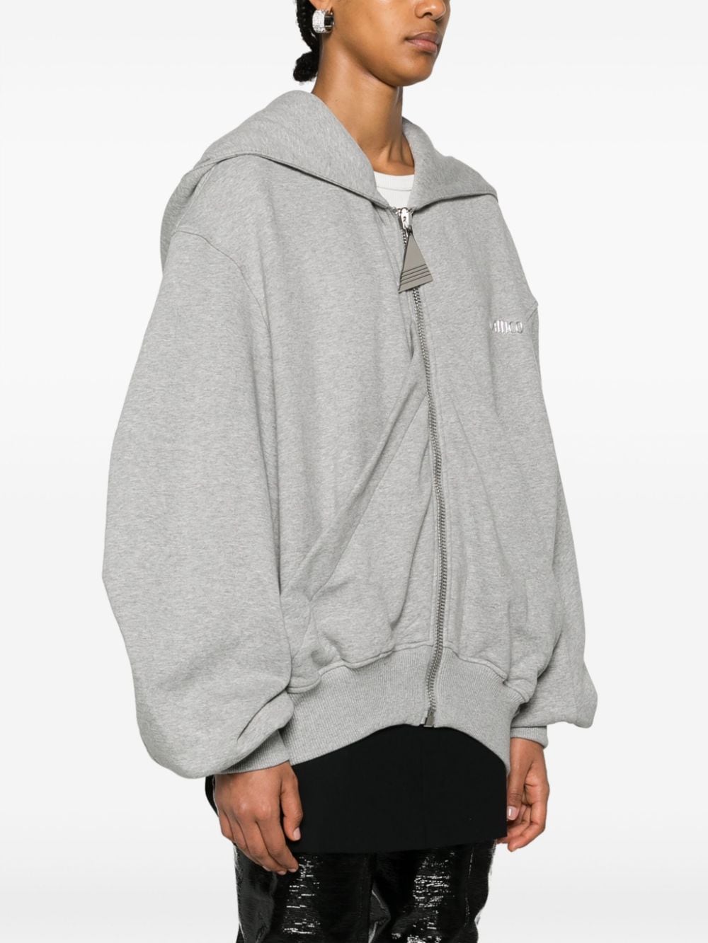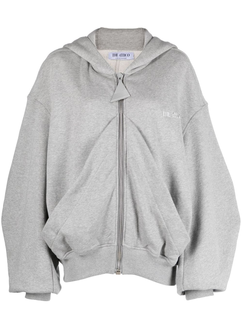 logo-embroidered draped cotton hoodie from The Attico featuring grey, cotton, jersey texture, embroidered logo at the chest, ribbed trim, draped detailing, slouchy hood, front zip fastening, long sleeves, two side pouch pockets and straight hem.