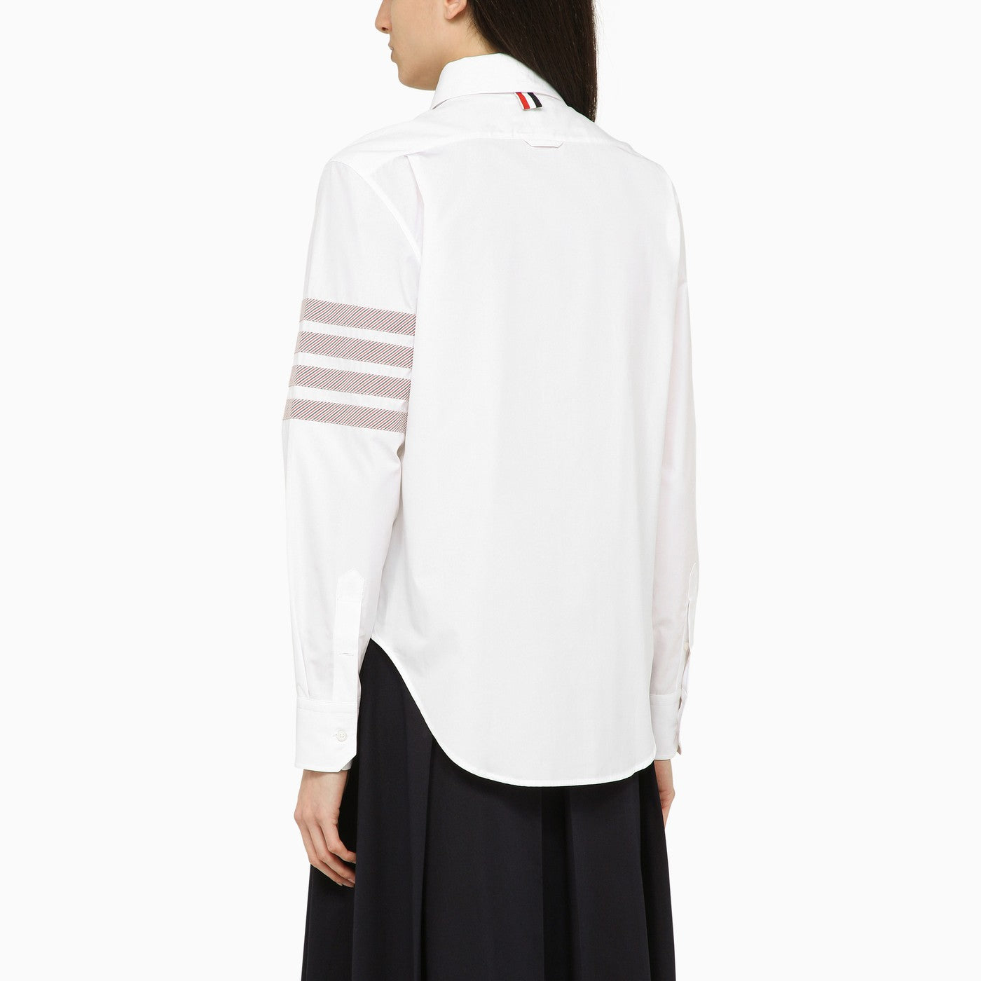 White cotton shirt from Thom Browne featuring a pointed collar, front button placket, long sleeves with button and stripe detail, logo patch on front and tricolour detail on back.