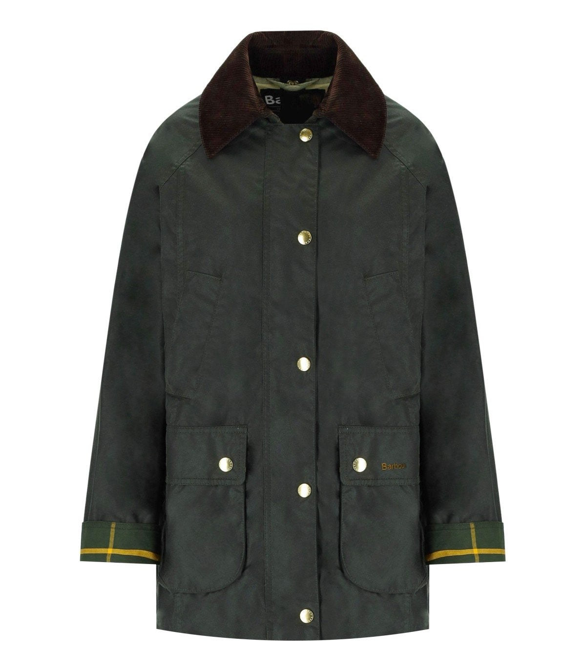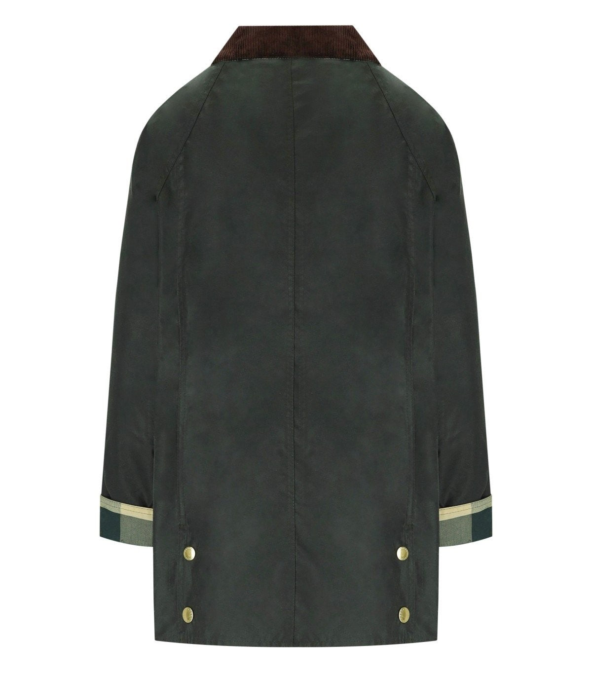 Beadnell jacket by Barbour, made of waxed cotton in sage green tones. Characterized by a front closure with a zip hidden by buttoning, finished with golden buttons. It features a corduroy collar and long sleeves with cuffs. Internally lined in classic tartan fabric, it has four pockets on the front, two flap pockets and two with golden button closures. The back has two vents, with button closures. Regular fit. Outer composition: 100% waxed cotton. Lining: 65% polyester, 35% cotton. Sleeve lining: 100% polyester. Water-repellent band: 100% recycled polyester. Collar: 100% cotton.