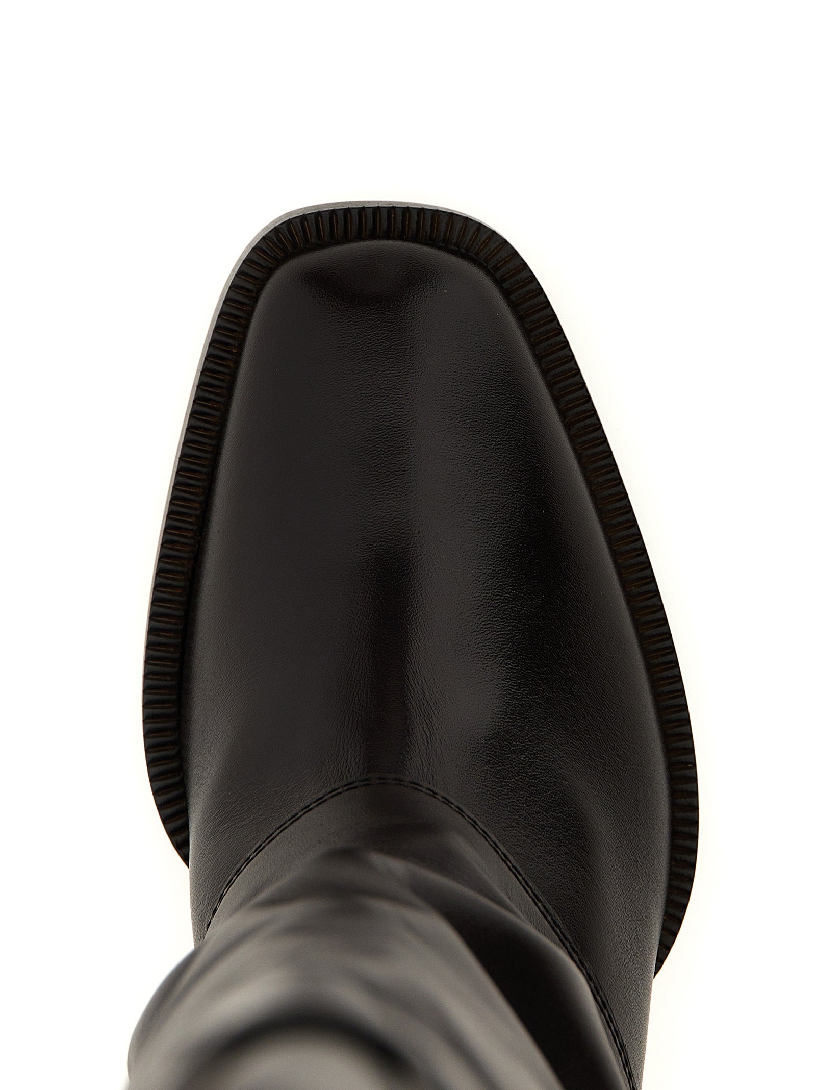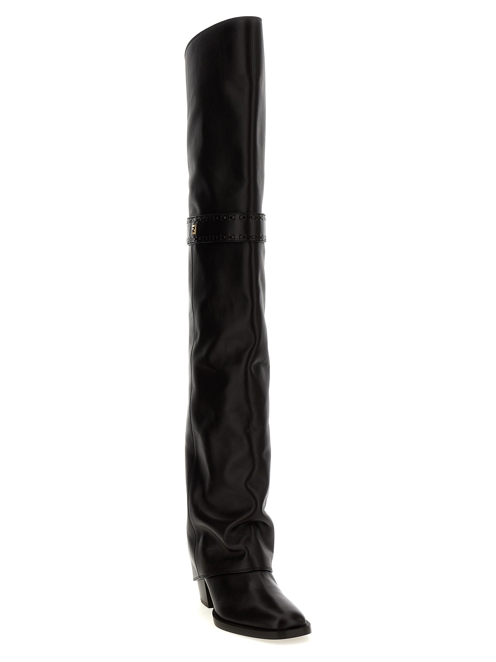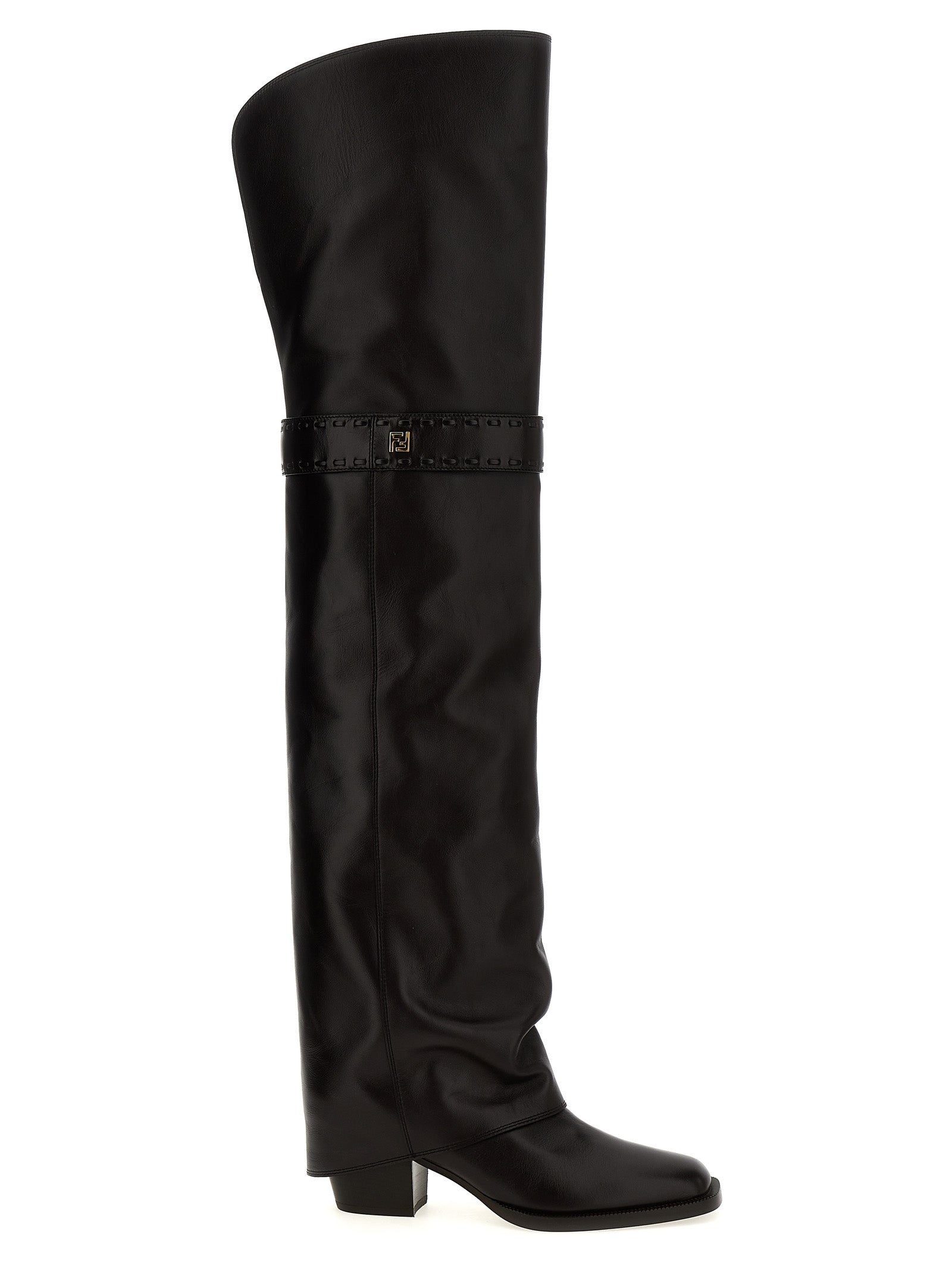 Cuissard 'Fendi Show' leather boots with square toe and tube leg, FF knee strap, chunky heel, leather sole.