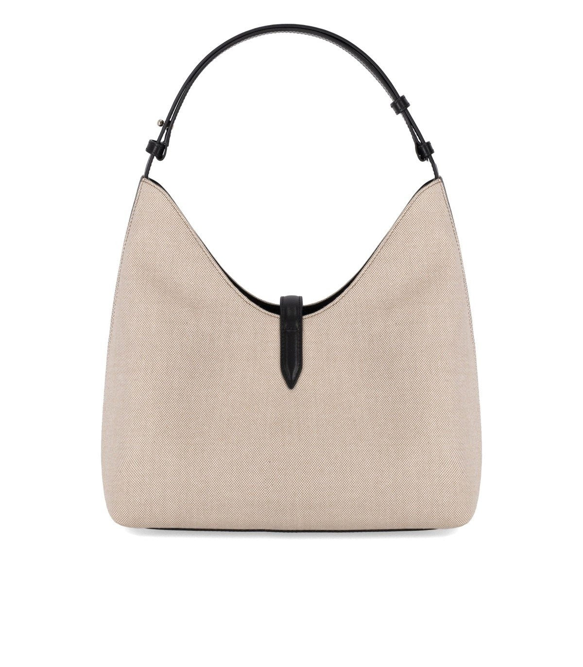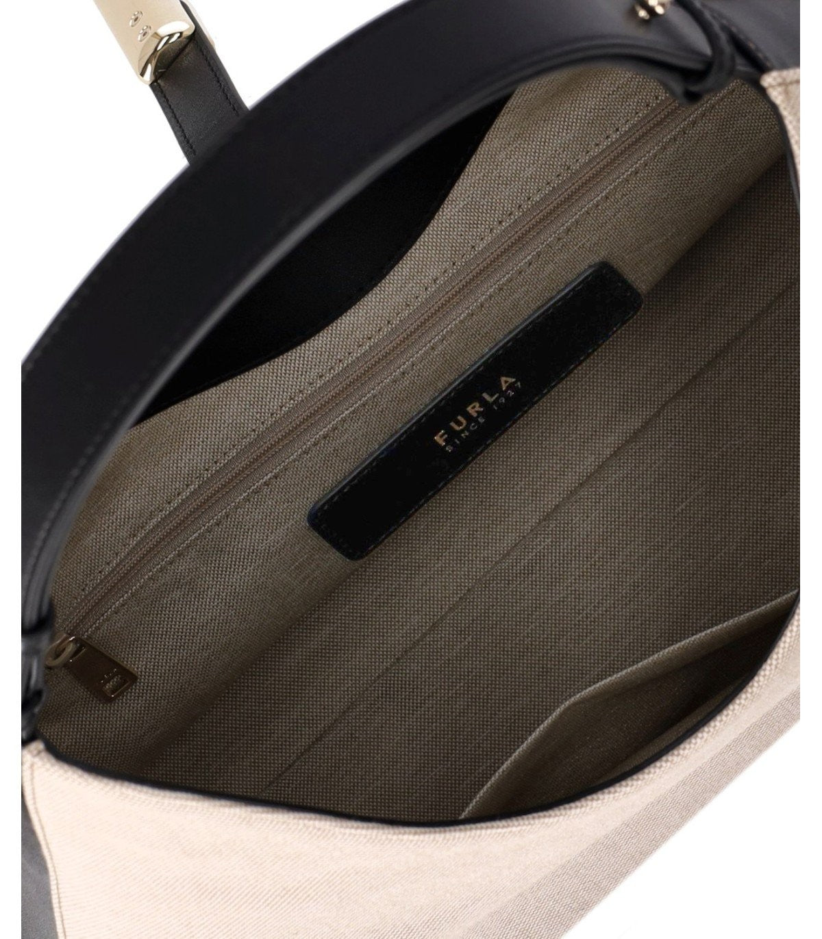Furla Goccia M Hobo shoulder bag, made of canvas and leather details, in shades of beige and black. Characterized by an adjustable smooth leather handle, it features an open wall pocket and an internal pocket with a zip closure. Adorned with a matching strap embellished with cylindrical golden metal hardware, featuring a weight decorated with the Furla Arco logo. Dimensions 30x30.5x16 cm. Composition: synthetic fabric (canvas), calf leather.