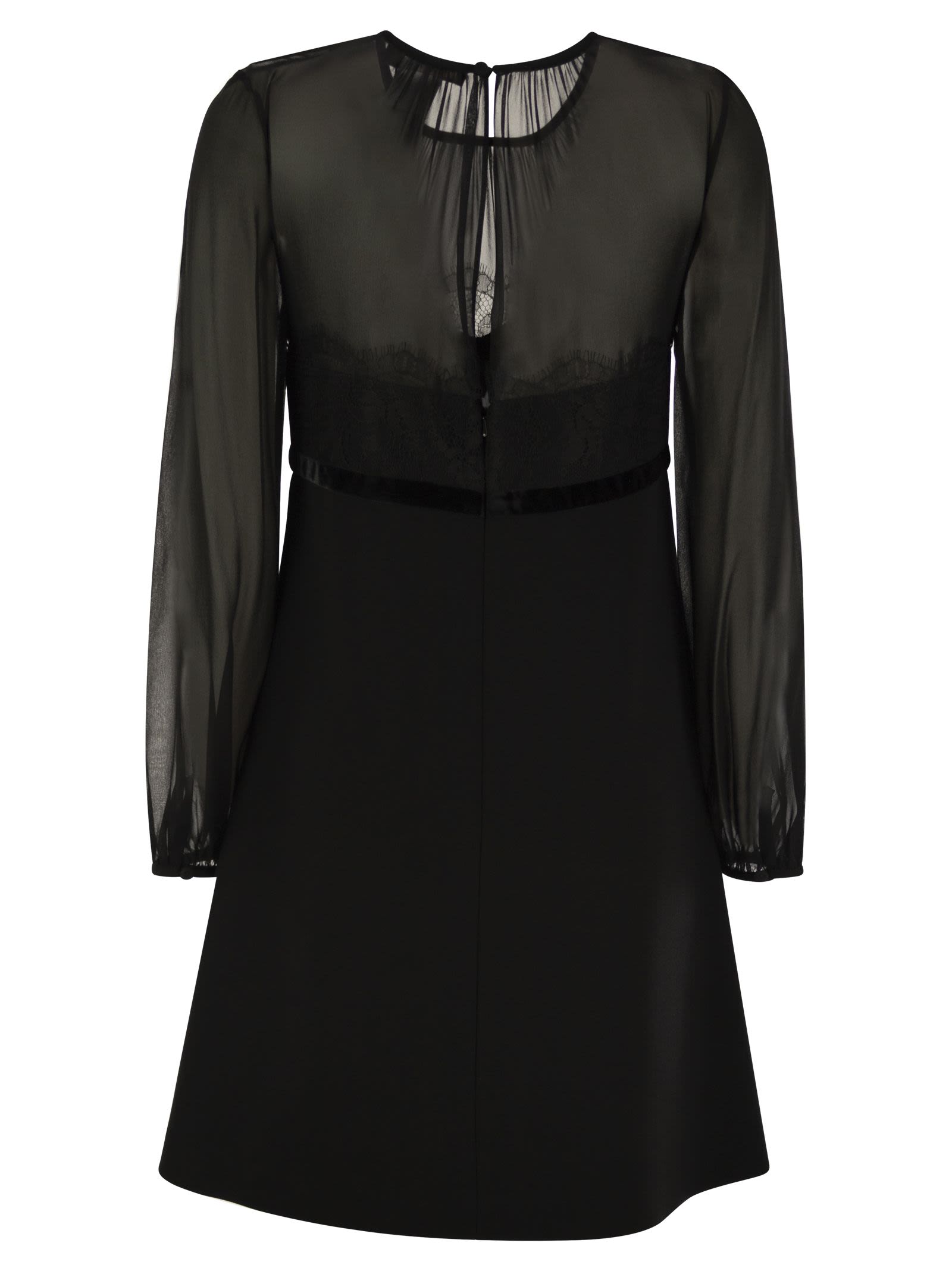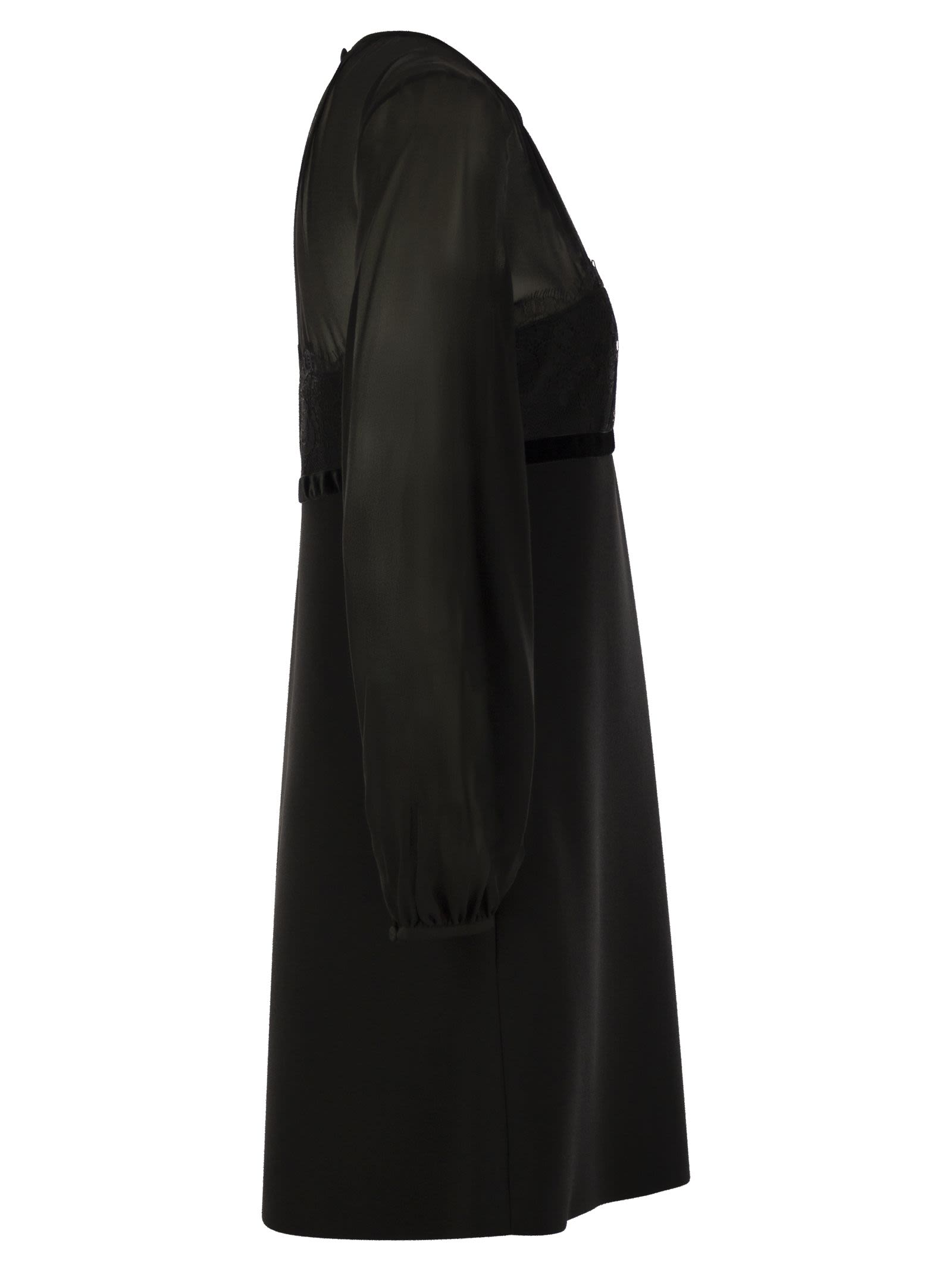 Short dress composed of a bodice with long puffed sleeves in light and precious pure silk georgette and a high-waisted skirt in laminated sablé. The dress has a round neckline with a slight gathering at the neckline, pockets inserted at the hips and a buttoned drop motif at the cuffs. Embellished with Chantilly lace bustier insert and velvet ribbon at the waist. - Teardrop fastening with small button and invisible zip at the back - Long puff sleeves - Round neckline DESIGNER ID: 2426226064600 001