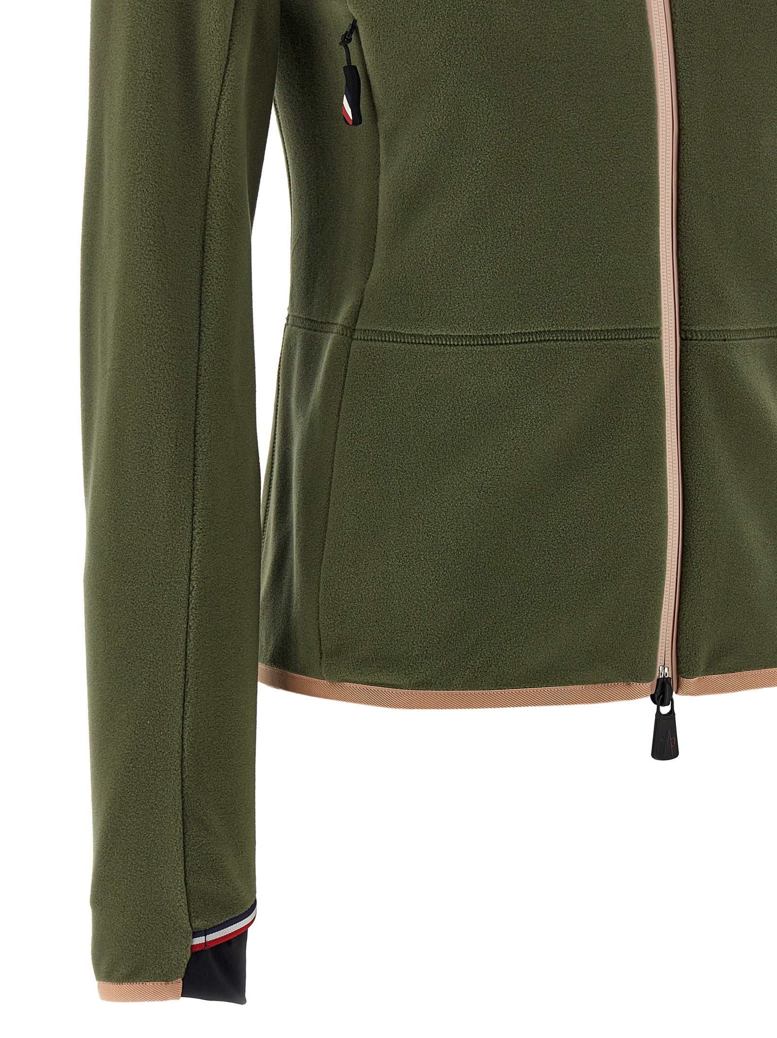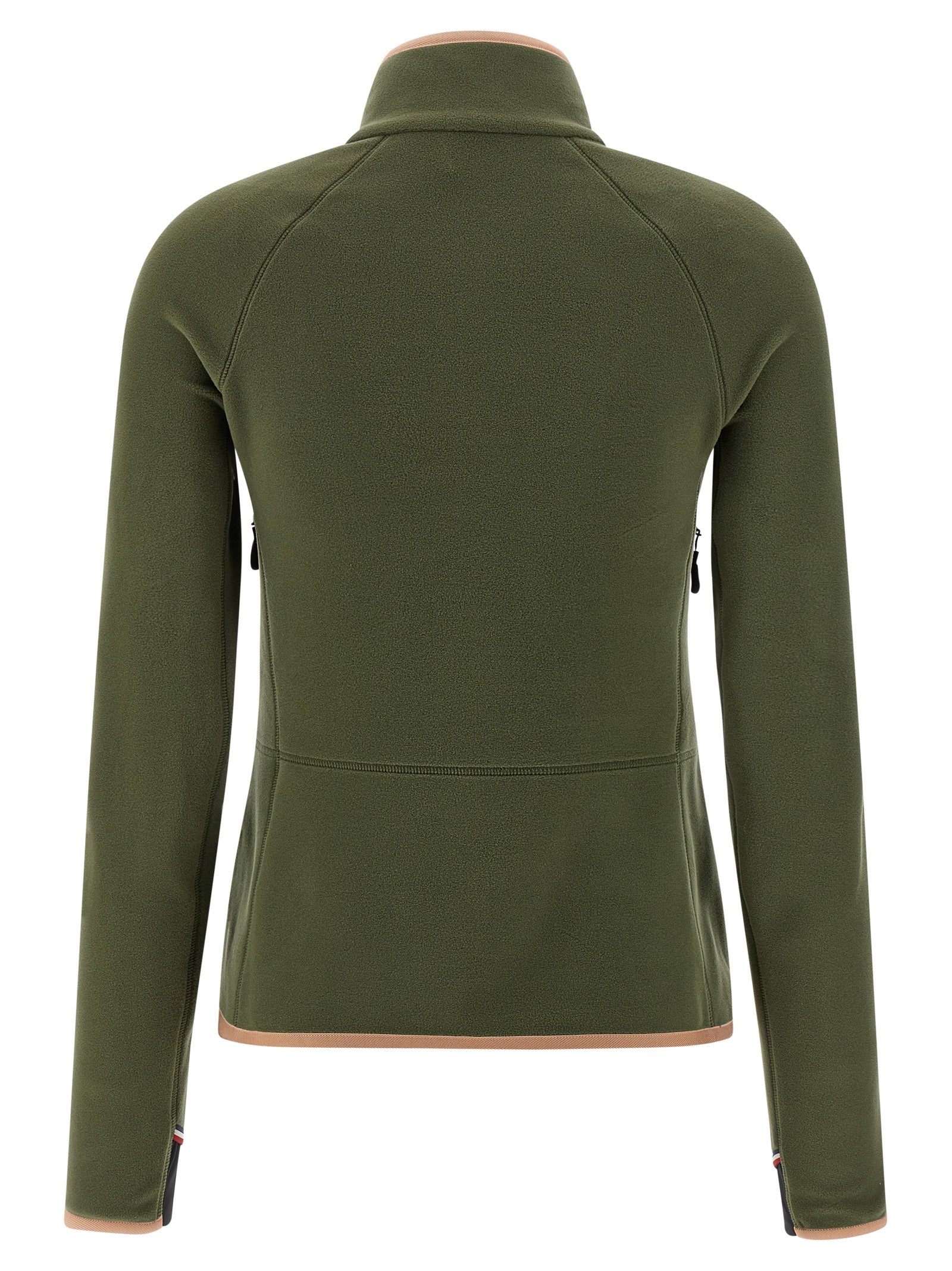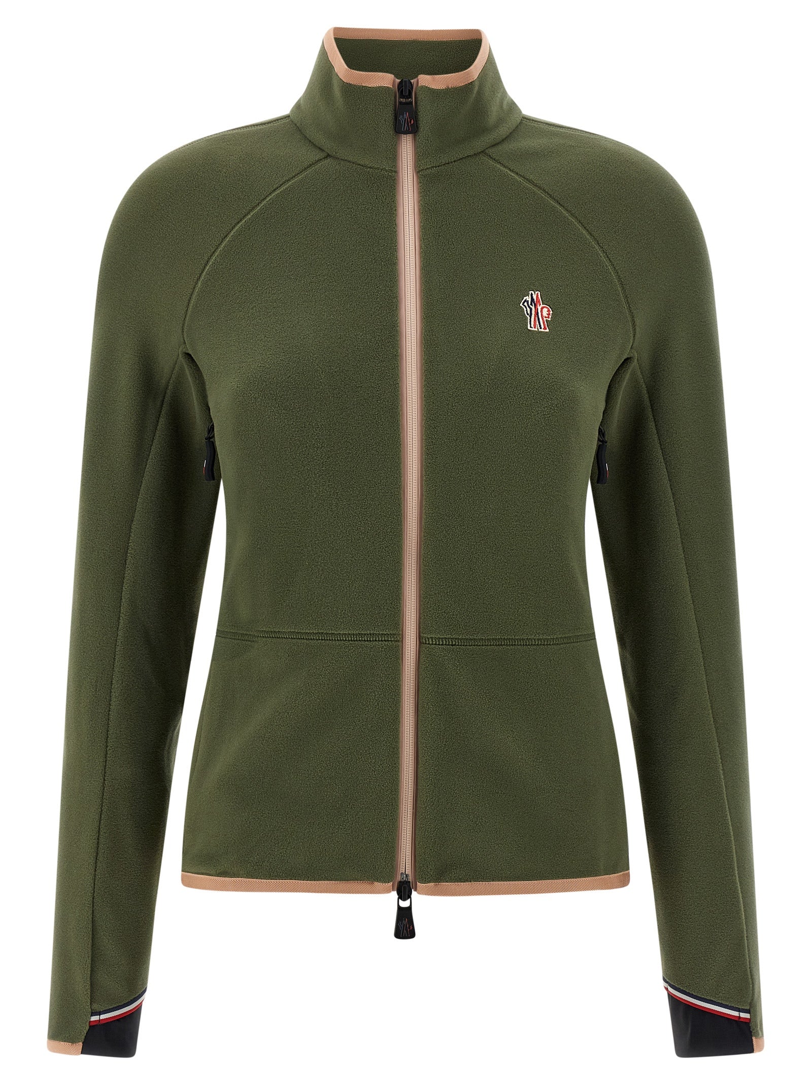 'Cardigan' slightly stretch fleece sweater, high neck, front zip closure, side pockets, front logo patch, asymmetrical length side design, long sleeves with cuffs and side openings.