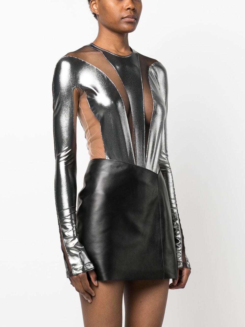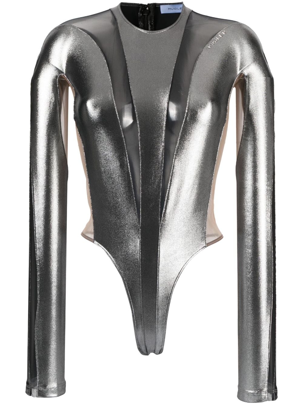 illusion shaping bodysuit from MUGLER featuring silver-tone, metallic finish, stretch-design, sheer panels, embossed logo to the front, round neck, long sleeves and thong style.