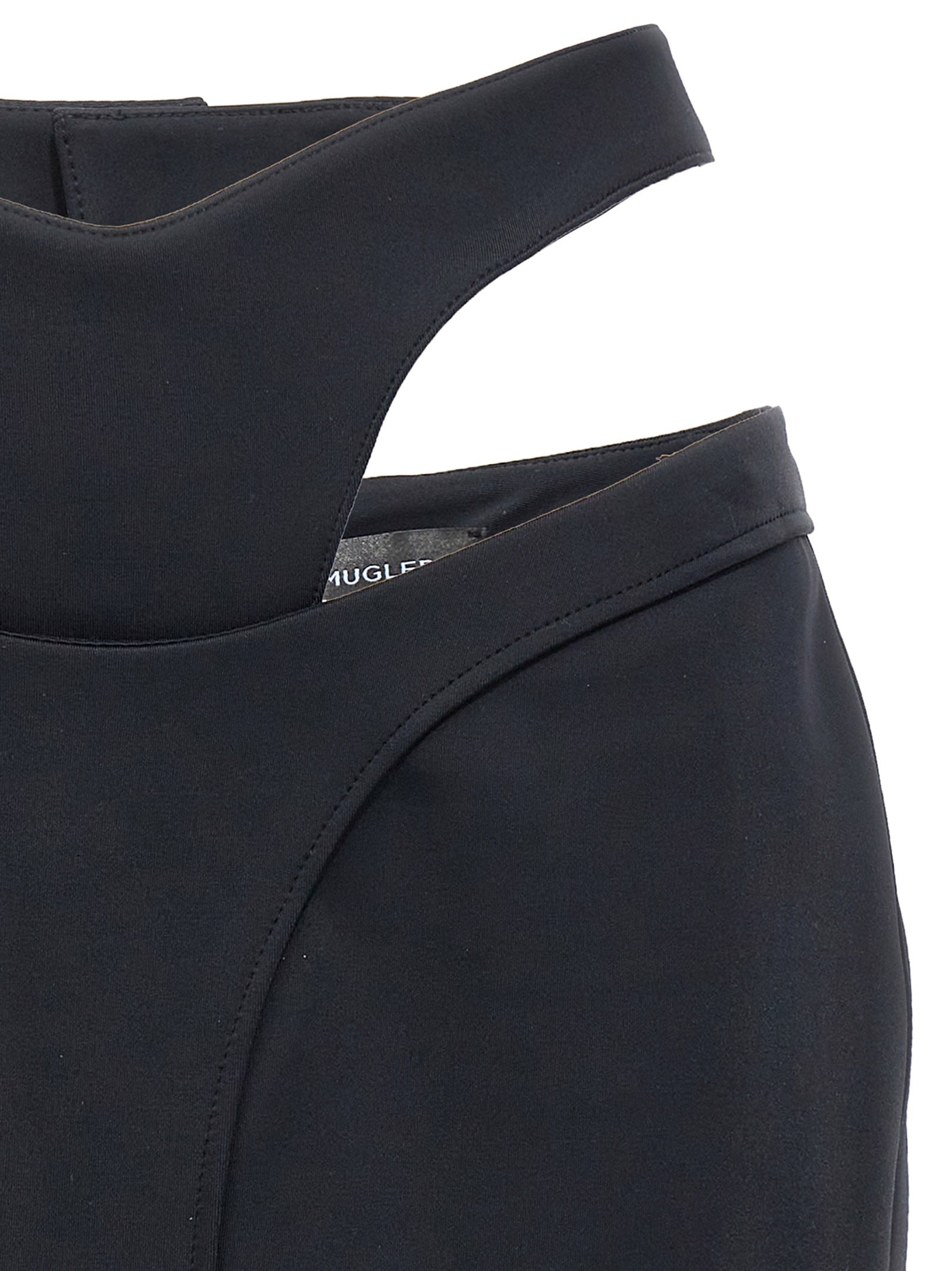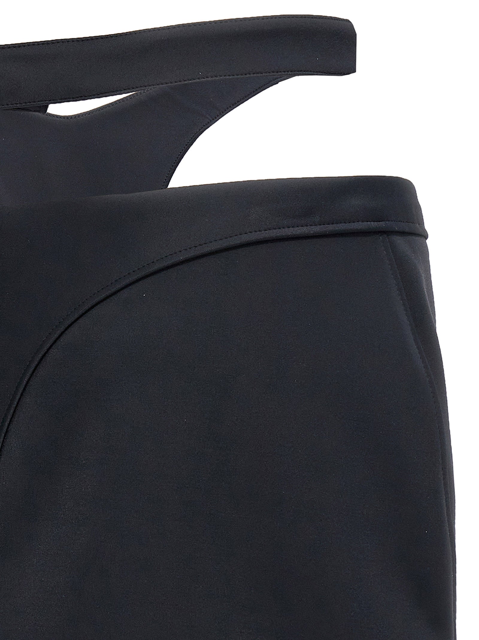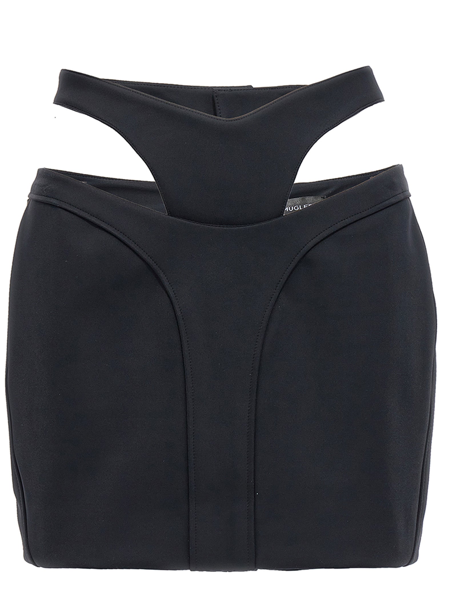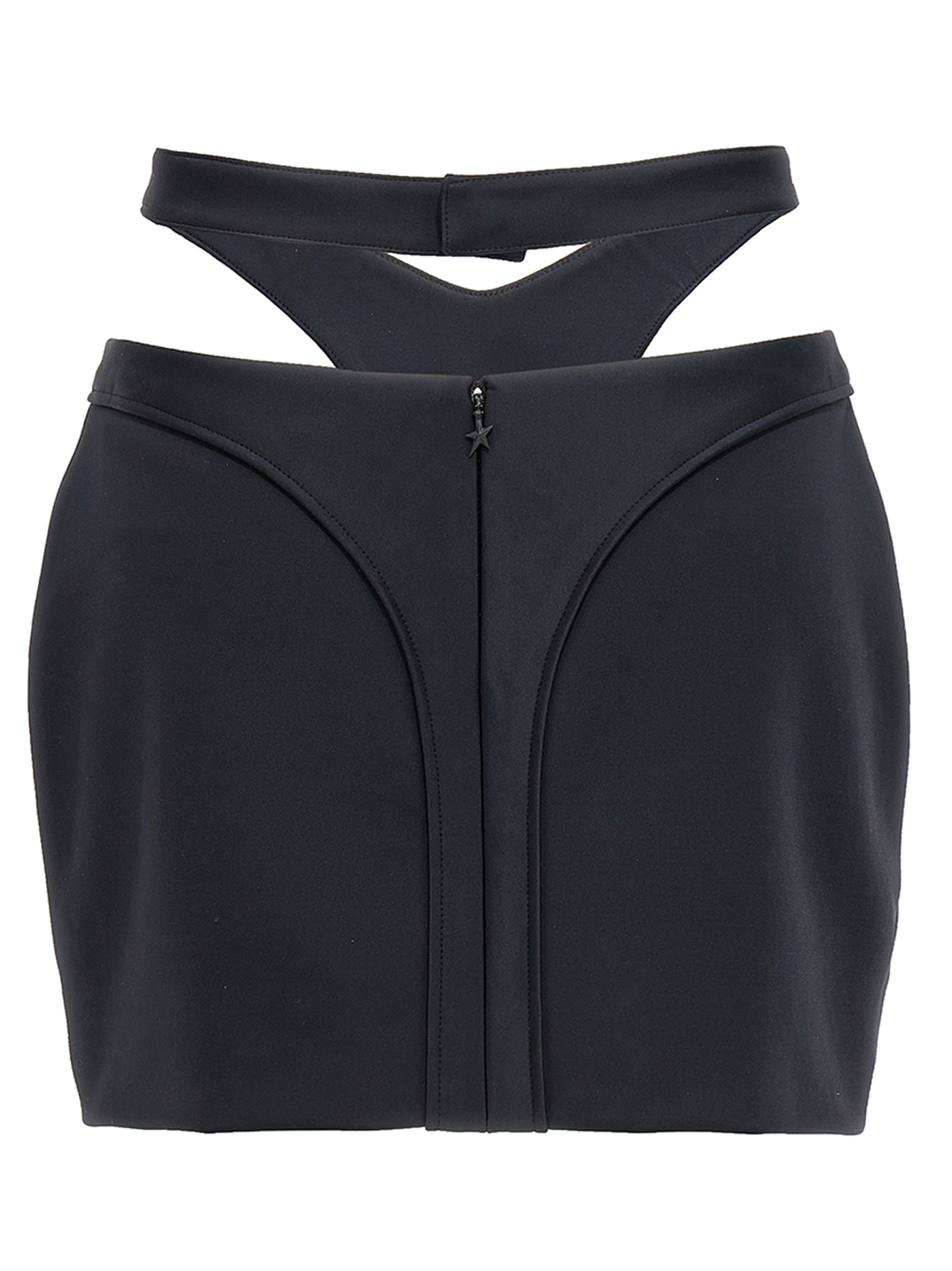 Stretch fabric skirt with visible thong detail and zipper closure at the back.