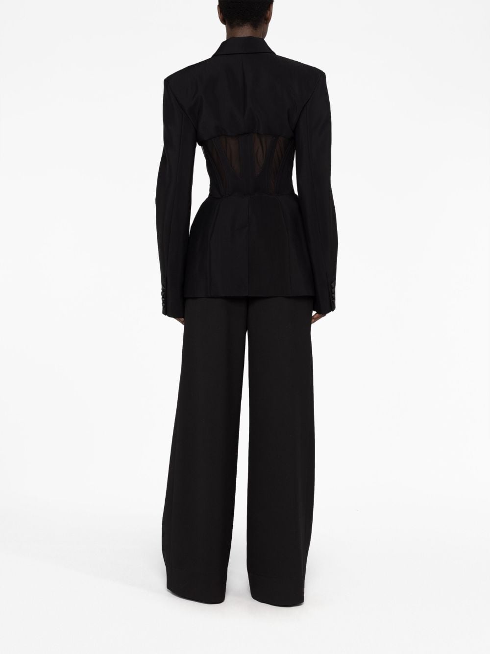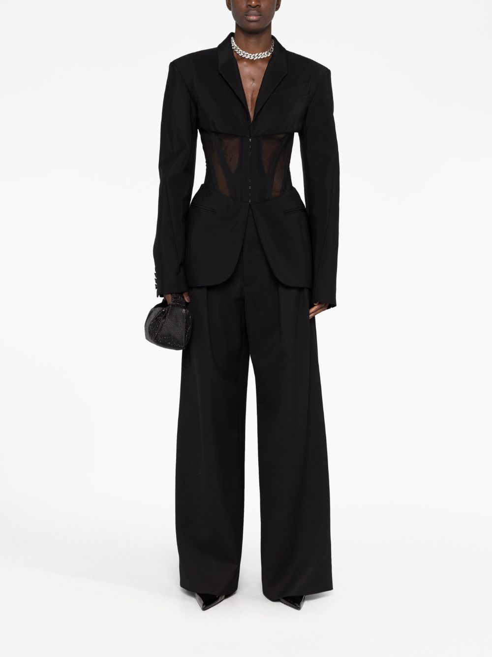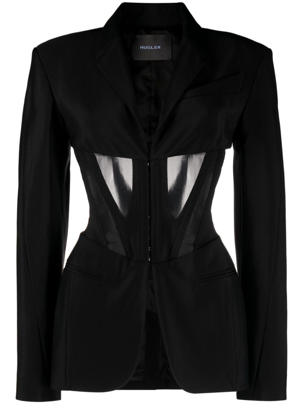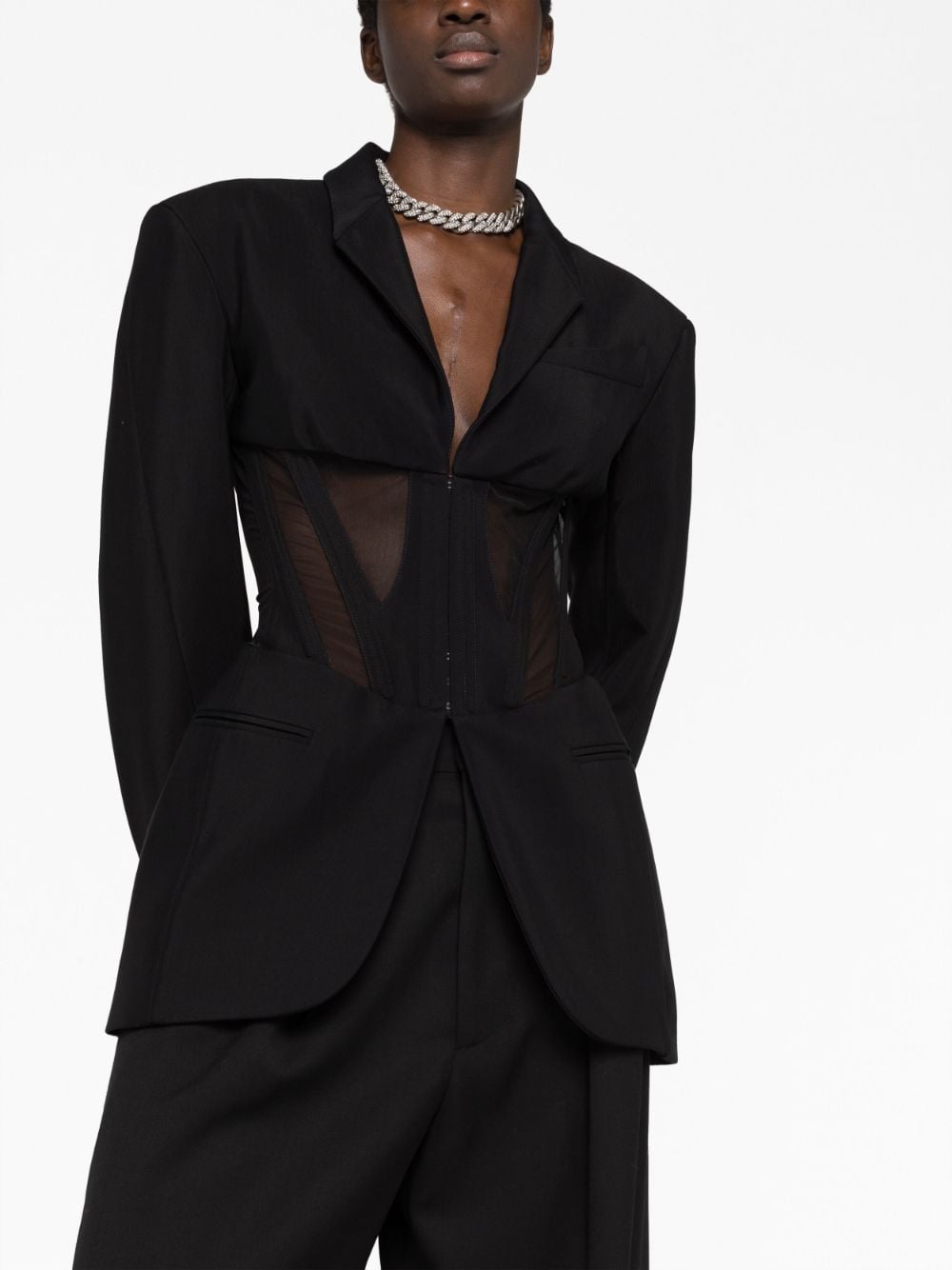 Iconic single-breasted corseted blazer from MUGLER featuring black, corset style, tulle inserts, shawl lapels, front hook and eye fastening, long sleeves, buttoned cuffs, chest welt pocket, two front patch pockets and central rear vent.