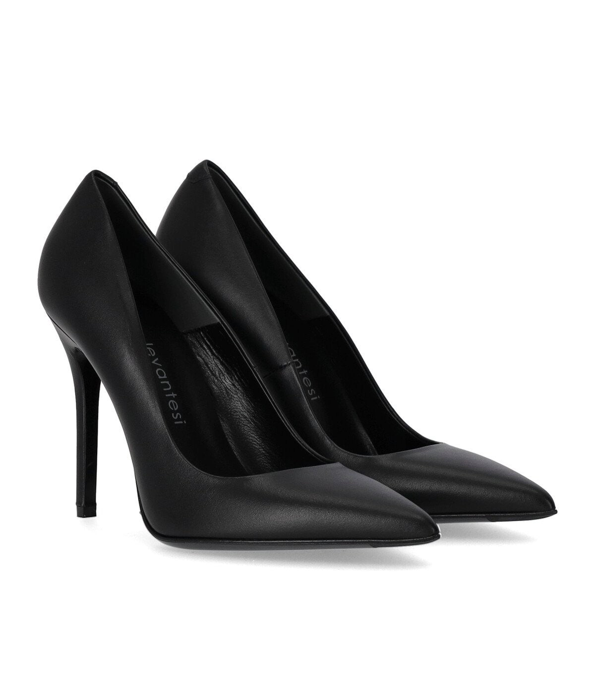 Leysbek pumps by Sergio Levantesi made of soft black leather, featuring a tapered toe and stiletto heel. Leather lining and insole, leather sole. Heel height 10.5 cm.