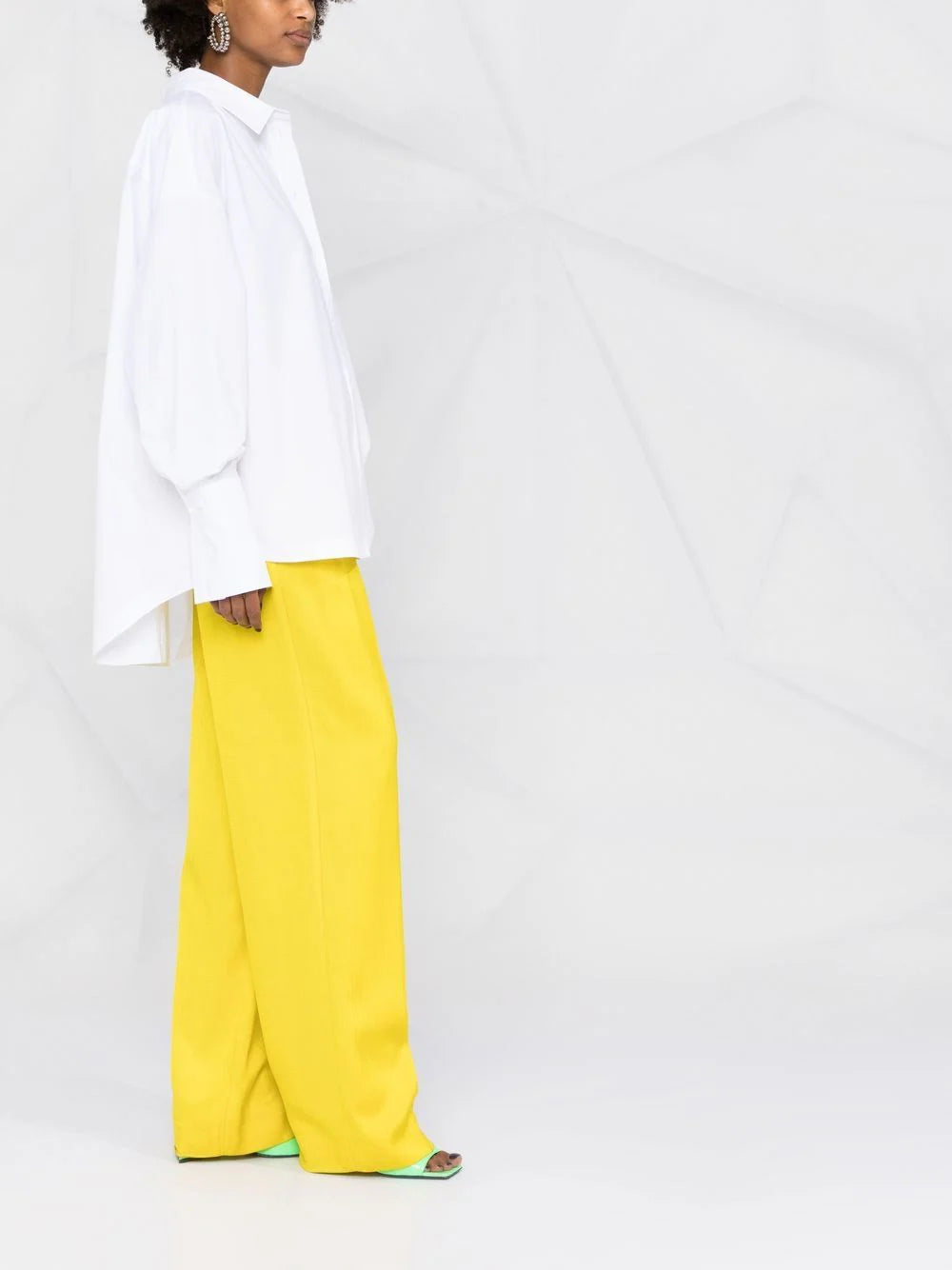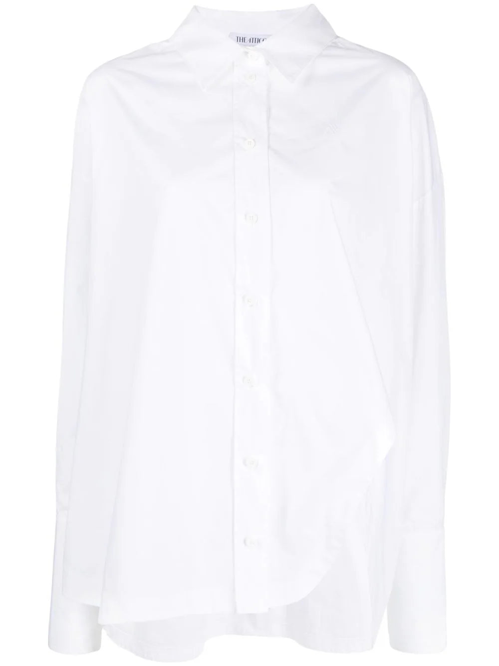White, cotton, asymmetric design, spread collar, front button closure, dropped shoulder sleeves, long sleeves, buttoned hems and curved hem.
