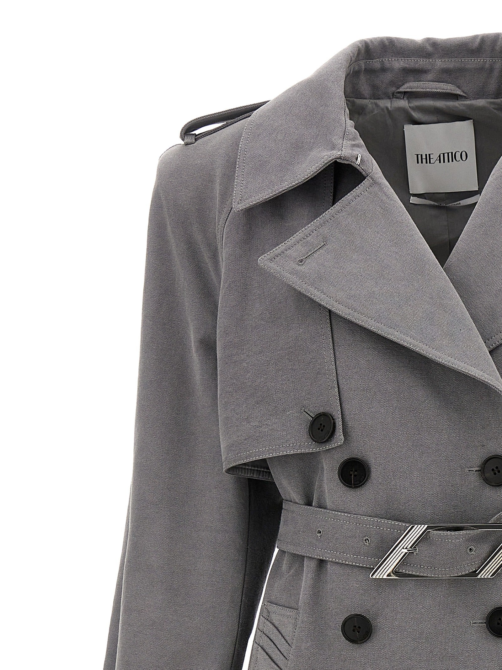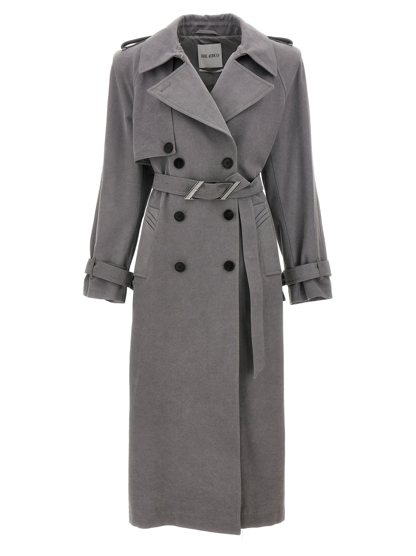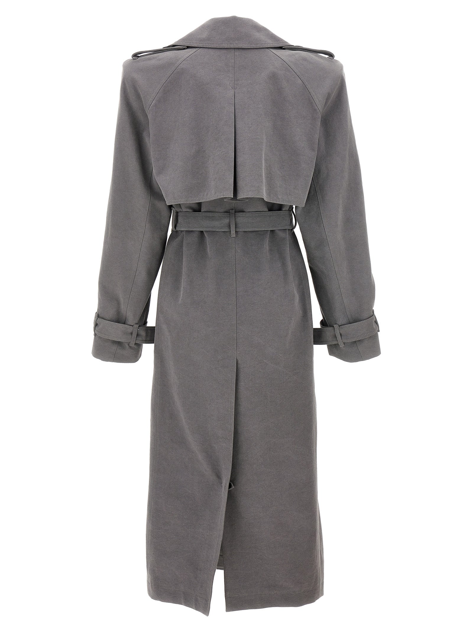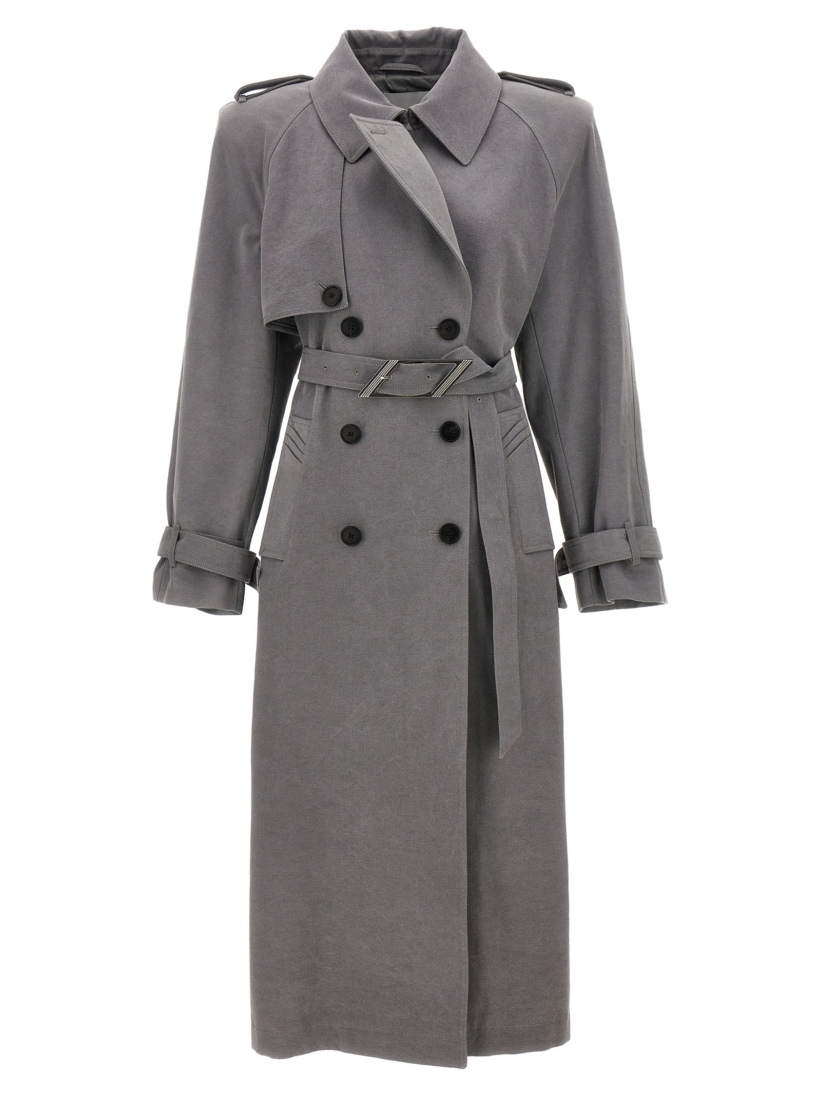 Double-breasted trench coat in washed canvas, button closure, belt at the waist, padded shoulders, long sleeves with adjustable straps on the wrist, pockets, back split.