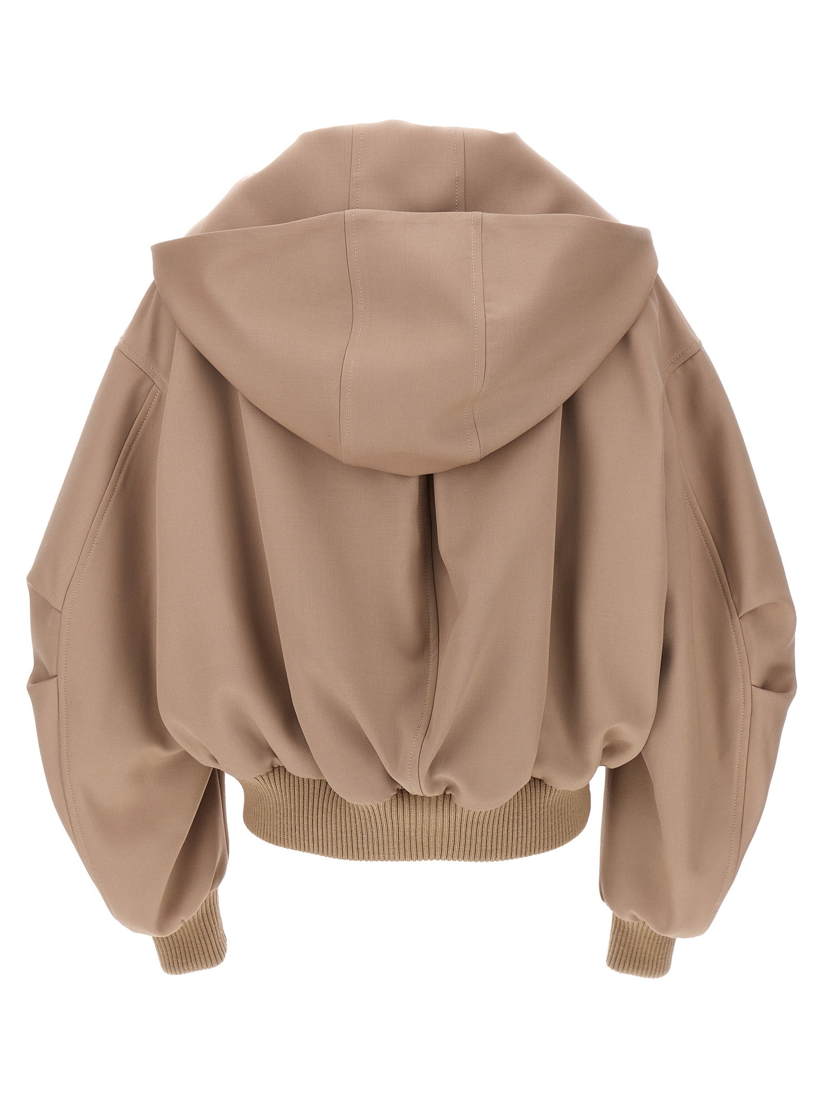 Wool hooded bomber jacket, zip closure with maxi metal logo puller, pockets, long sleeves with knitted cuffs.