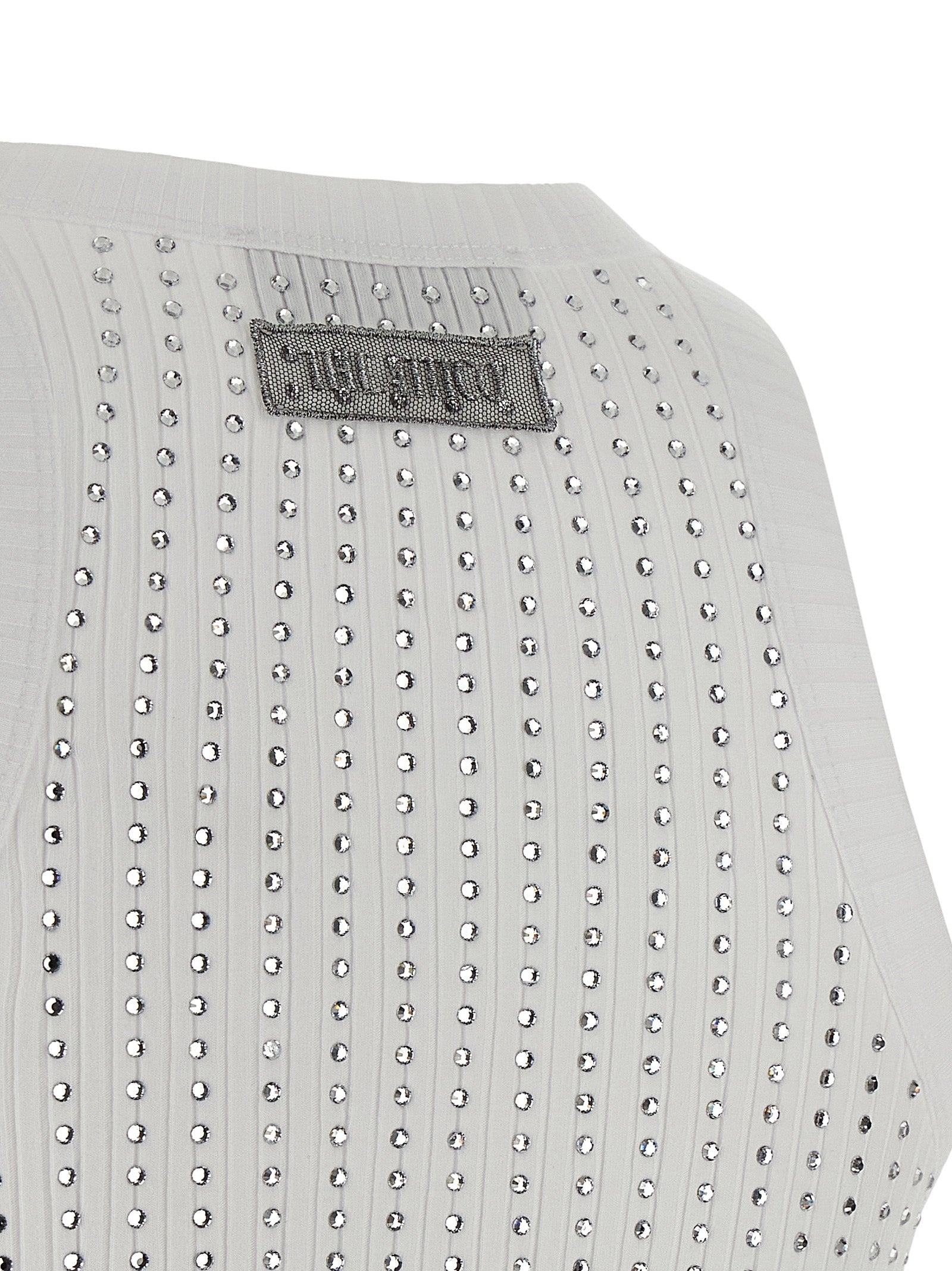 Ribbed stretch cotton tank top with all-over rhinestone appliqué, round neckline, and back logo patch.
