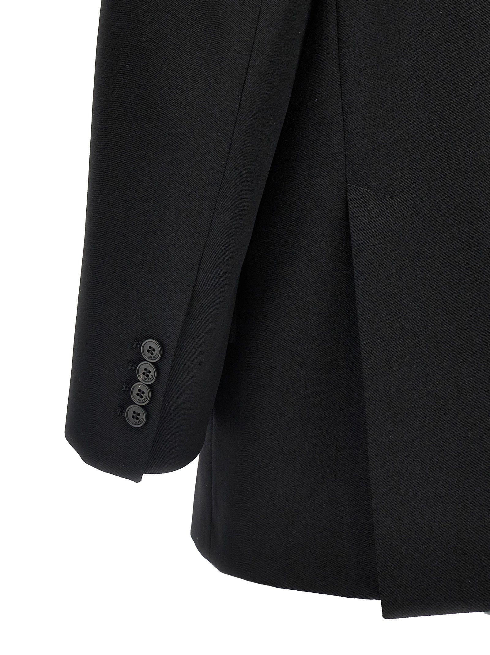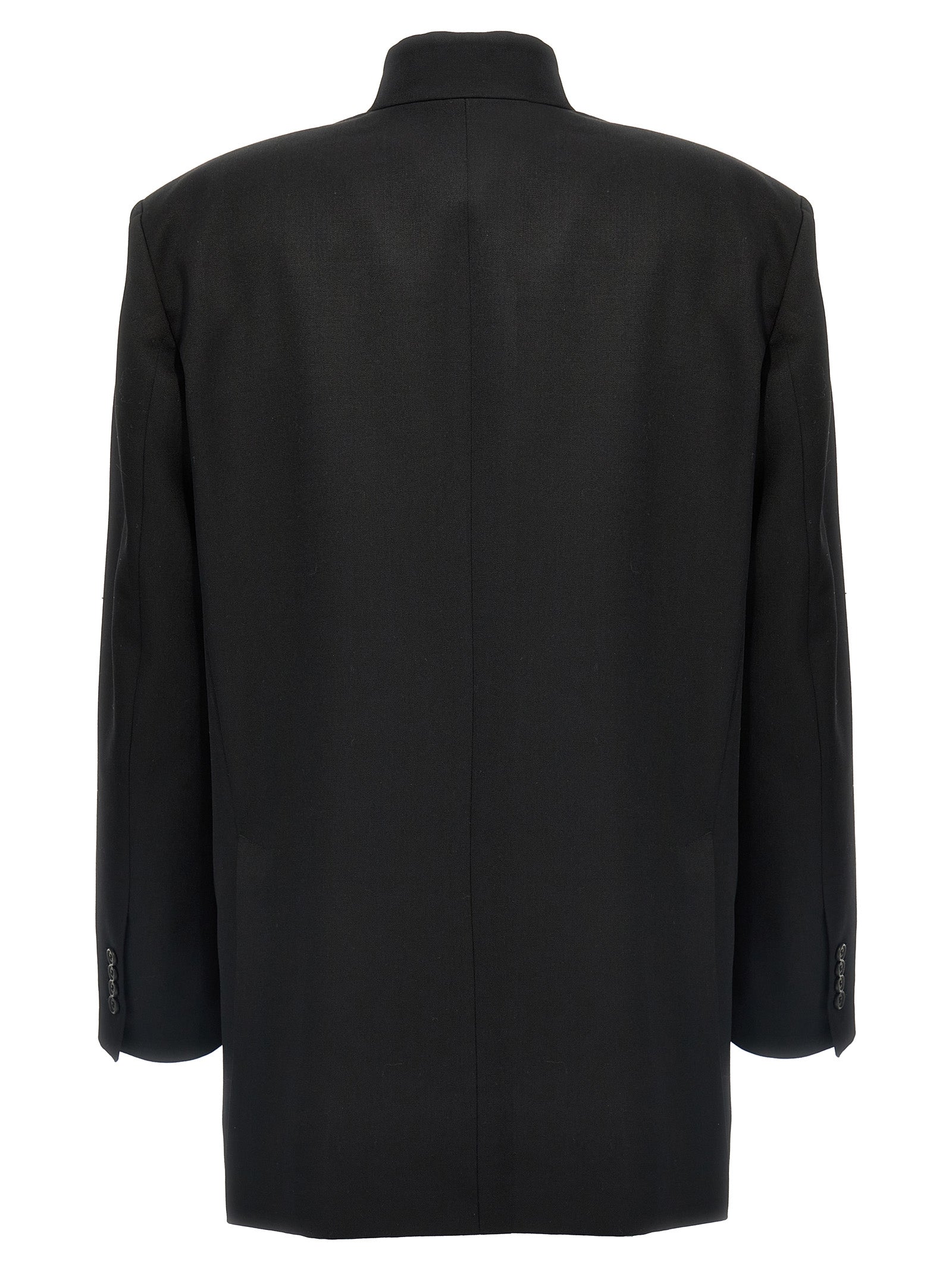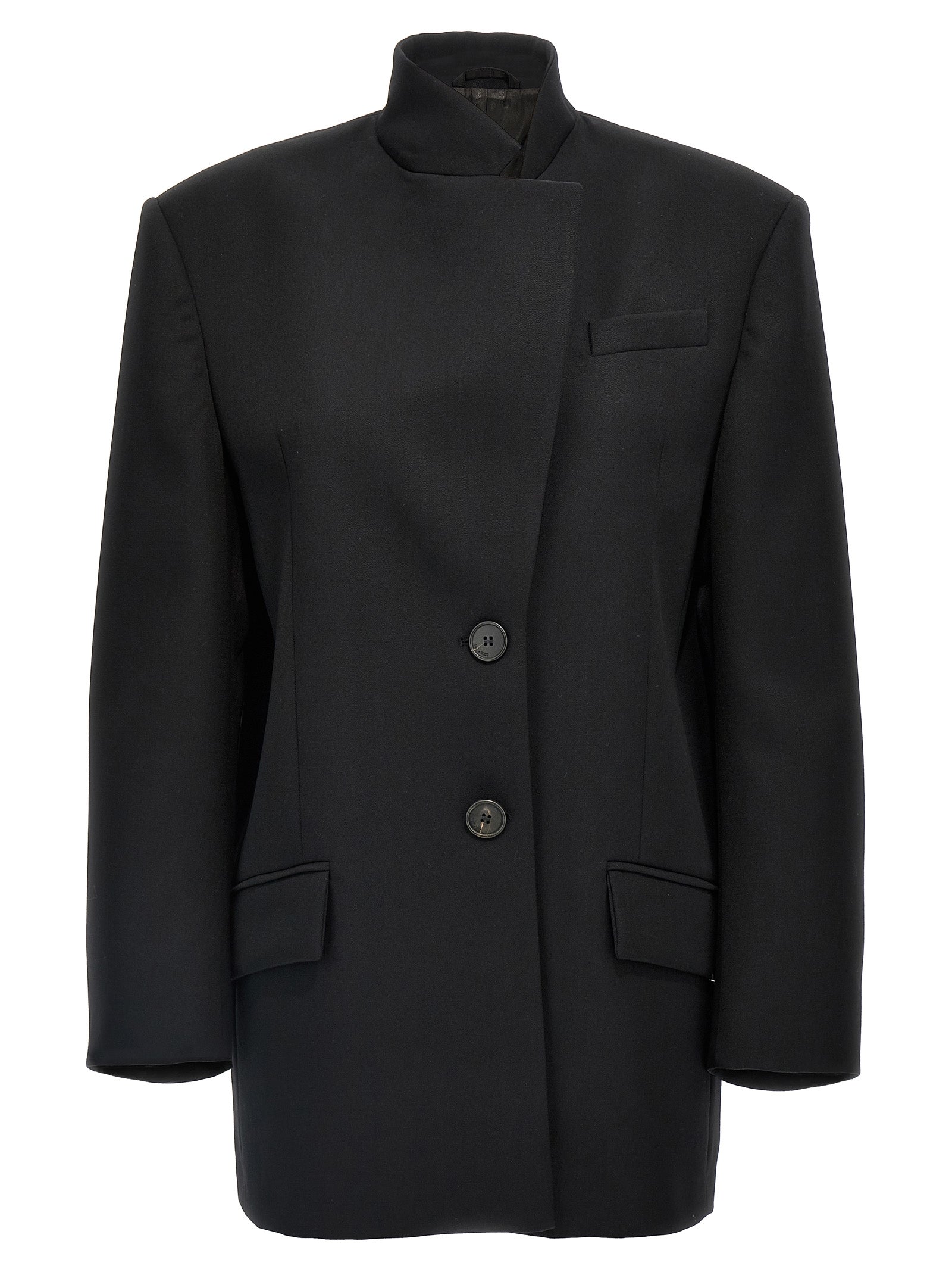 Wool gabardine blazer jacket, masculine cut, high neck, asymmetric button closure, pockets, long sleeves, padded shoulders, side slits.