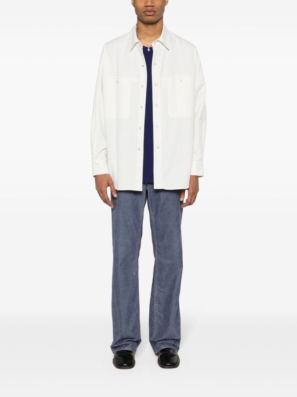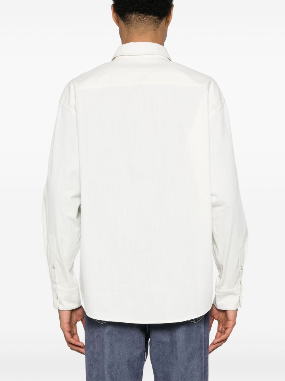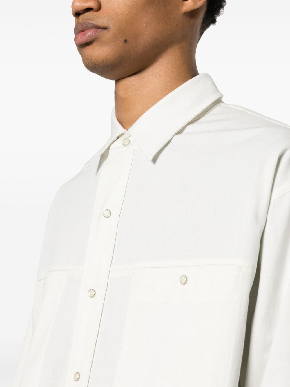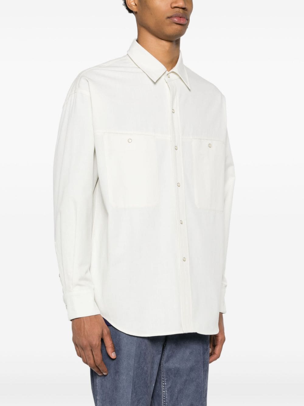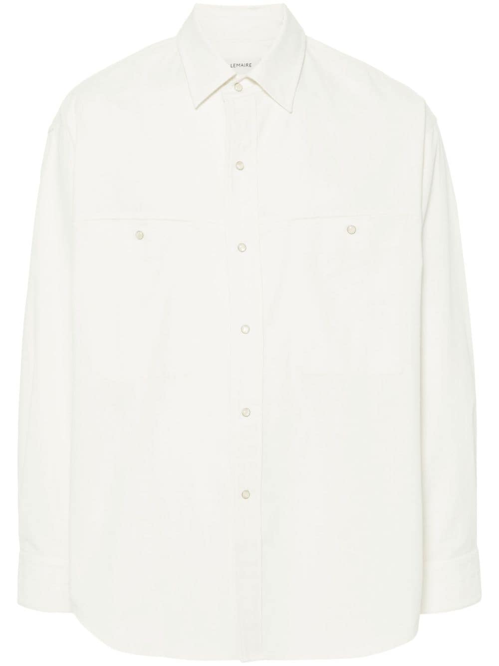 chalk white cotton twill weave pleat detailing to the sleeves classic collar drop shoulder long sleeves buttoned cuffs two chest patch pockets front button fastening curved hem unlined