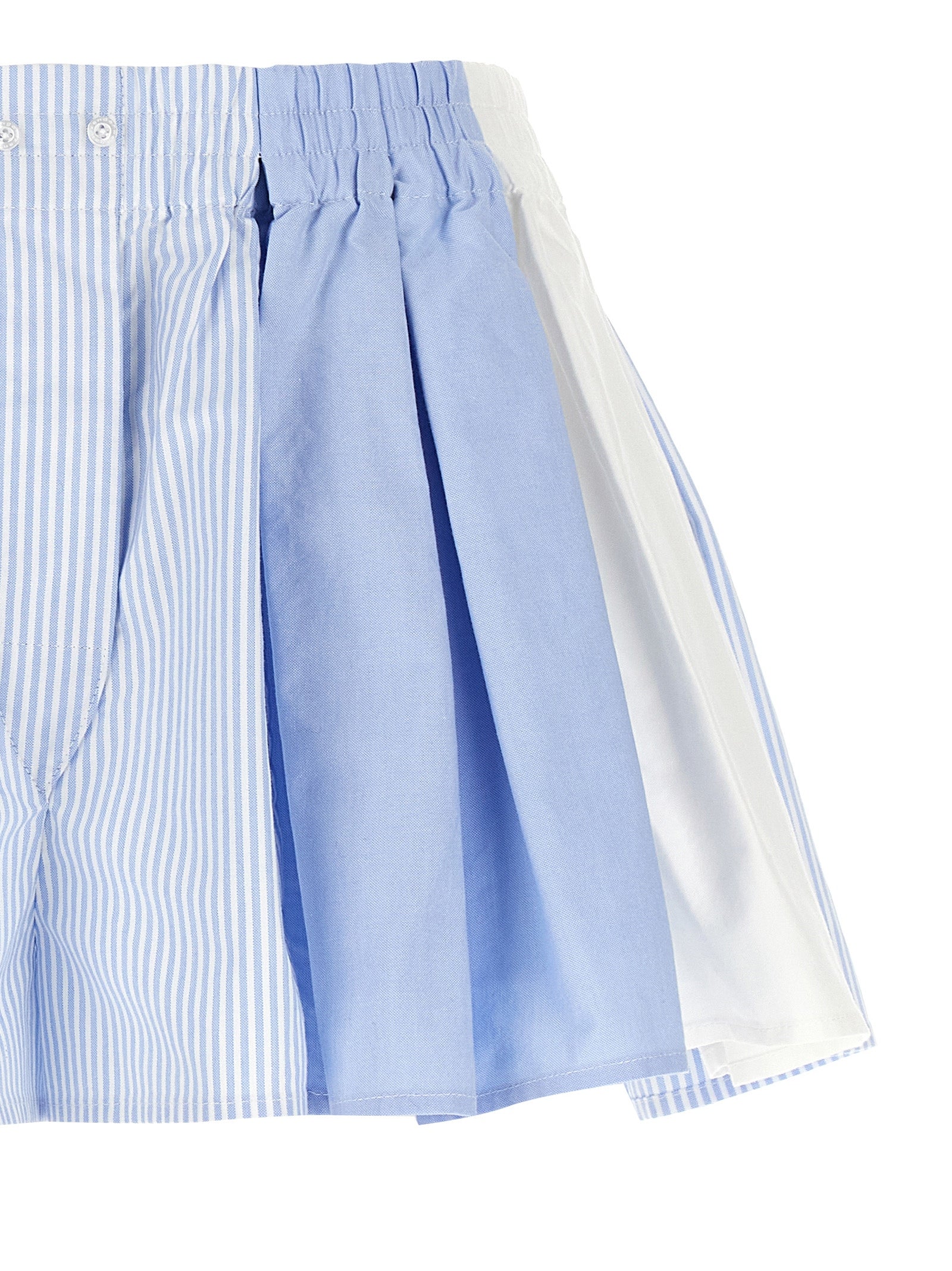 'Pleated Boxer' Oxford cotton shorts with pleated effect patchwork panels, elastic waistband, trompe l'oeil flap, wide leg.