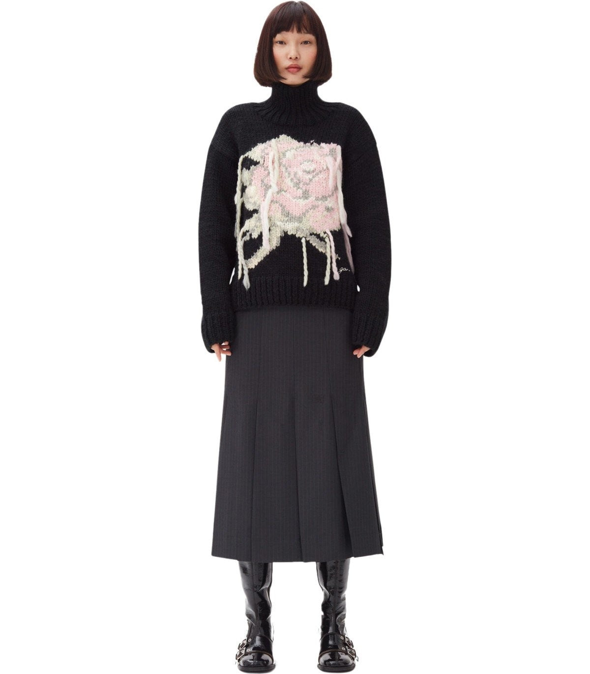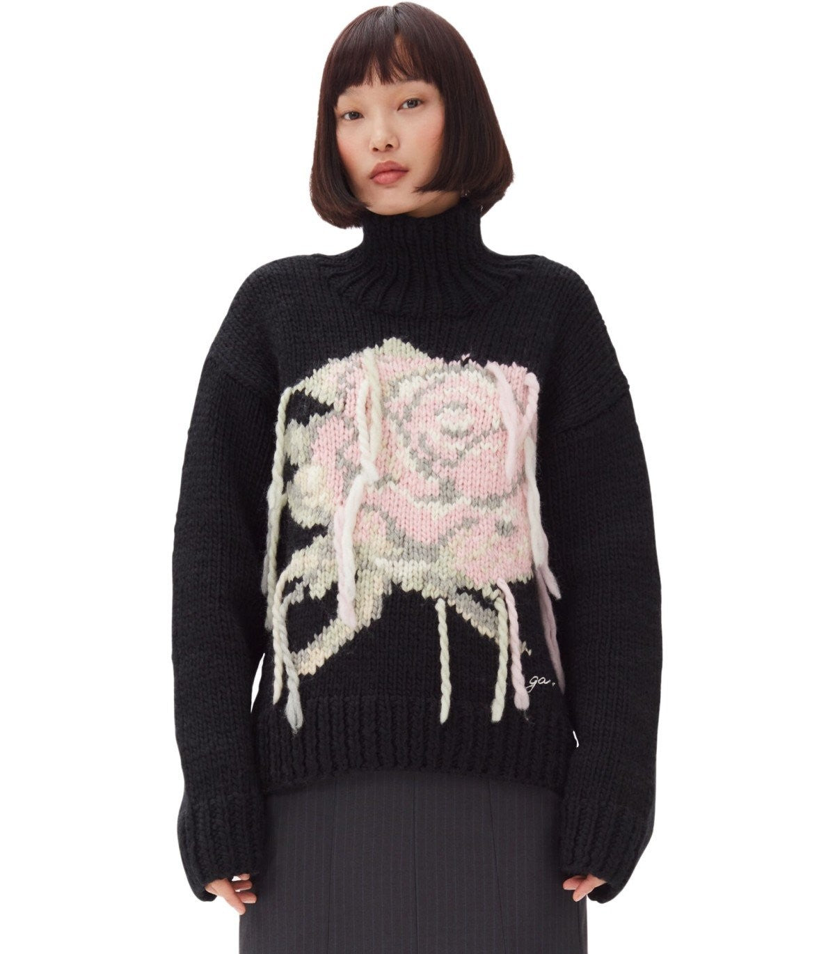 Ganni turtleneck made of wool, featuring a printed design of a sewn rose in black. Characterized by long sleeves, it has a high collar. At the bottom, it has an embroidered Ganni logo. Cuffs, collar, and hem finished with ribbing. Relaxed fit. The model is wearing a size S and is 176 cm tall. Composition: 100% wool.