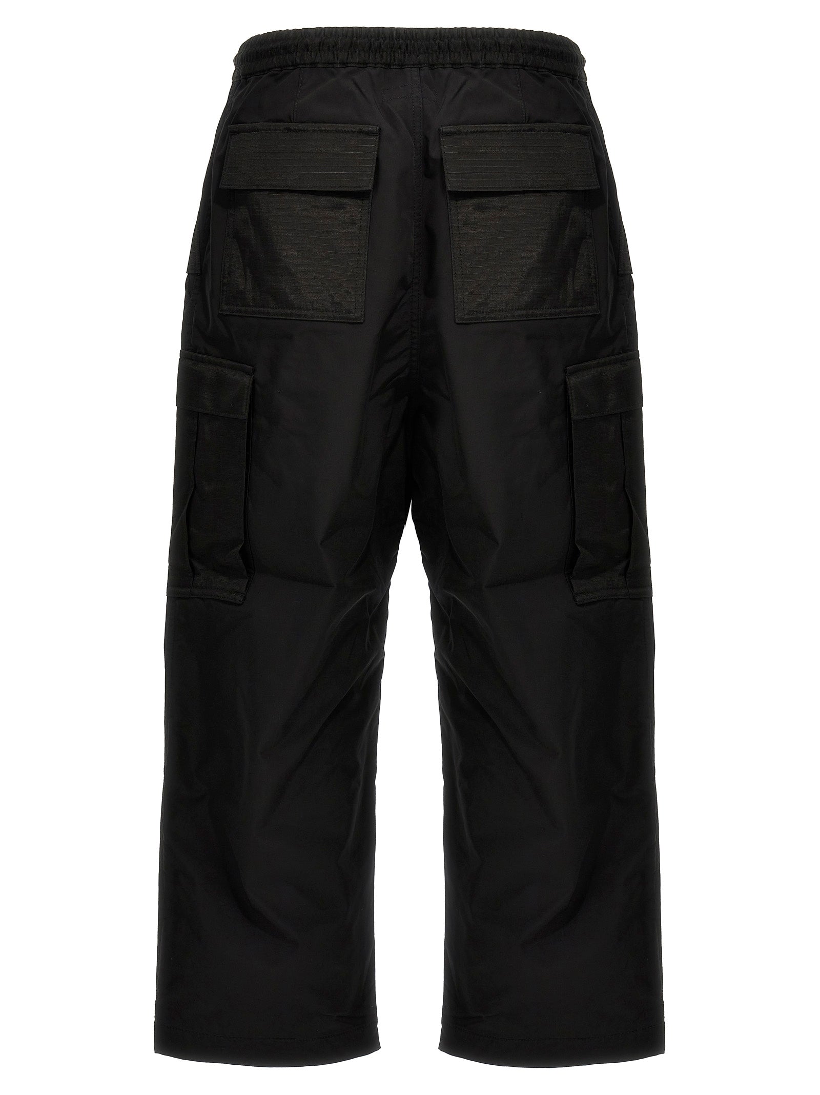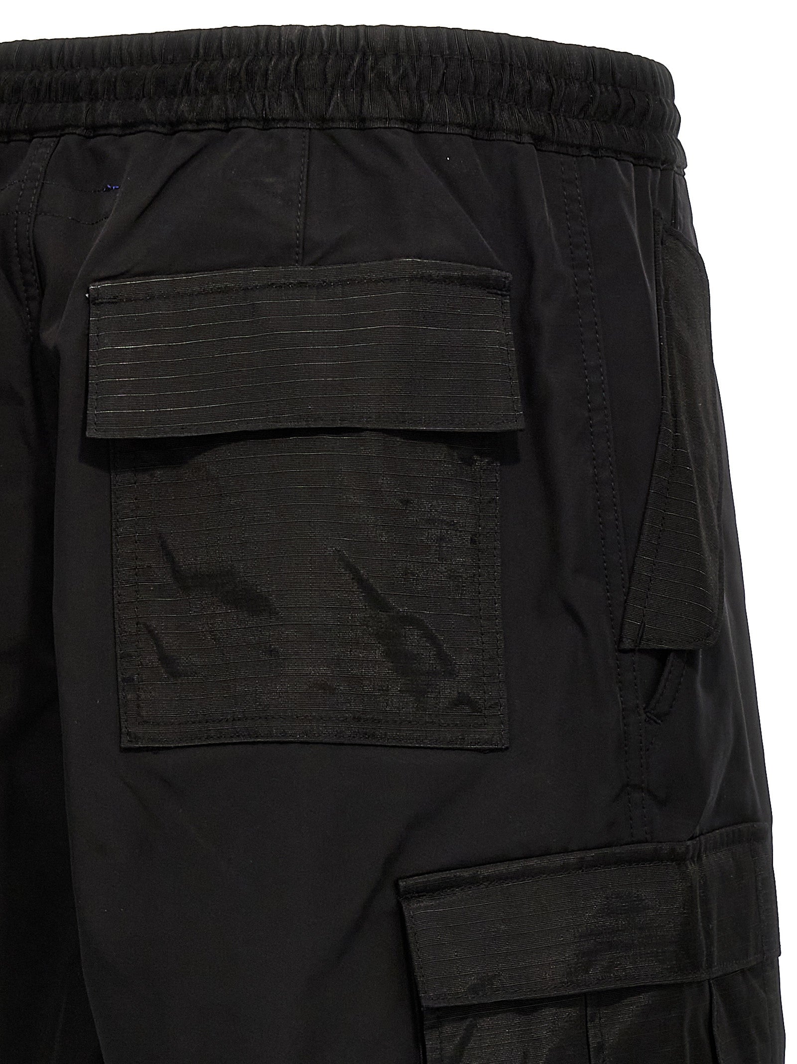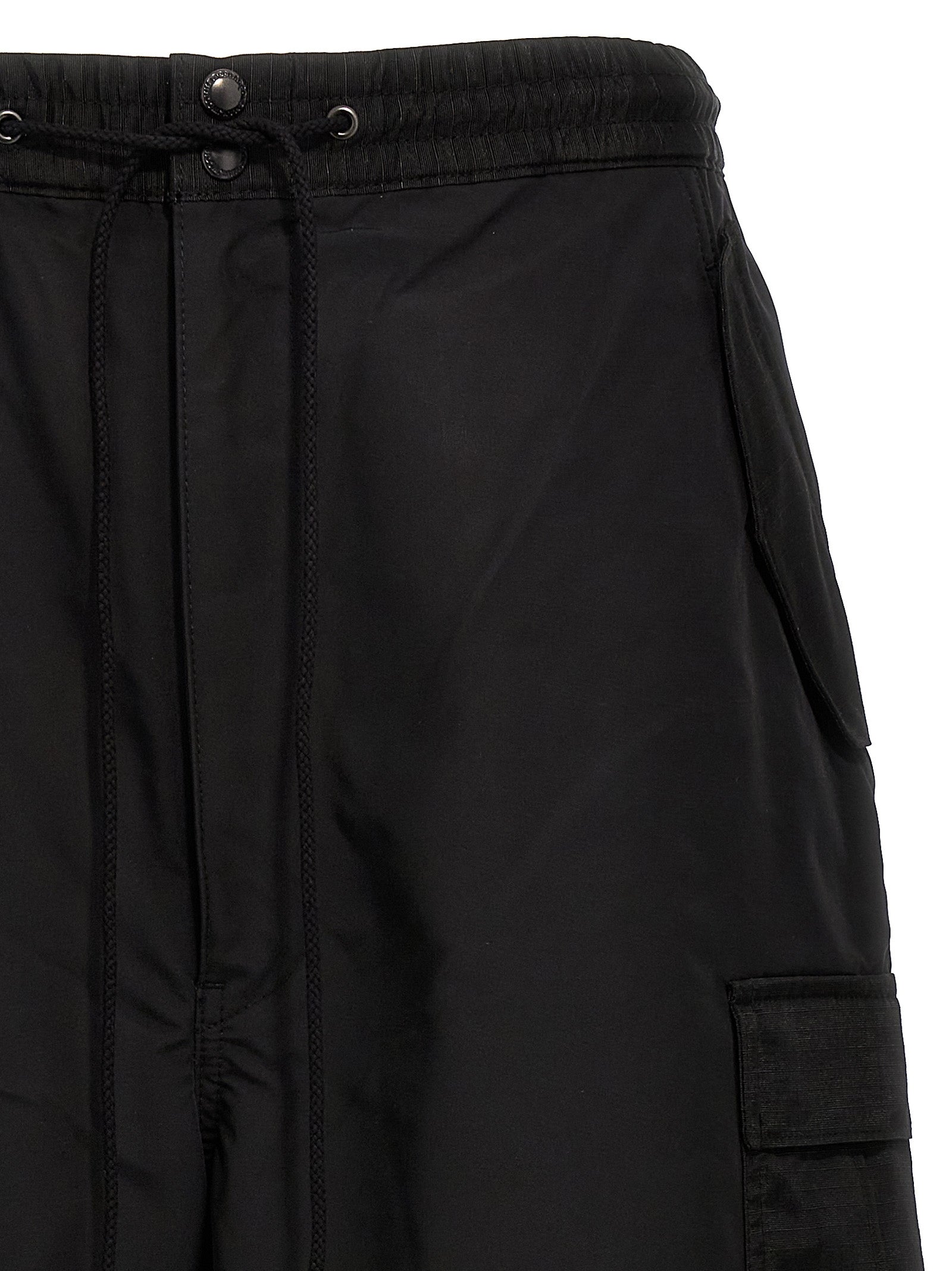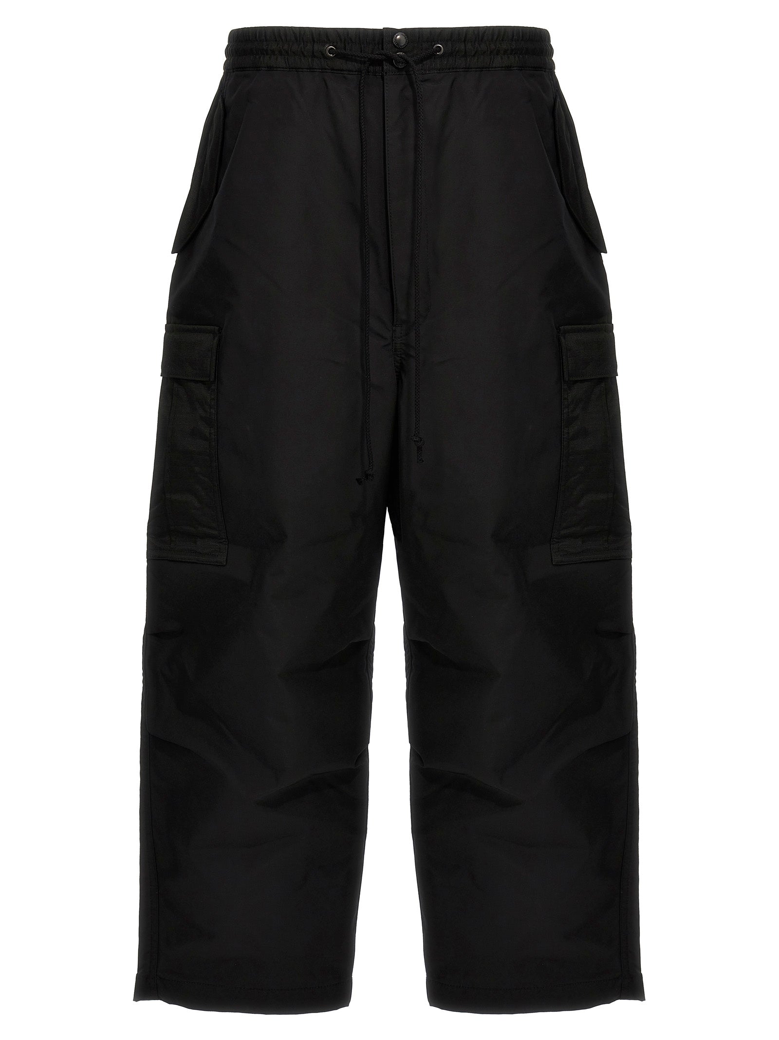 Cargo pants in ripstop nylon, elastic and drawstring at the waist, zip and button closure, pockets.