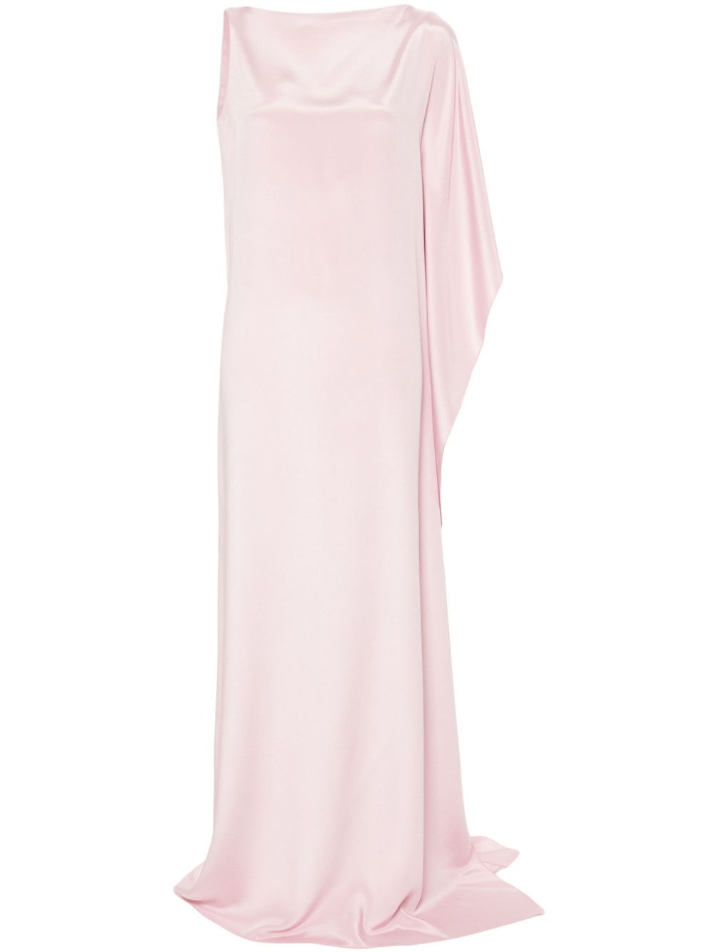 rose pink silk crepe de chine draped panel detail at the shoulder boat neck sleeveless side slit floor-length straight hem full lining concealed rear zip fastening