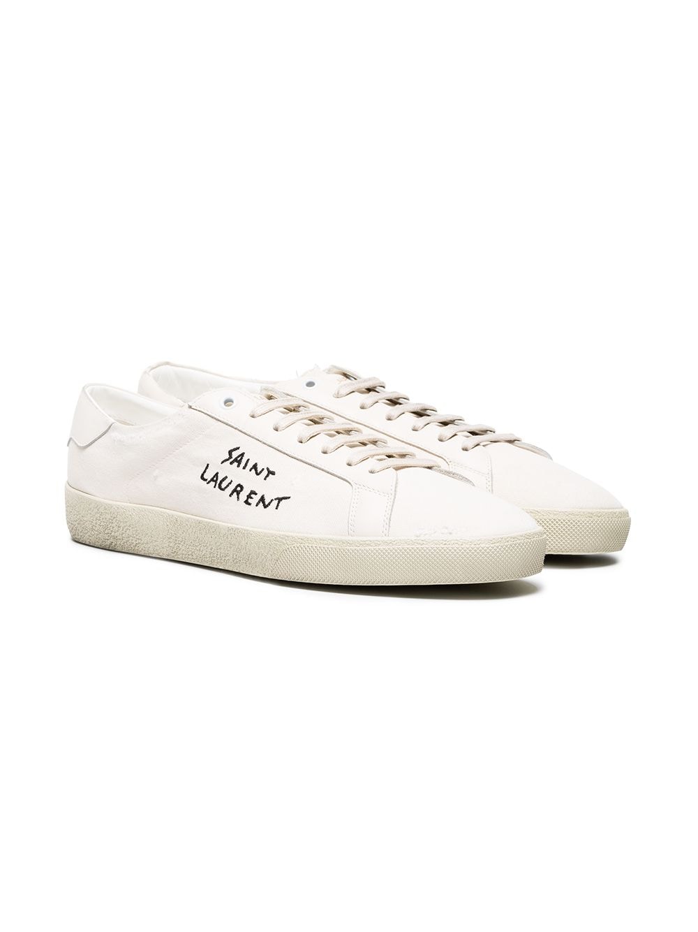 These white Saint Laurent Court Classic SL/06 Embroidered Canvas Sneakers are a pair we advise you wear on your trips to warmer climates, gents – for we wouldn't want to risk ruining our new trainers in the muddy and wet conditions of Britain. We know you like to keep yours looking box-fresh. Each pair are made in Italy with an off-white canvas upper and feature white leather heel tabs, black branding embroidered on the outside foot, distressed detailing, leather lining, tonal rubber soles and tonal lace-up fastening. You'll spot us sporting our Saint Laurent kicks with Off-White, Givenchy and Alexander McQueen.