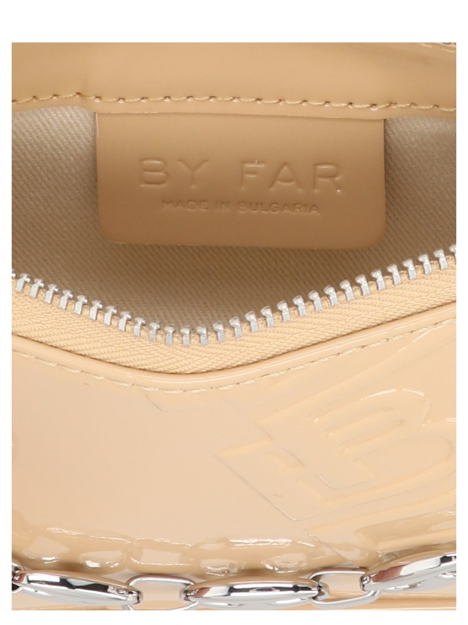 Mini Rachel' painted leather handbag with all-over embossed logo, zip closure, double removable handle in leather and crystals. JULIAN SUSTAINABLE: BY FAR is committed to preventing deforestation and degradation of the forest resources, associated with leather production practices, by not buying leather from cattle reared in the Amazon biome.
