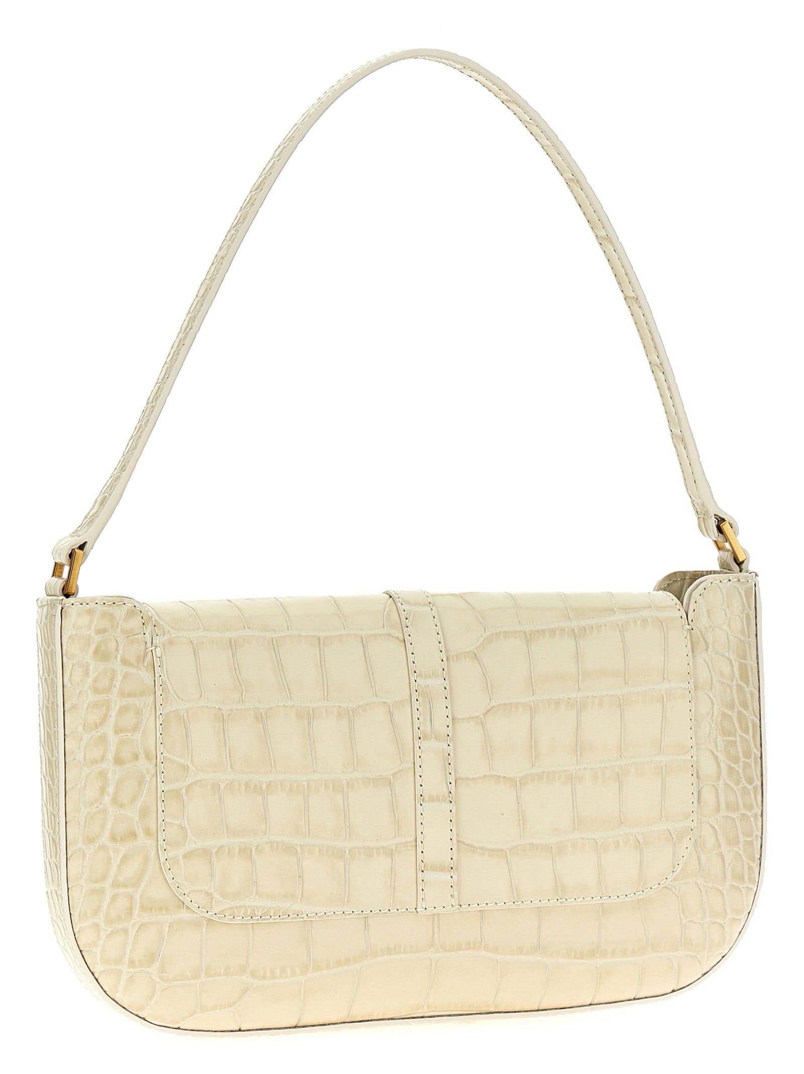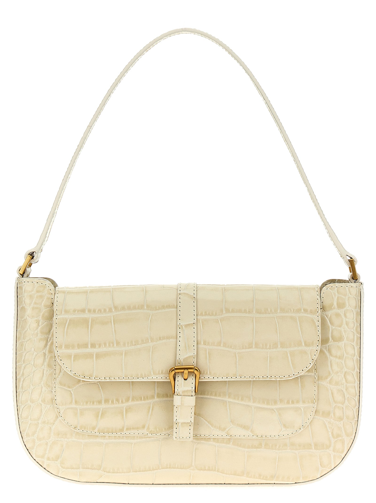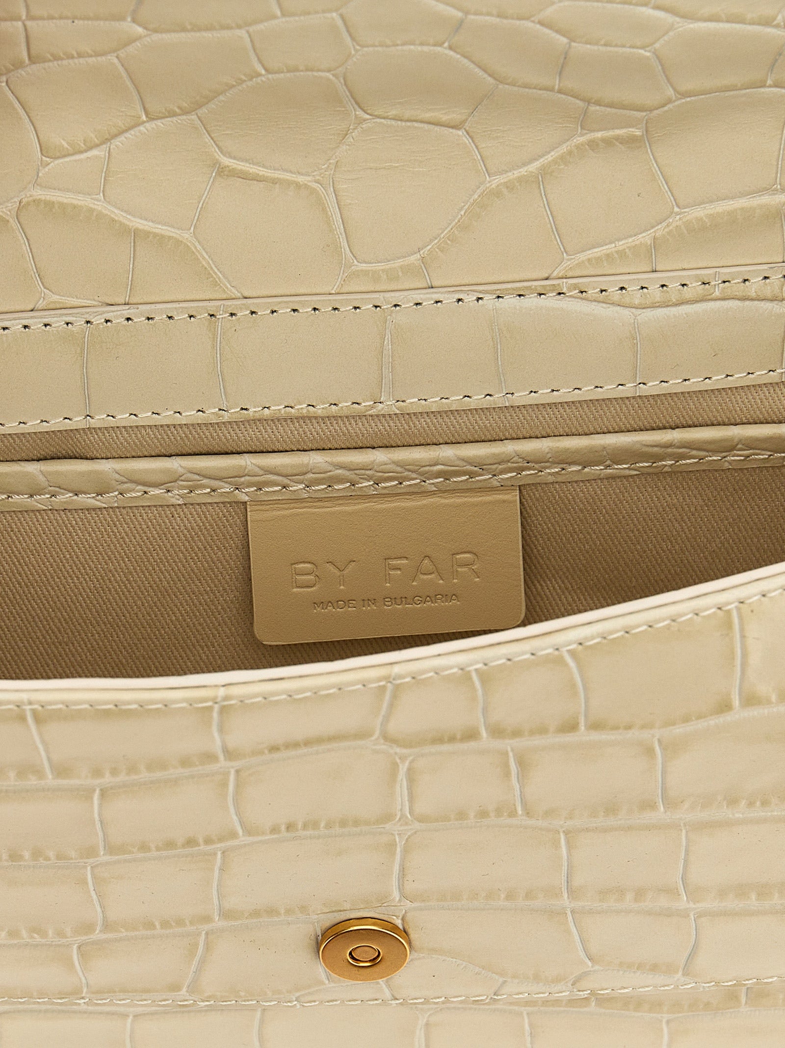 'Miranda' crocodile print leather shoulder bag with flap and buckle closure, gold hardware. SUSTAINABLE: BY FAR is committed to avoiding deforestation and forest degradation, associated with leather production practices, by not buying skin from cattle raised in the Amazon biome.