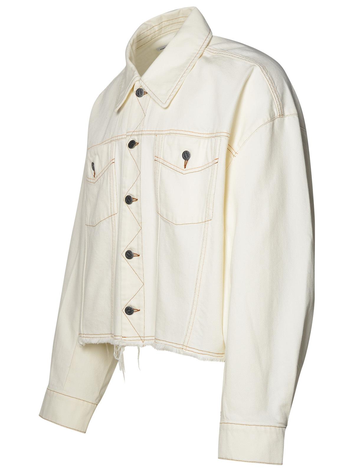 Cotton denim jacket with pointed collar, button closure, button patch pockets on the chest, button cuffs, frayed hem