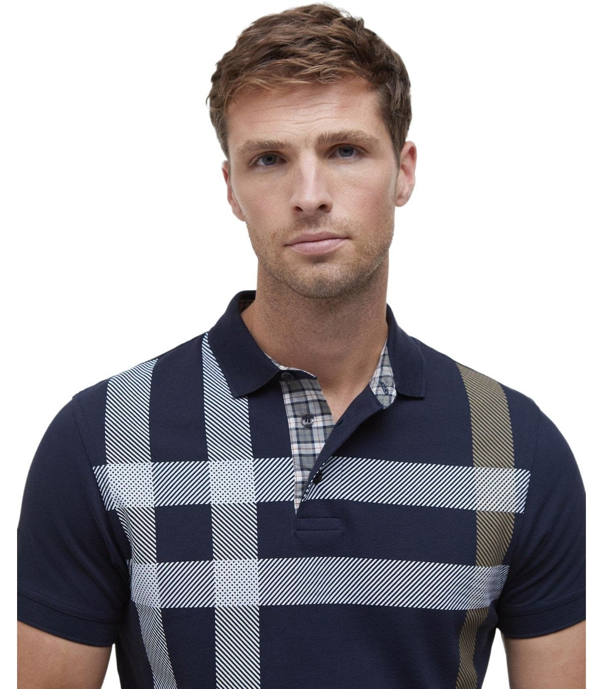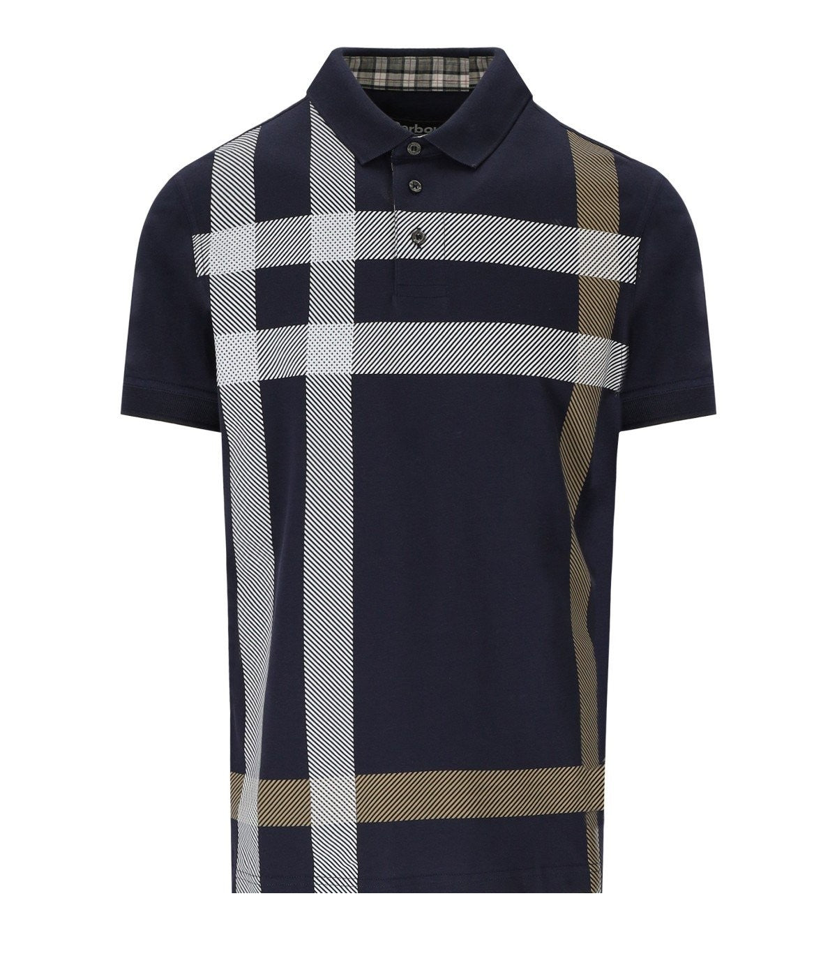 Barbour Blaine poloshirt made of cotton decorated with a Scottish pattern on the front in shades of navy blue and green. Characterized by a classic collar, it features a two-button placket. Finished with openings at the hem, ribbed detailing on the collar and sleeve cuffs. Enhanced with tartan lining inside the placket and collar. Regular fit. Composition: 100% cotton. Decoration: 95% cotton, 5% elastane.