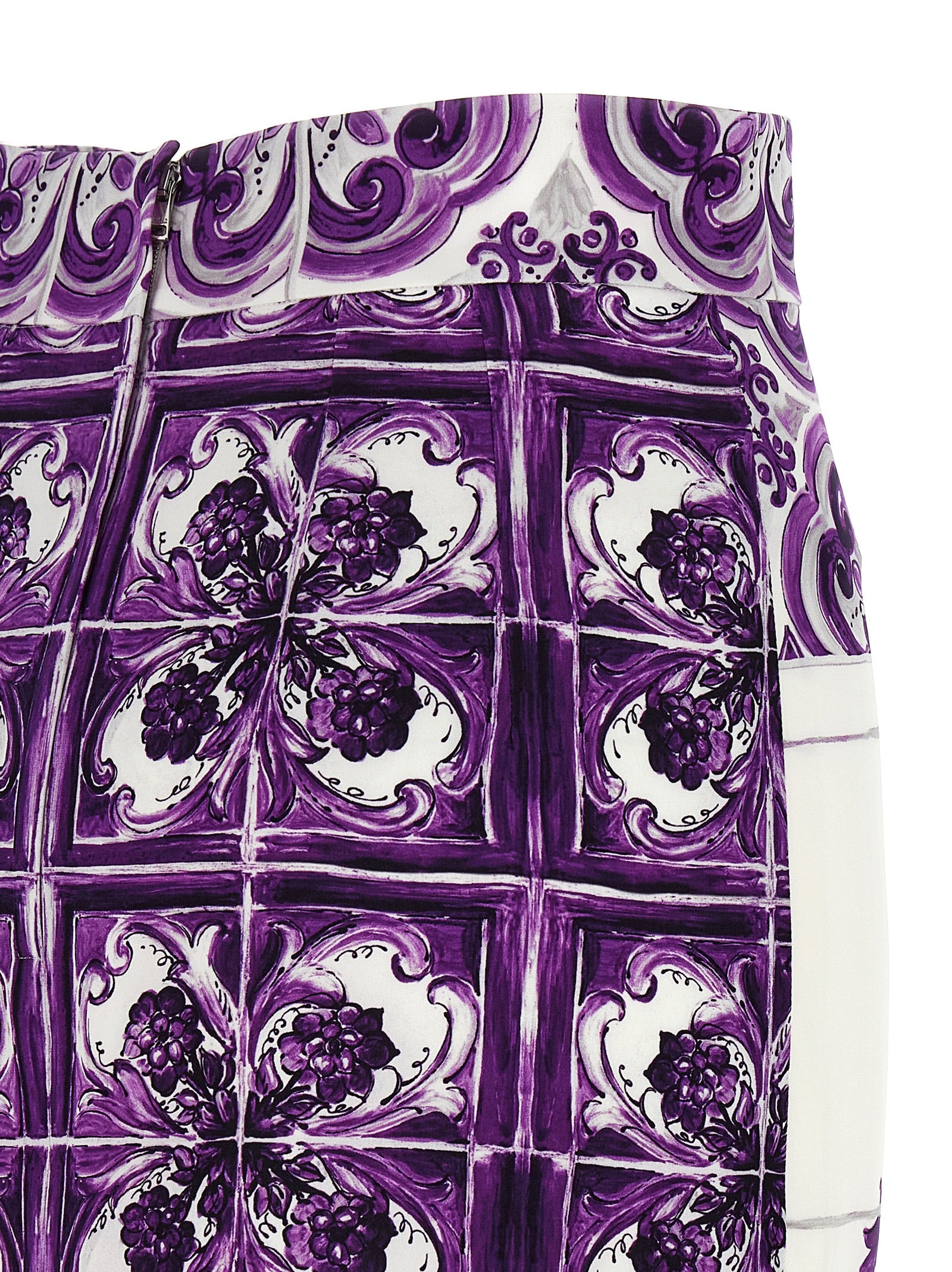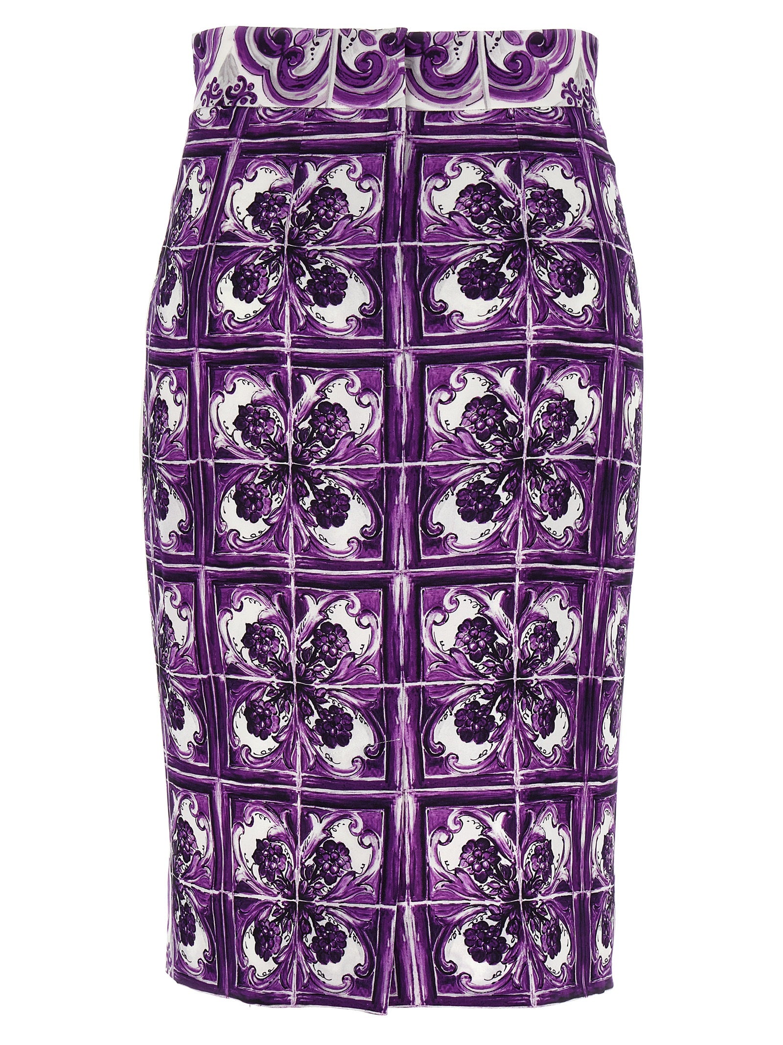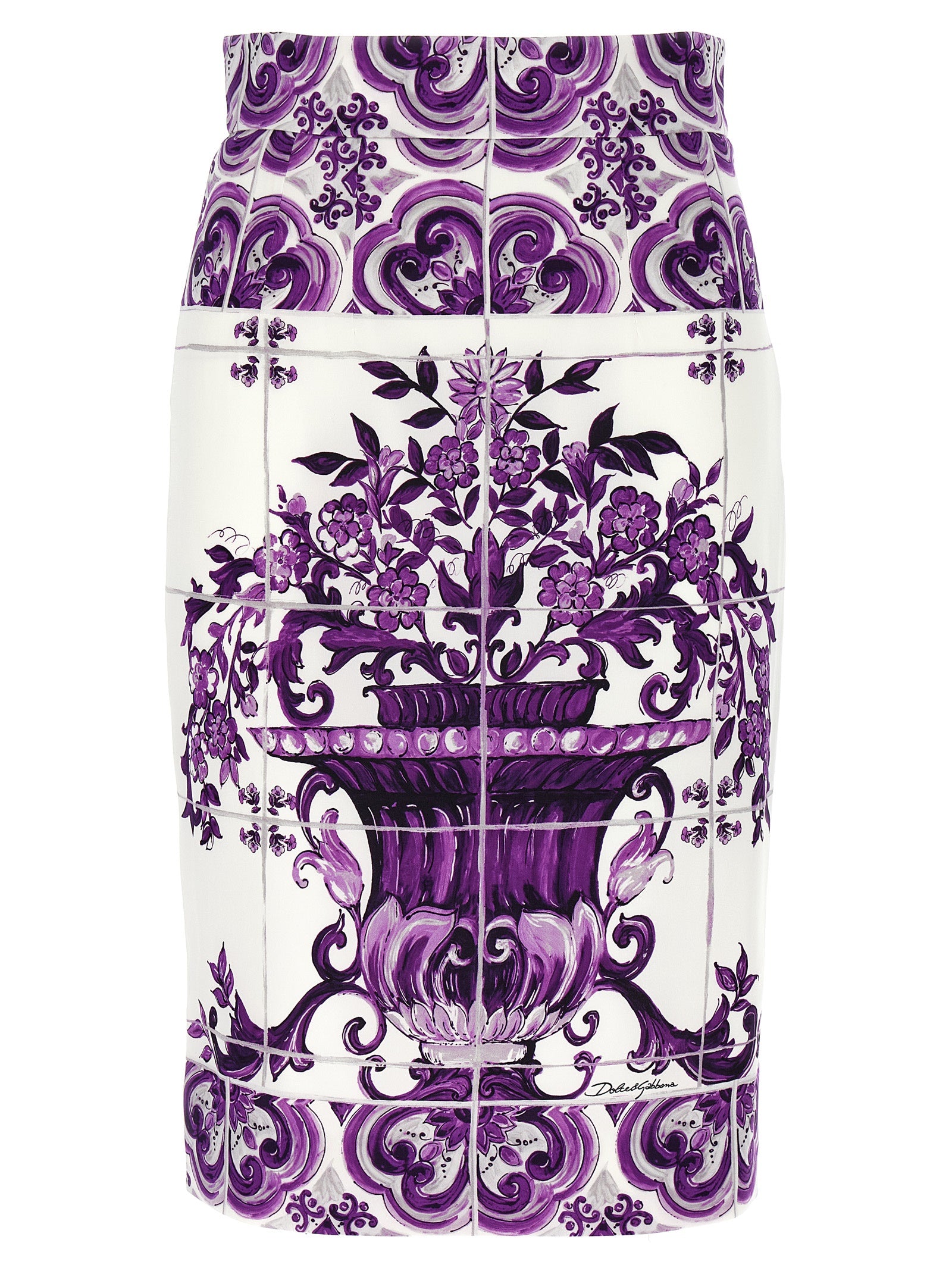 Midi skirt in silk with all-over 'Maiolica' print, longuette model, zip and back split closure, solid silk lining. The differences in print placement you might find on this product is a characteristic of Dolce&Gabbana's Handmade products. A peculiarity that makes each garment or accessory unique and exclusive.