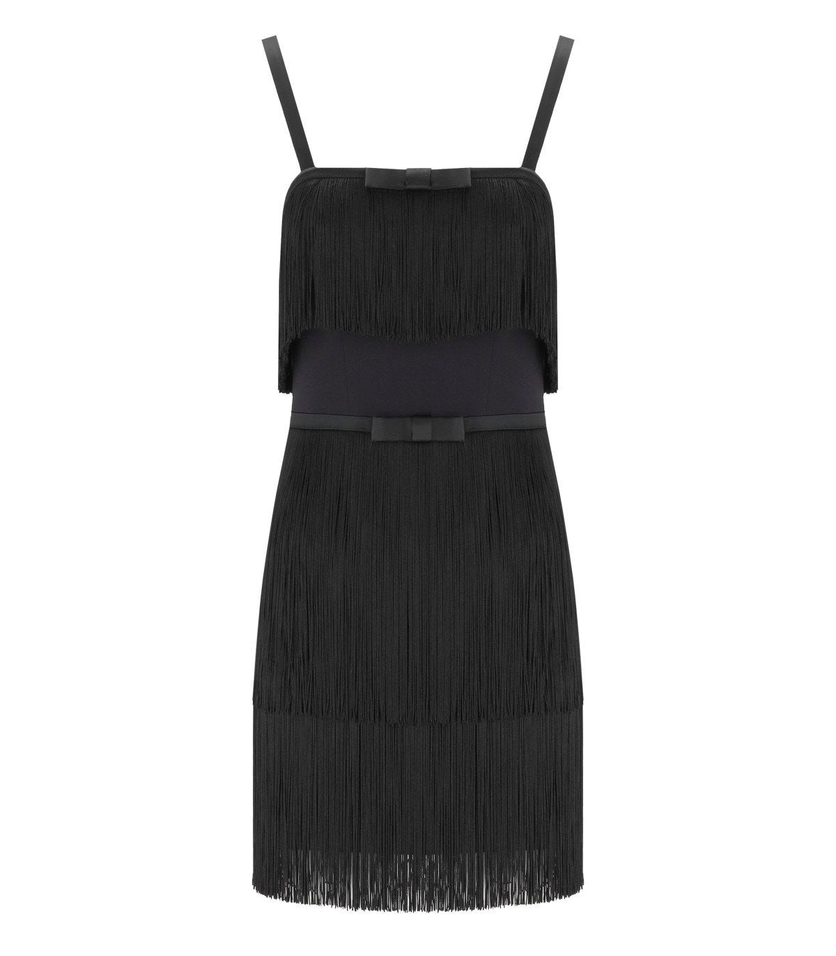 Elisabetta Franchi dress made of black stretch crêpe, with fringed and satin bow appliques. Square neckline, adjustable straps with logo detail. Zip closure at the back. Slim fit. The model is 177 cm tall and wears a size 40IT. Composition: 95% polyester, 5% elastane.