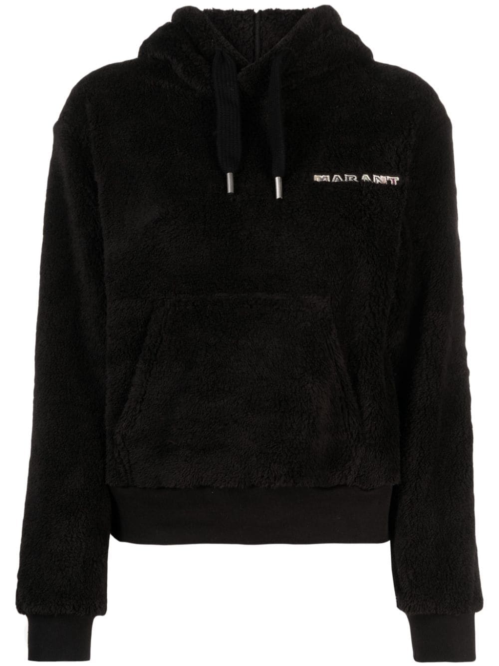 black fleece texture embroidered logo at the chest and rear drawstring hood drop shoulder long sleeves front pouch pocket ribbed cuffs and hem