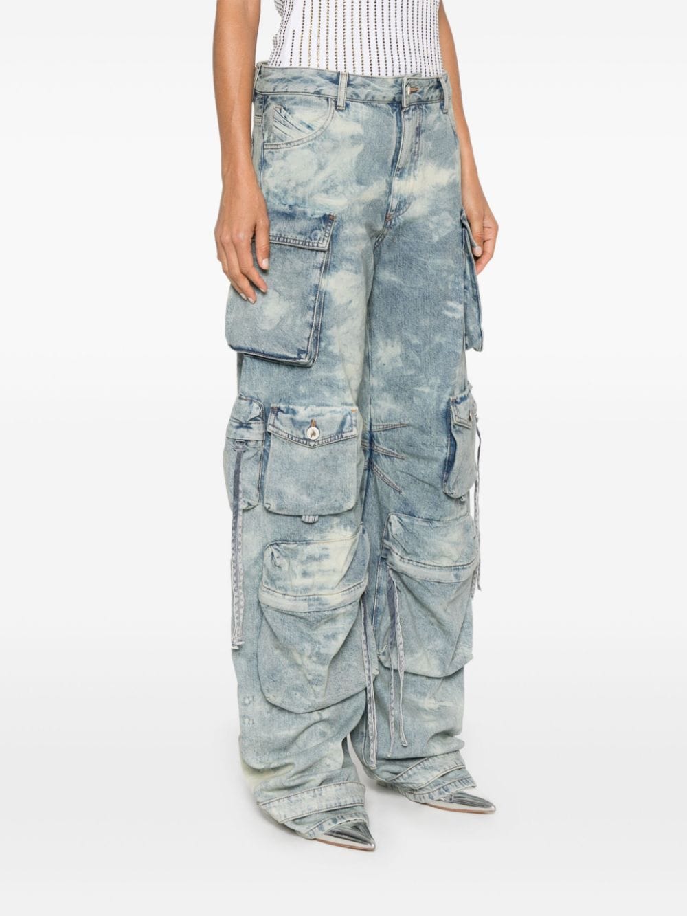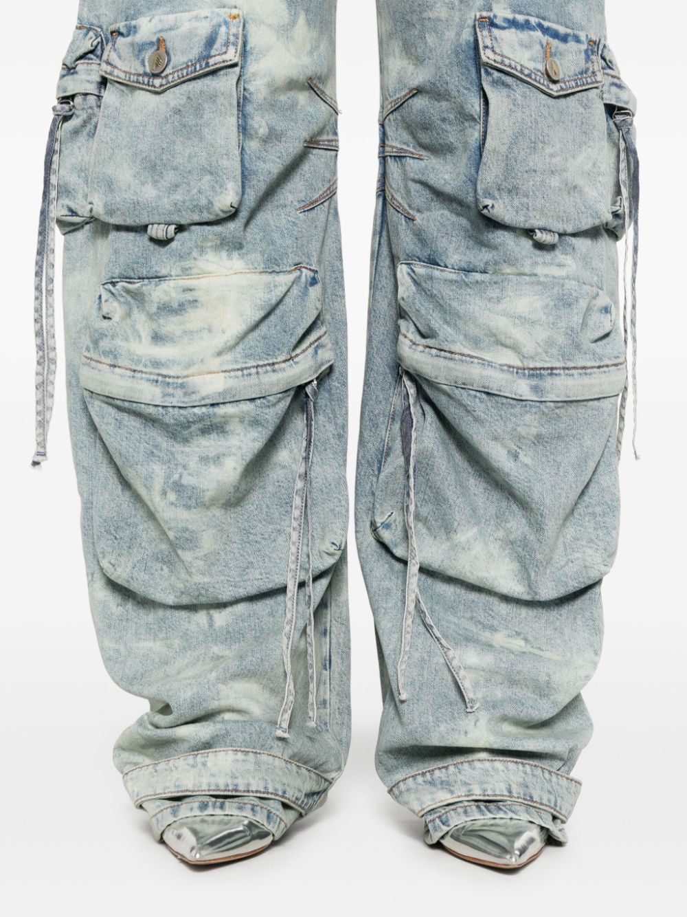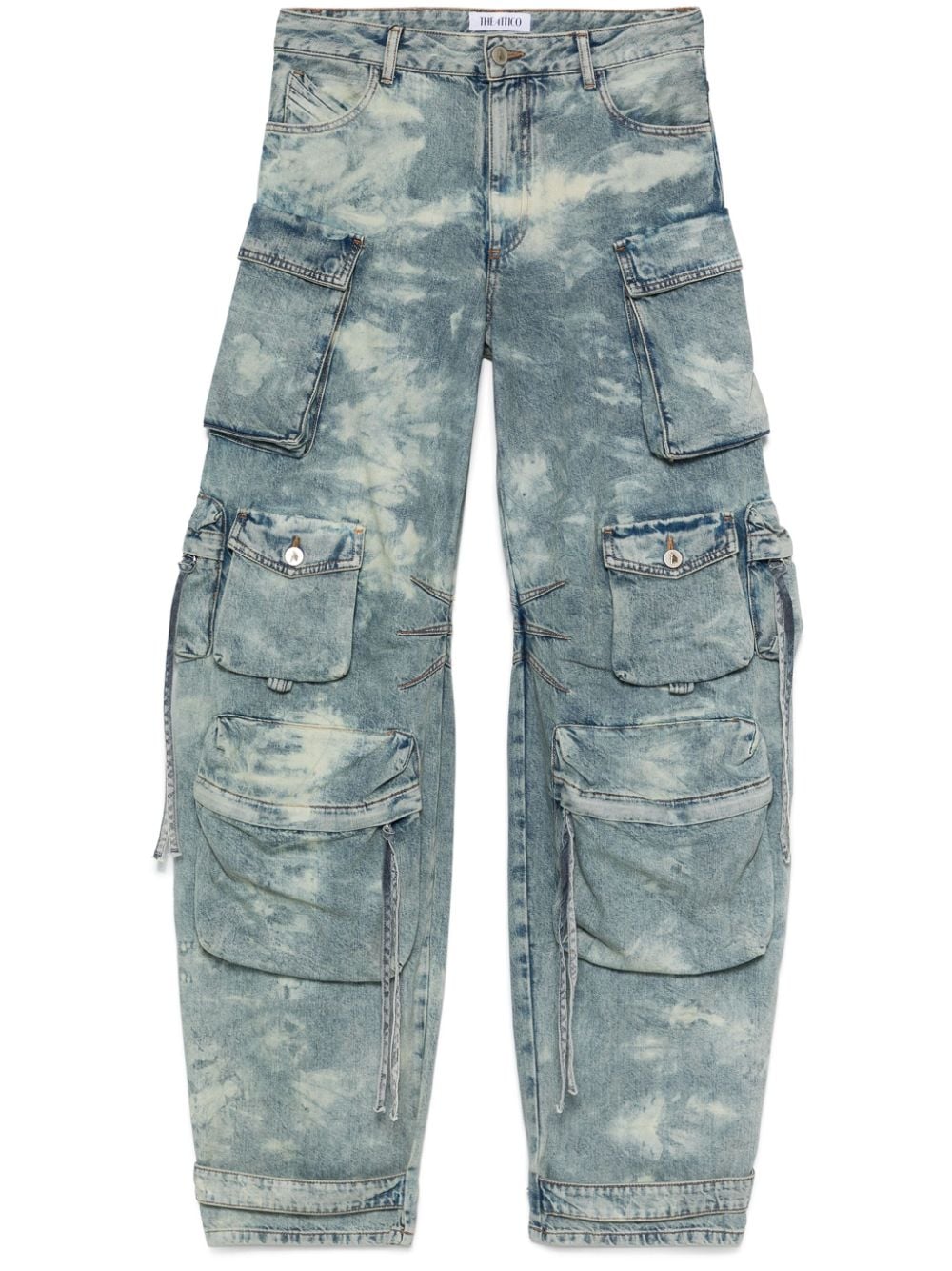 indigo blue cotton washed denim logo-embossed buttons logo patch to the rear tapered wide leg mid-rise concealed fly and button fastening belt loops classic five pockets multiple cargo pockets strap and press-stud fastening ankles straight hem