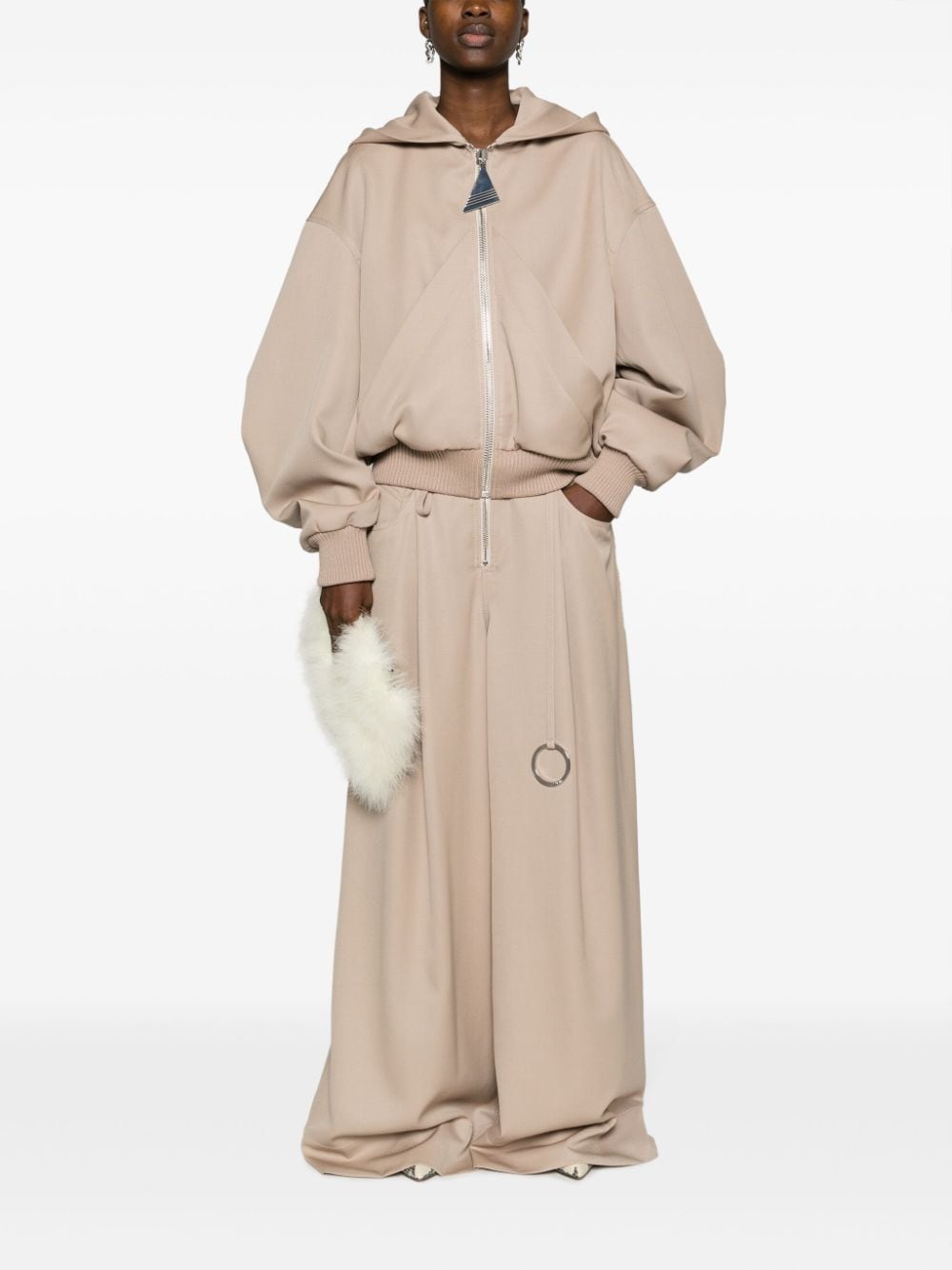 beige virgin wool gabardine weave pleat detailing tonal stitching branded zip puller internal logo patch slouchy hood front zip fastening drop shoulder long puff sleeves two front pouch pockets ribbed cuffs and hem logo-jacquard lining