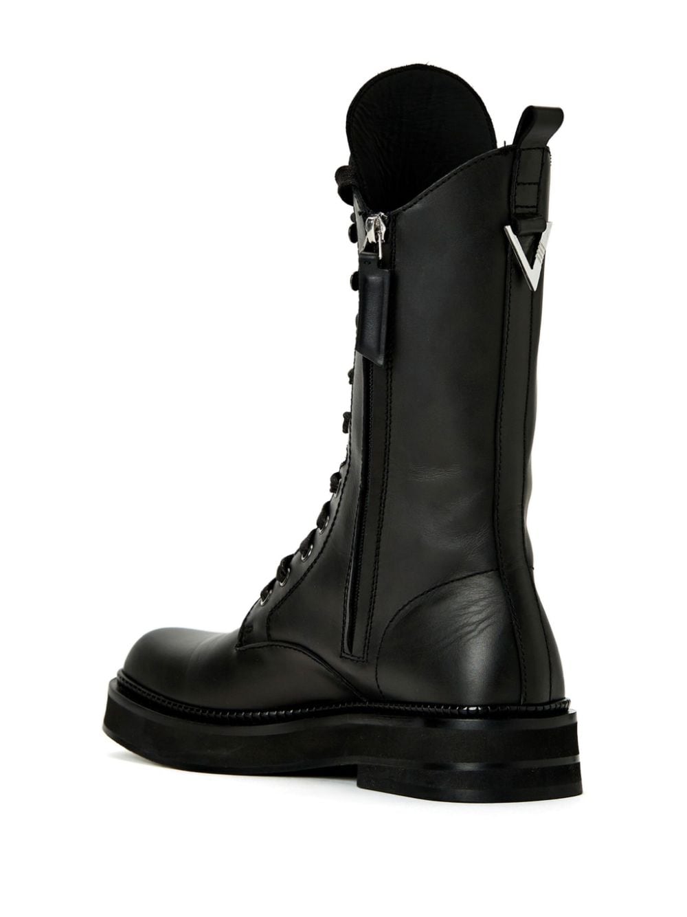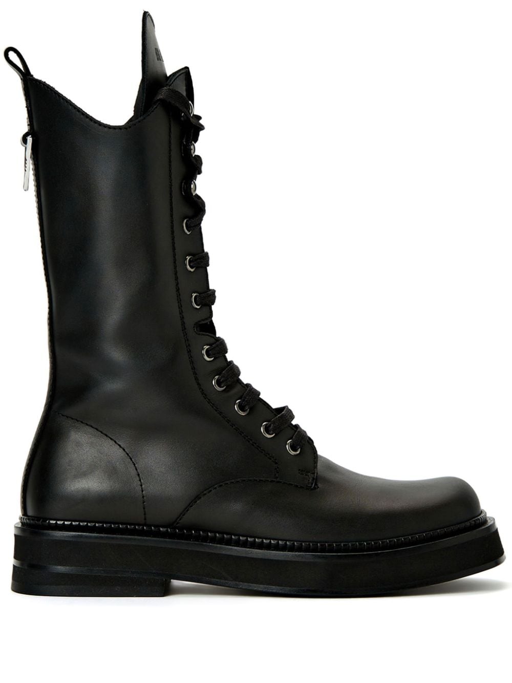 black calf leather matte effect charm detail logo-debossed tongue pull-tab at the heel square toe mid-calf length front lace-up fastening side zip fastening branded leather insole leather outsole stacked heel