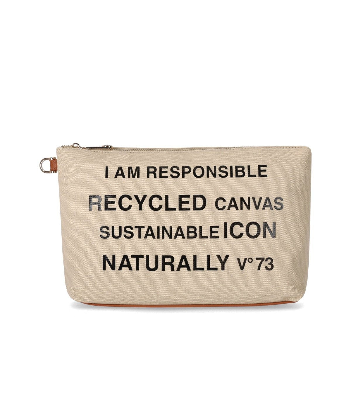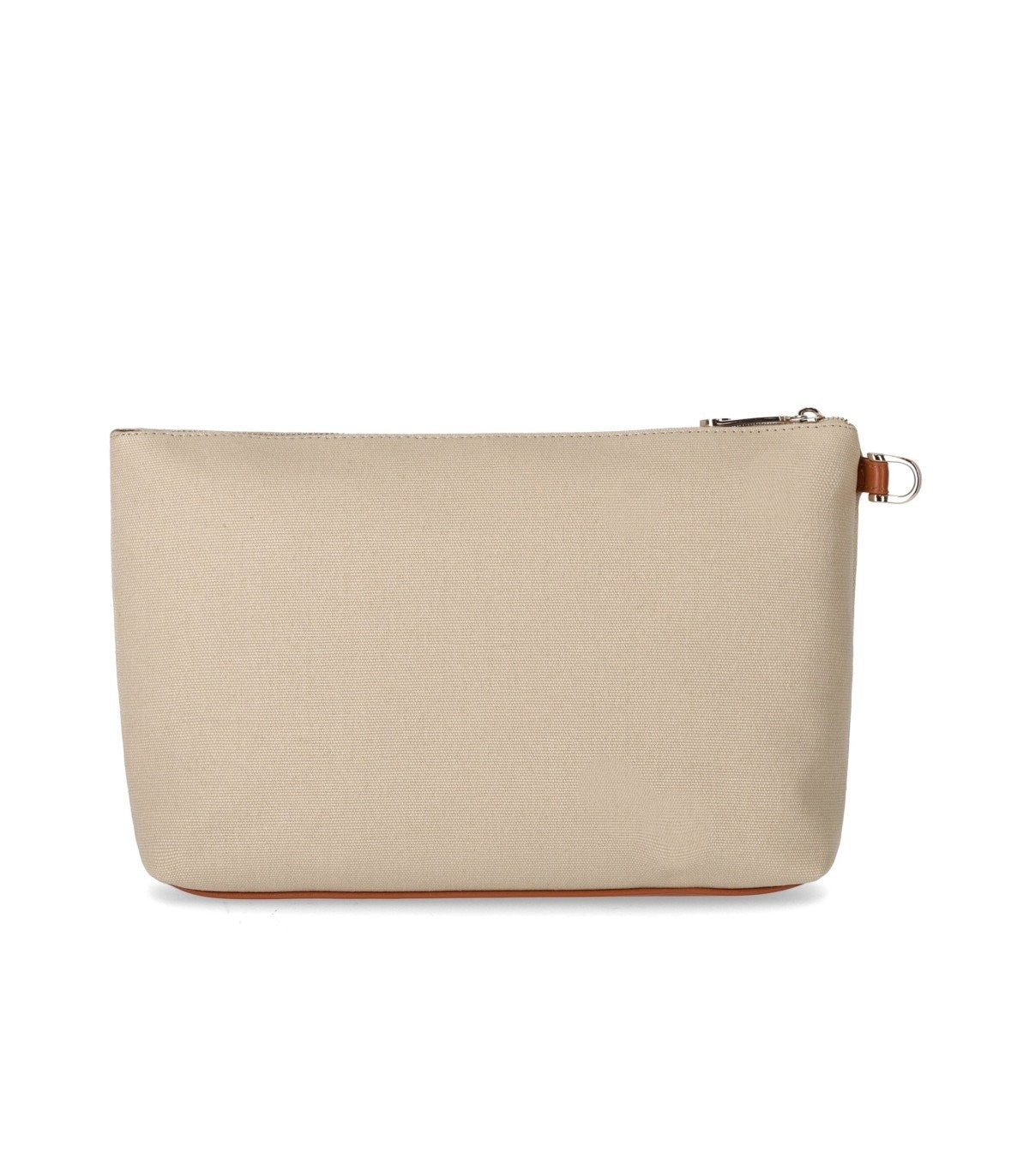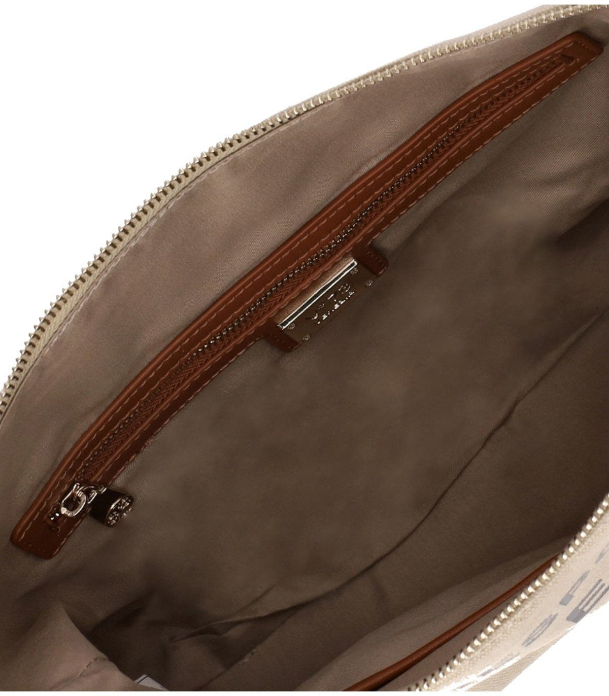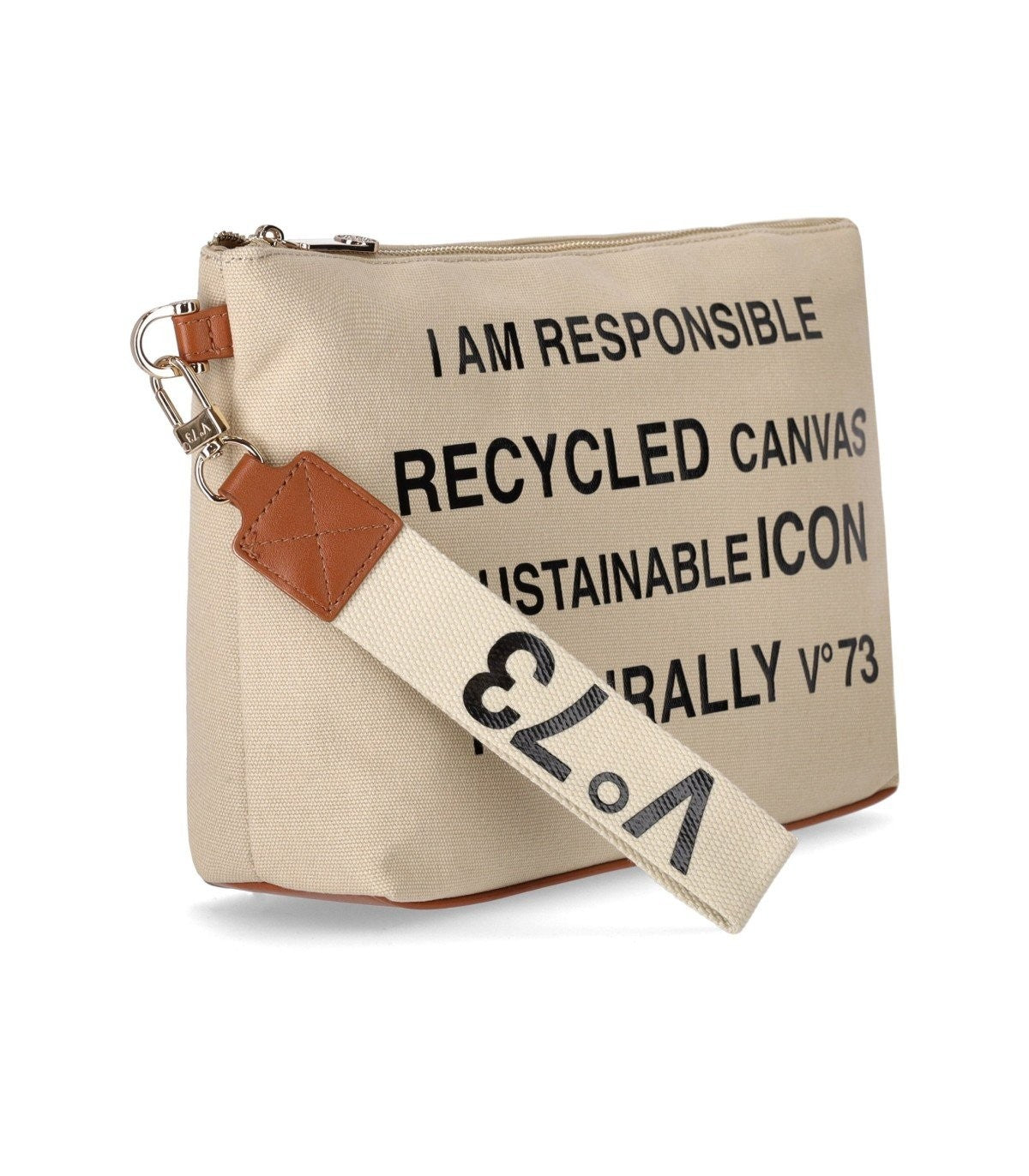 V73 handbag made of mixed cotton in natural tones. Bottom in leather-like material in a brown color, interior equipped with a zip pocket and flat pockets, removable logo wrist strap. Zip closure, dimensions 30x20x9 cm. Composition: 90% cotton, 10% polyester. Lining: 100% polyester.