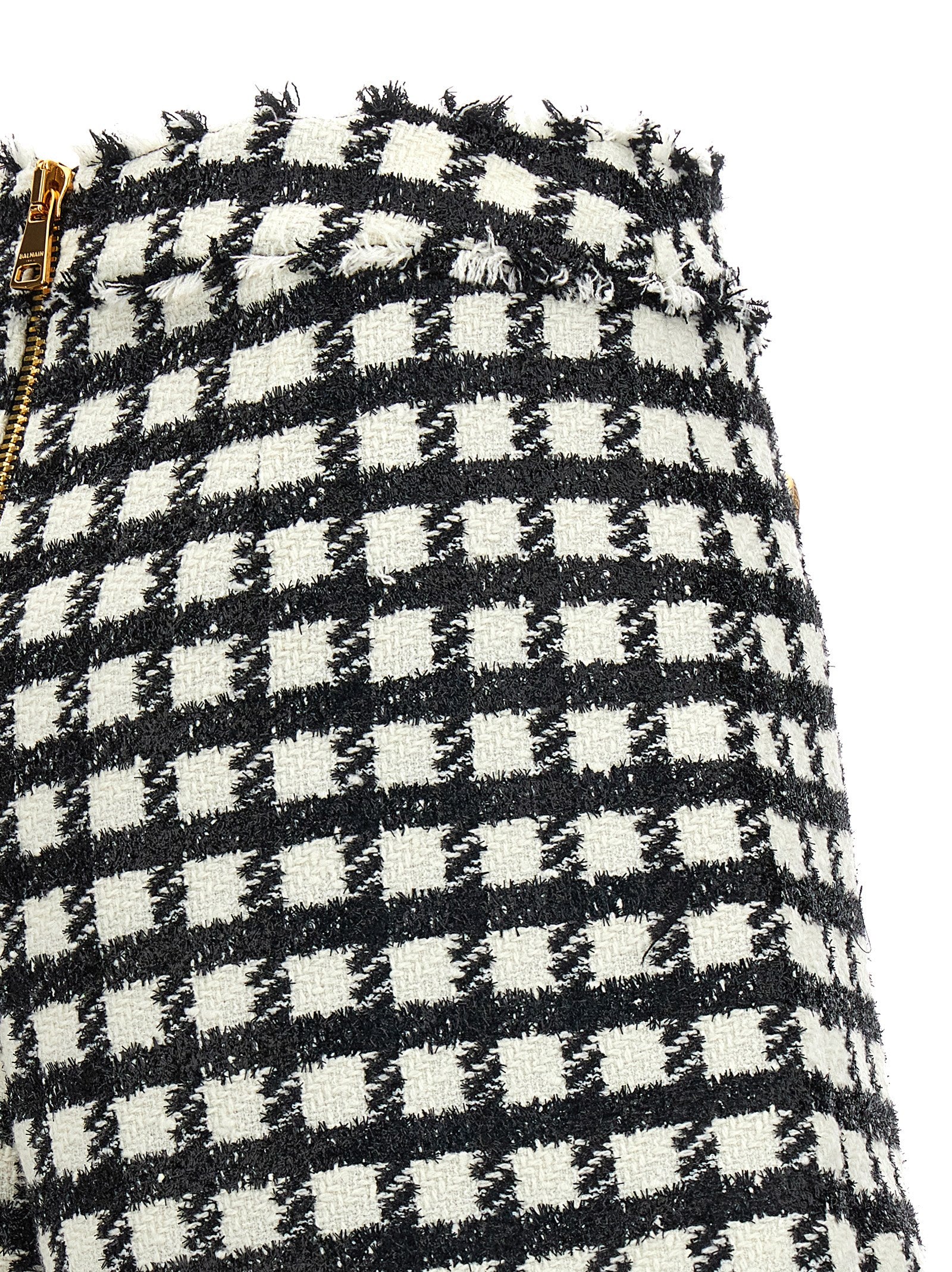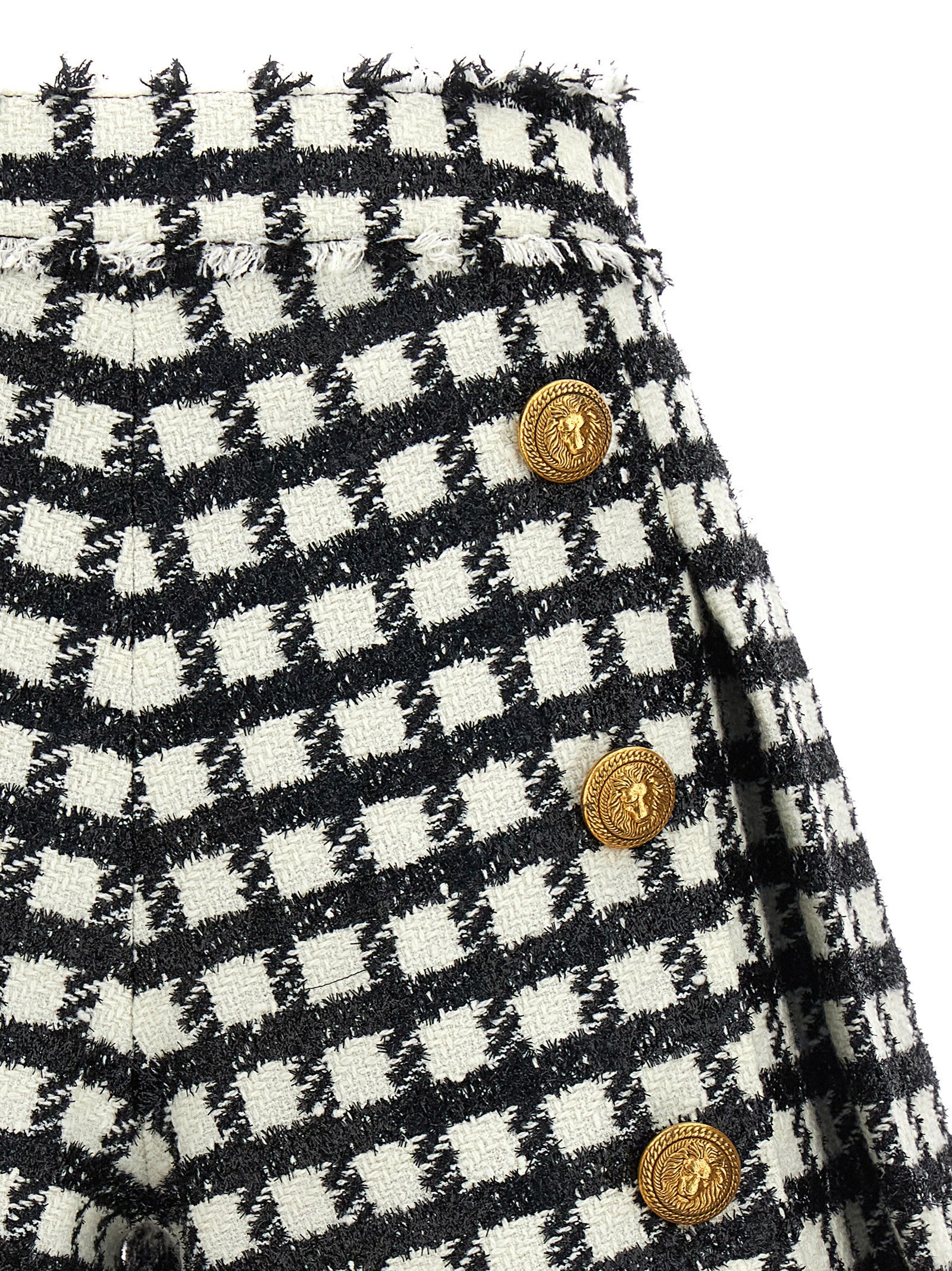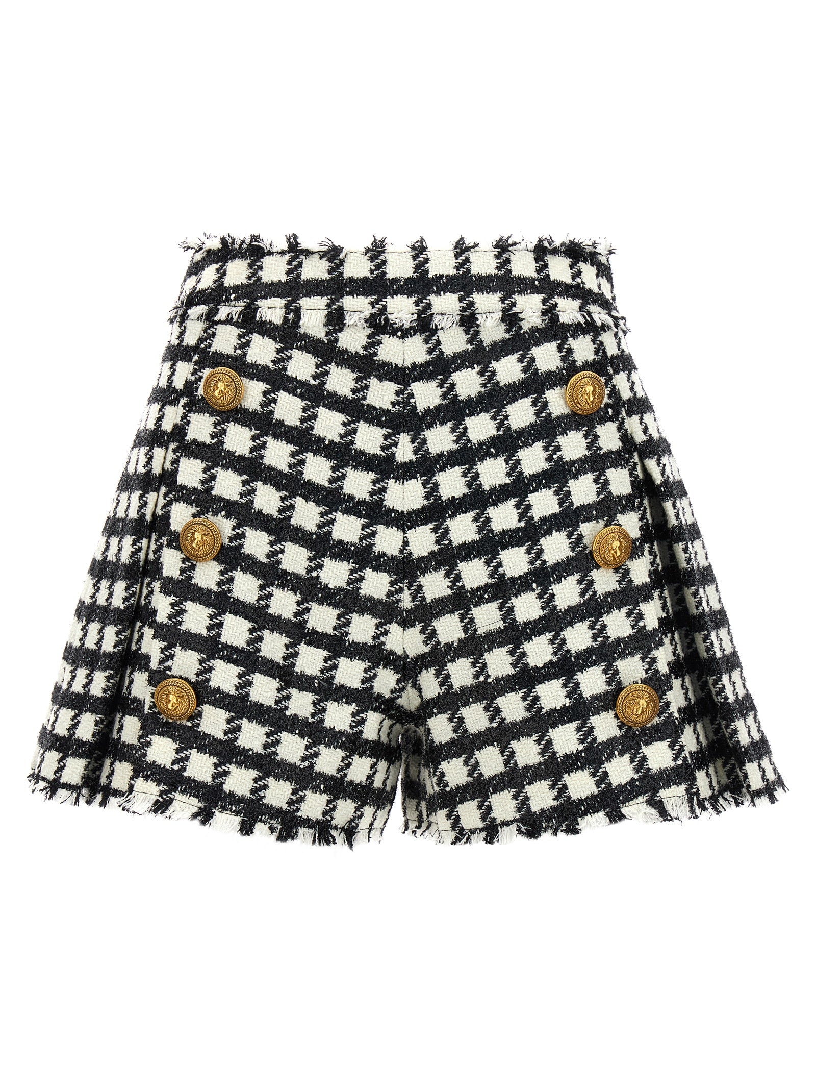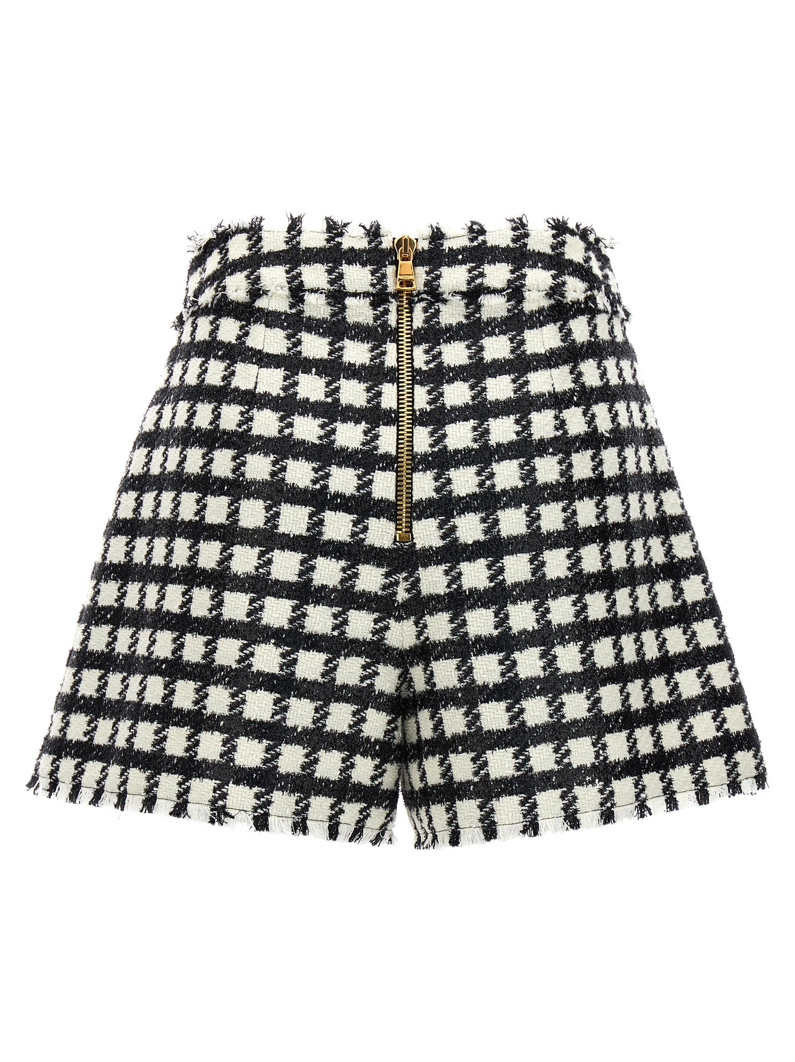 Tweed shorts with gold logo buttons at the front and a zip closure at the back.