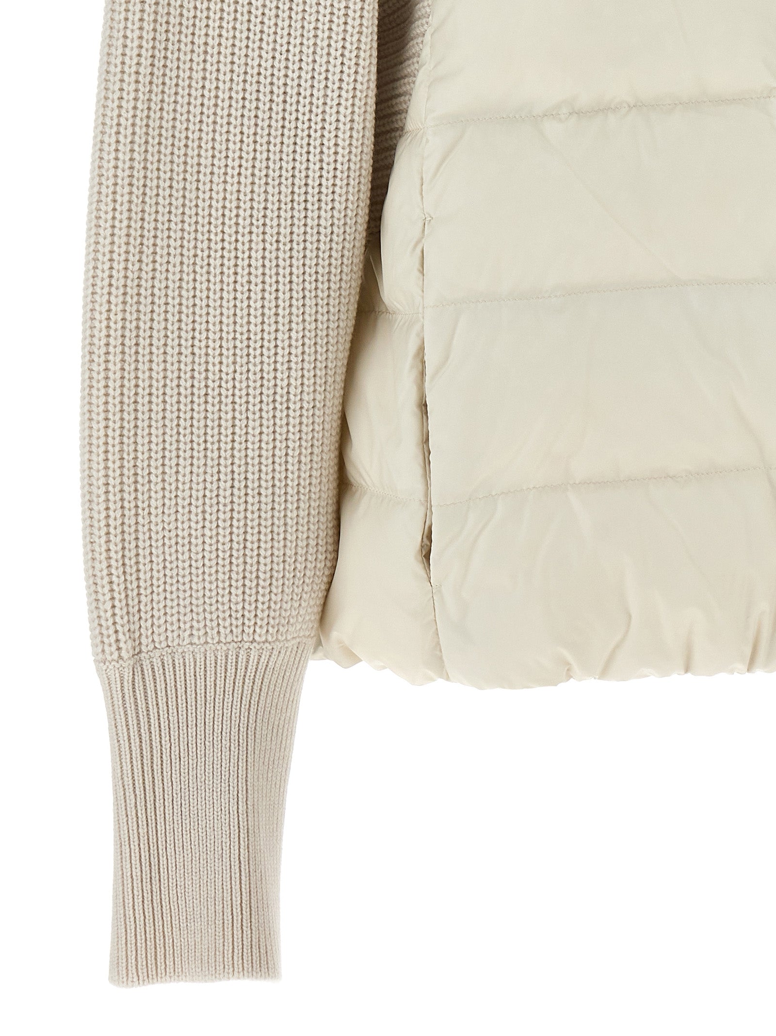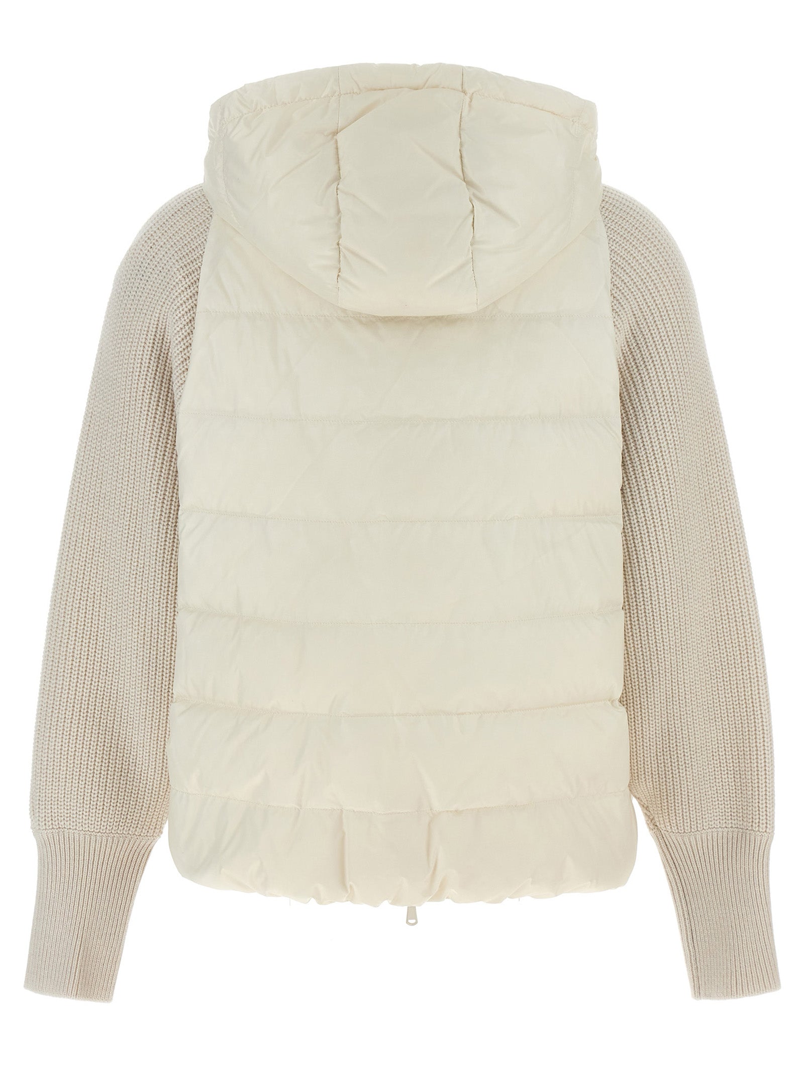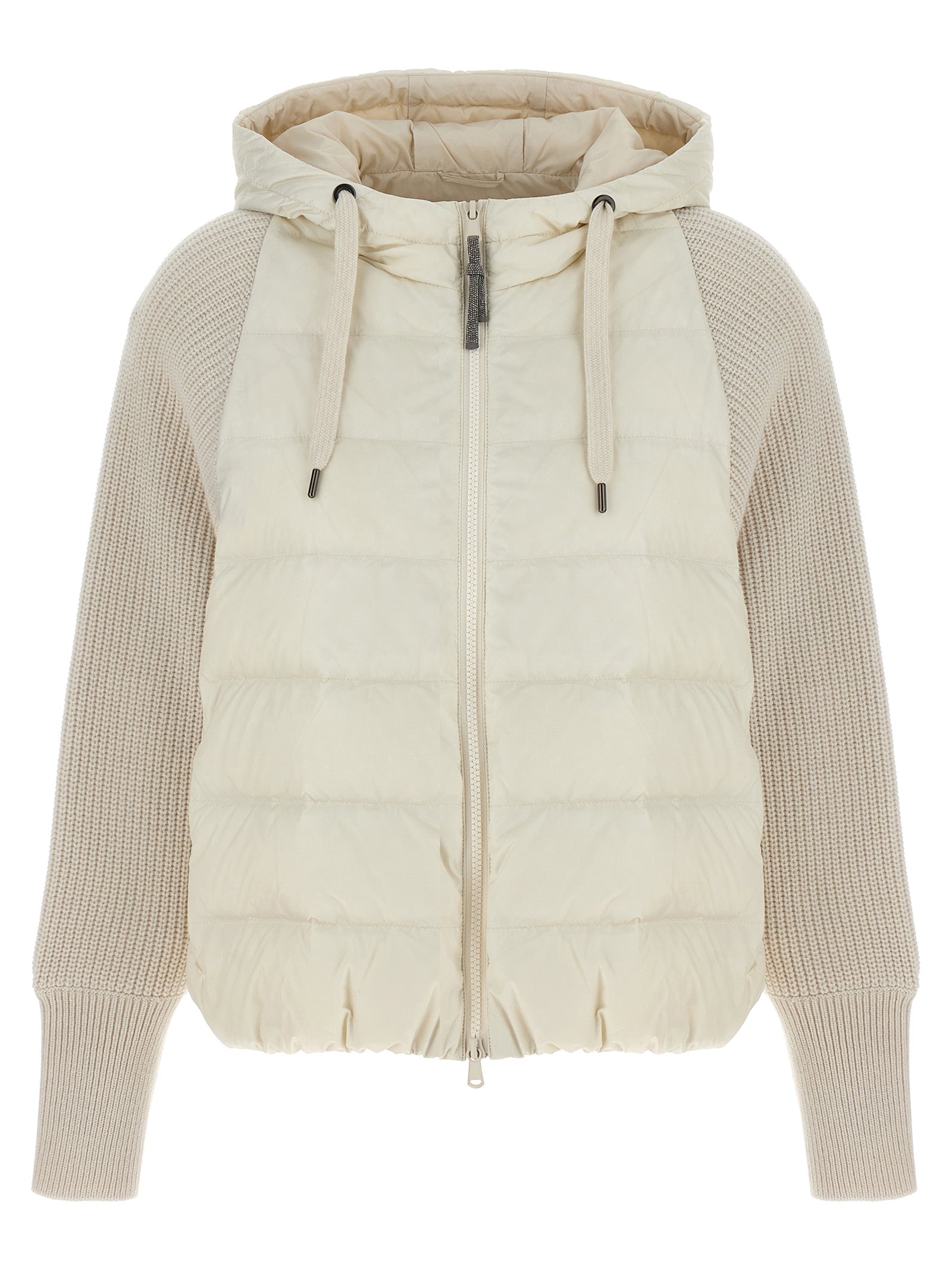 Hooded down jacket with goose down padding, zip closure with 'Monile' tie rod, 'Solomeo' yarn insert sleeves, pockets, drawstring at the waist.