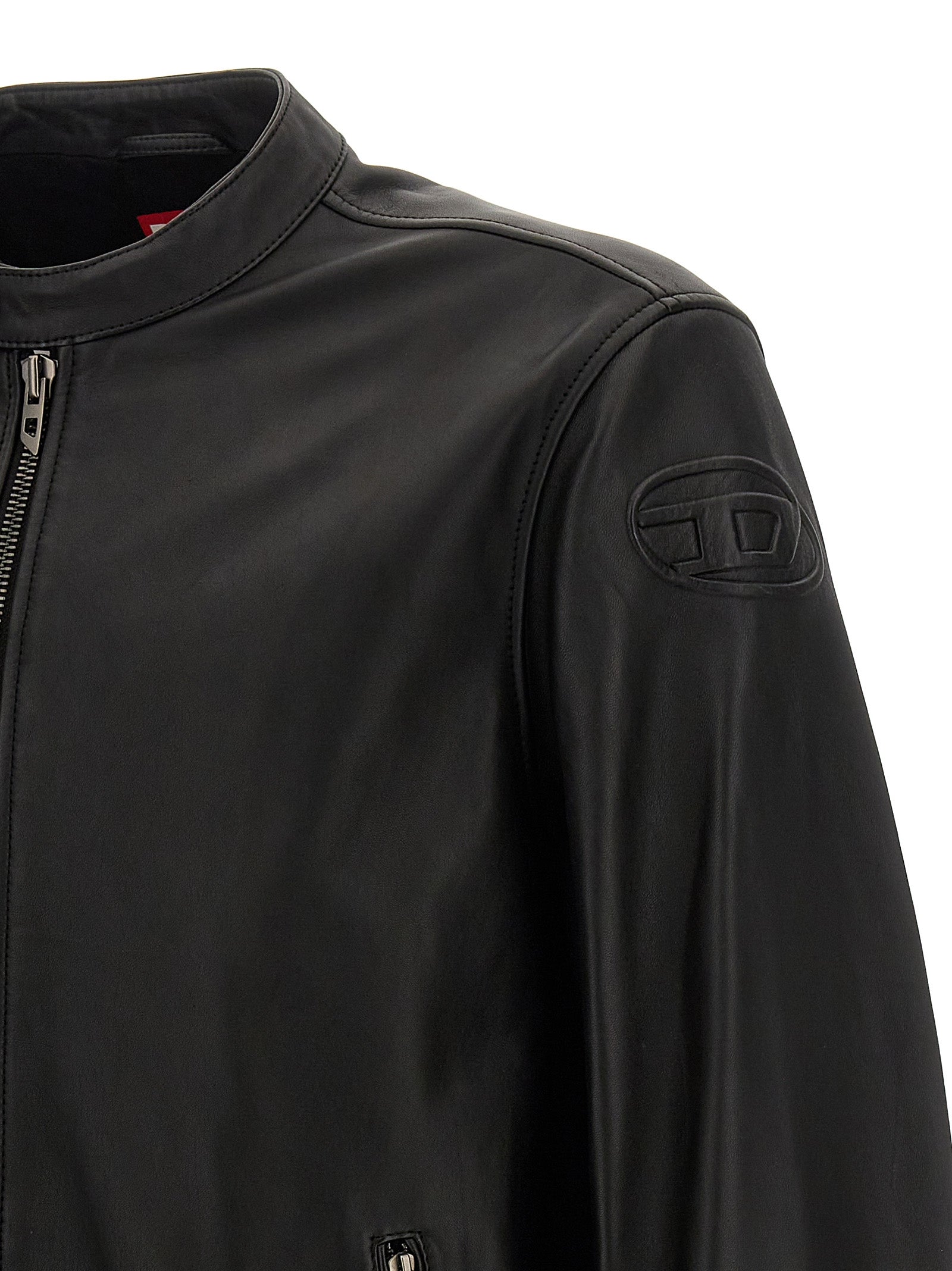 'L-Carver' leather jacket with embossed logo on the sleeve, zip closure, pockets, long sleeves with zip detail.