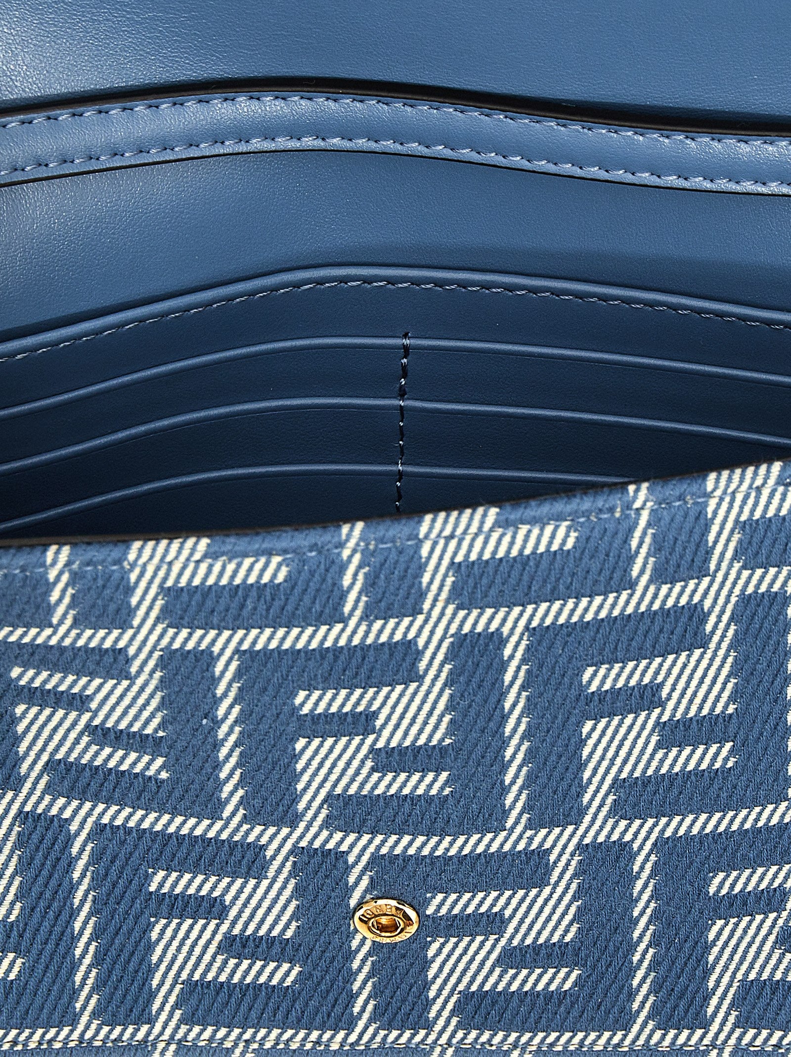 'Baguette' wallet on chain in FF jacquard with denim effect, flap closure with snap button and front metal logo, adjustable and removable leather handle, removable chain shoulder strap.