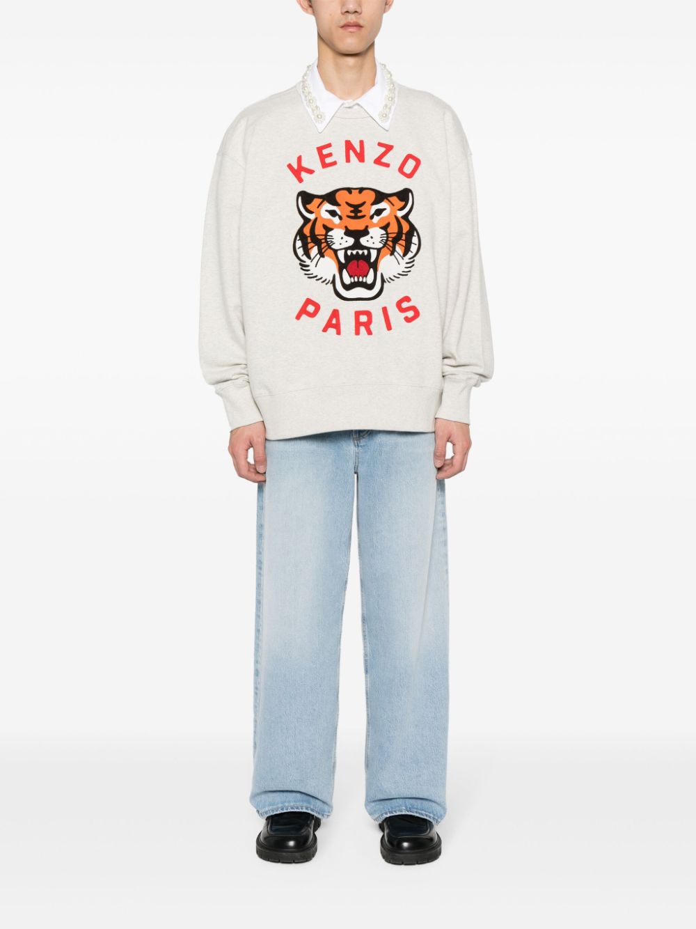 grey/multicolour cotton jersey texture ribbed trim mélange effect signature Tiger Head motif embroidered logo to the front logo patch to the rear round neck drop shoulder long sleeves straight hem fleece lining When buying this unisex item, keep in mind that it is graded in standard men's sizing.