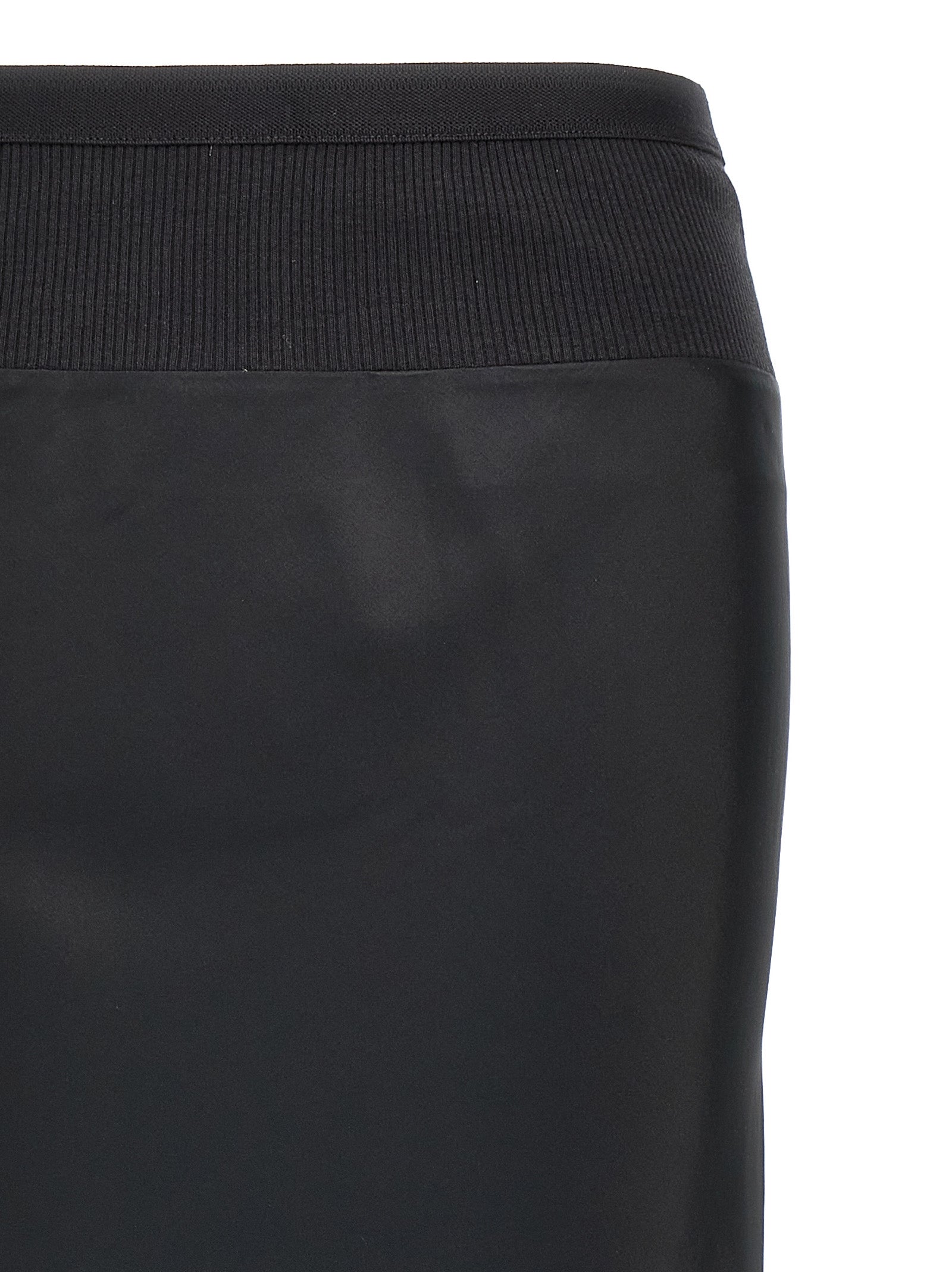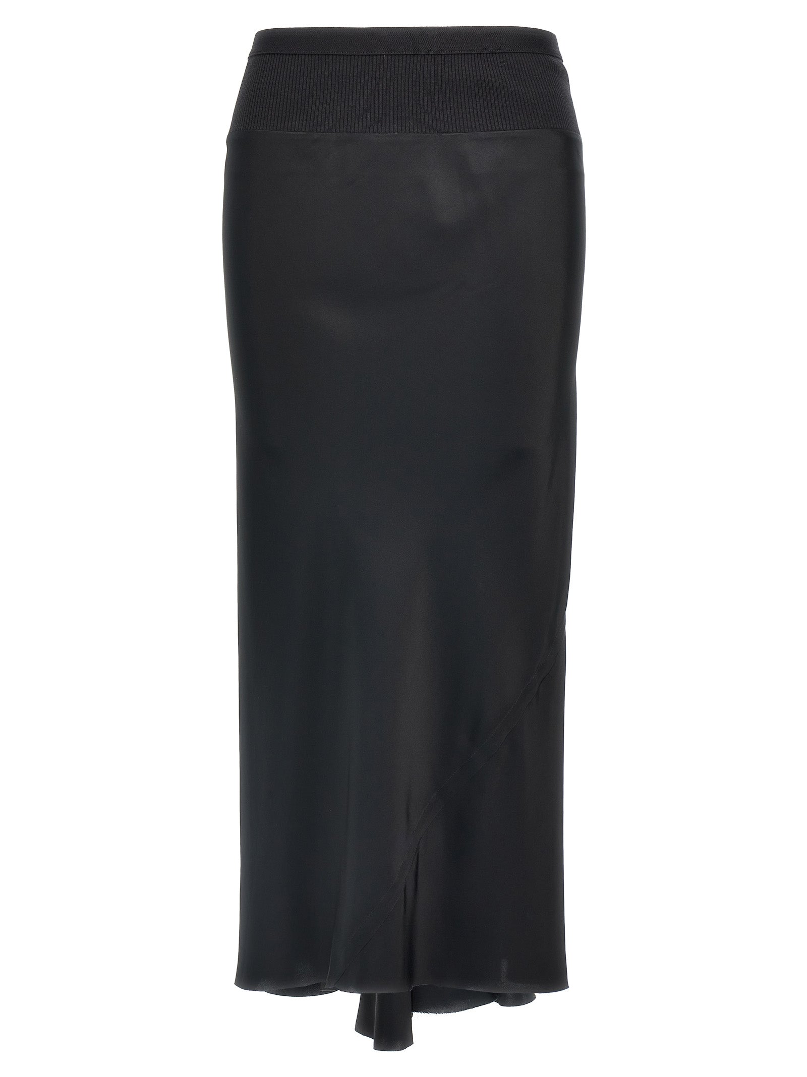 'A line Bias' skirt, legegrmente flared, elastic knitted waistband, with stitching, raw cut hem.