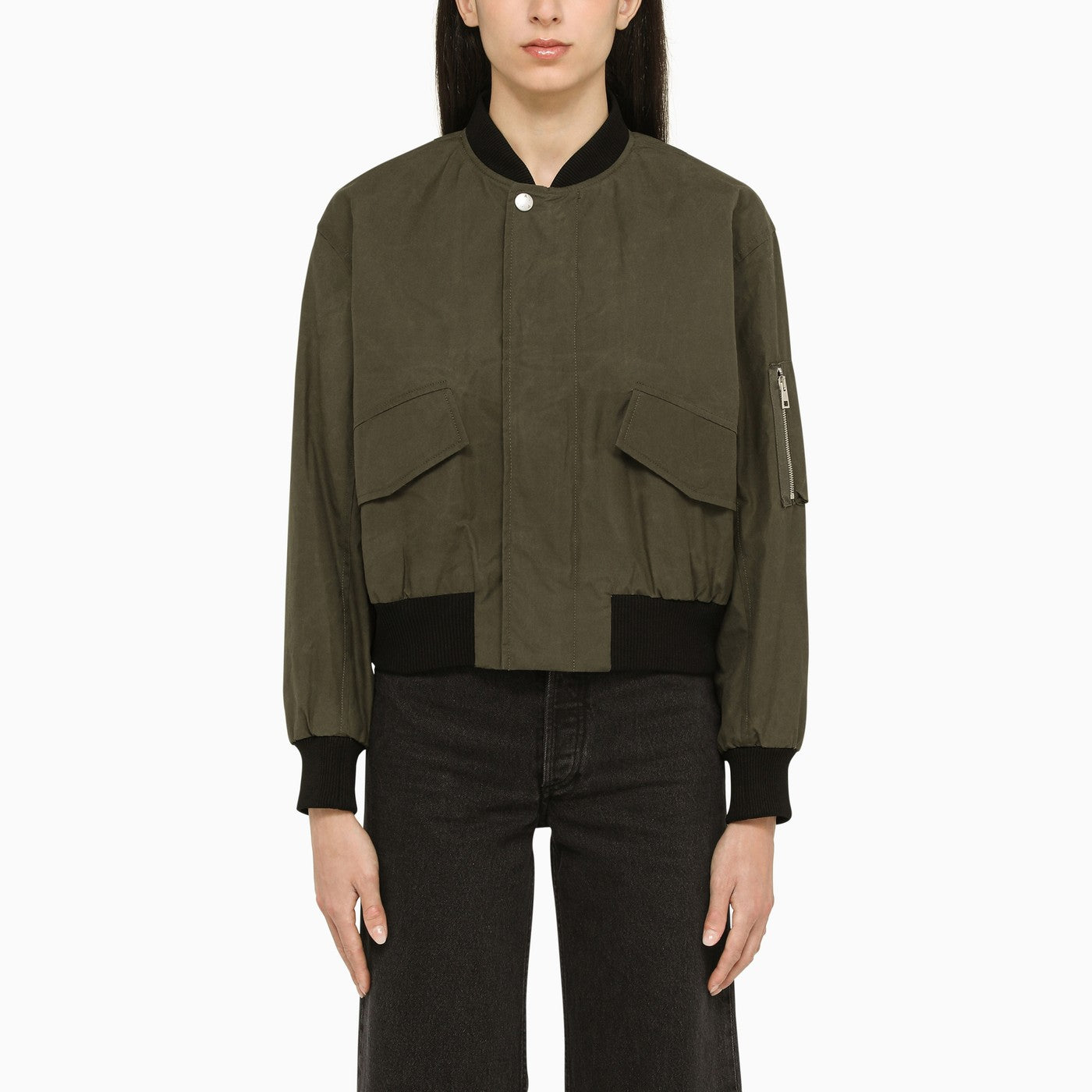 Bomber jacket by A.P.C. made of quilted khaki fabric with knitted elasticated hems, long sleeves, concealed fastening, one sleeve pocket and two front flap pockets.