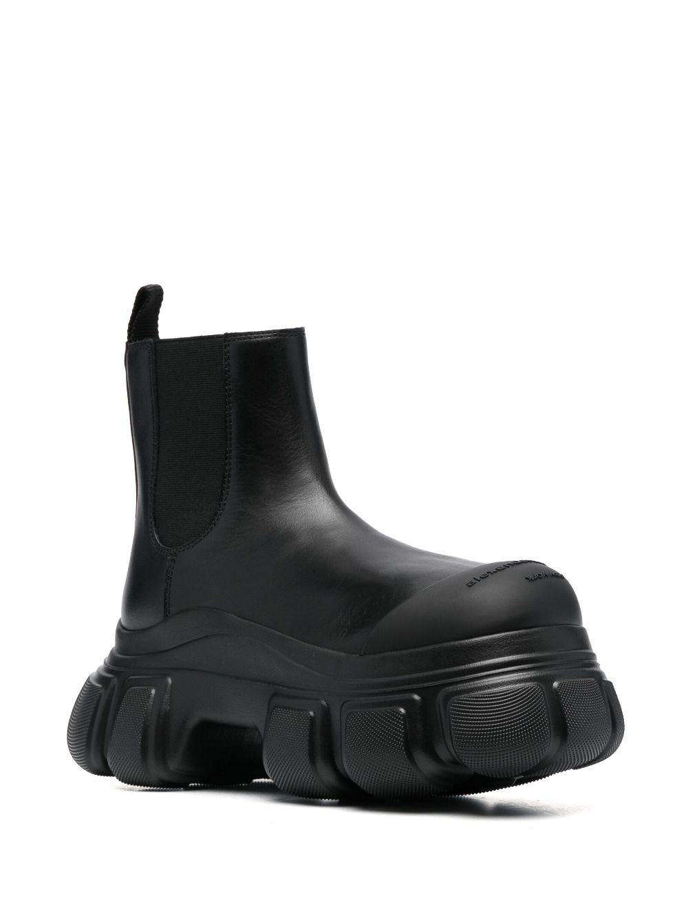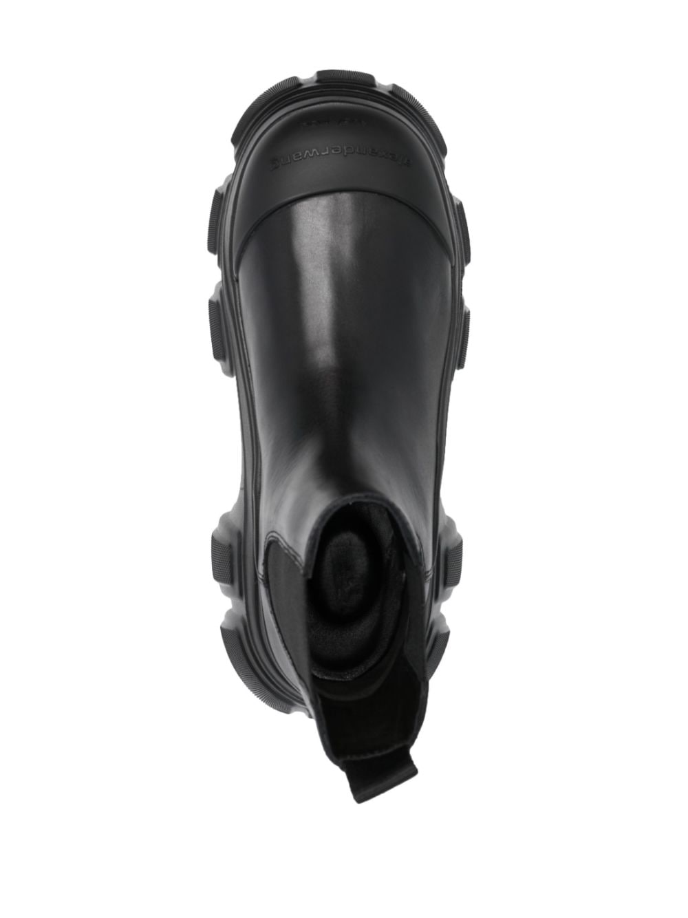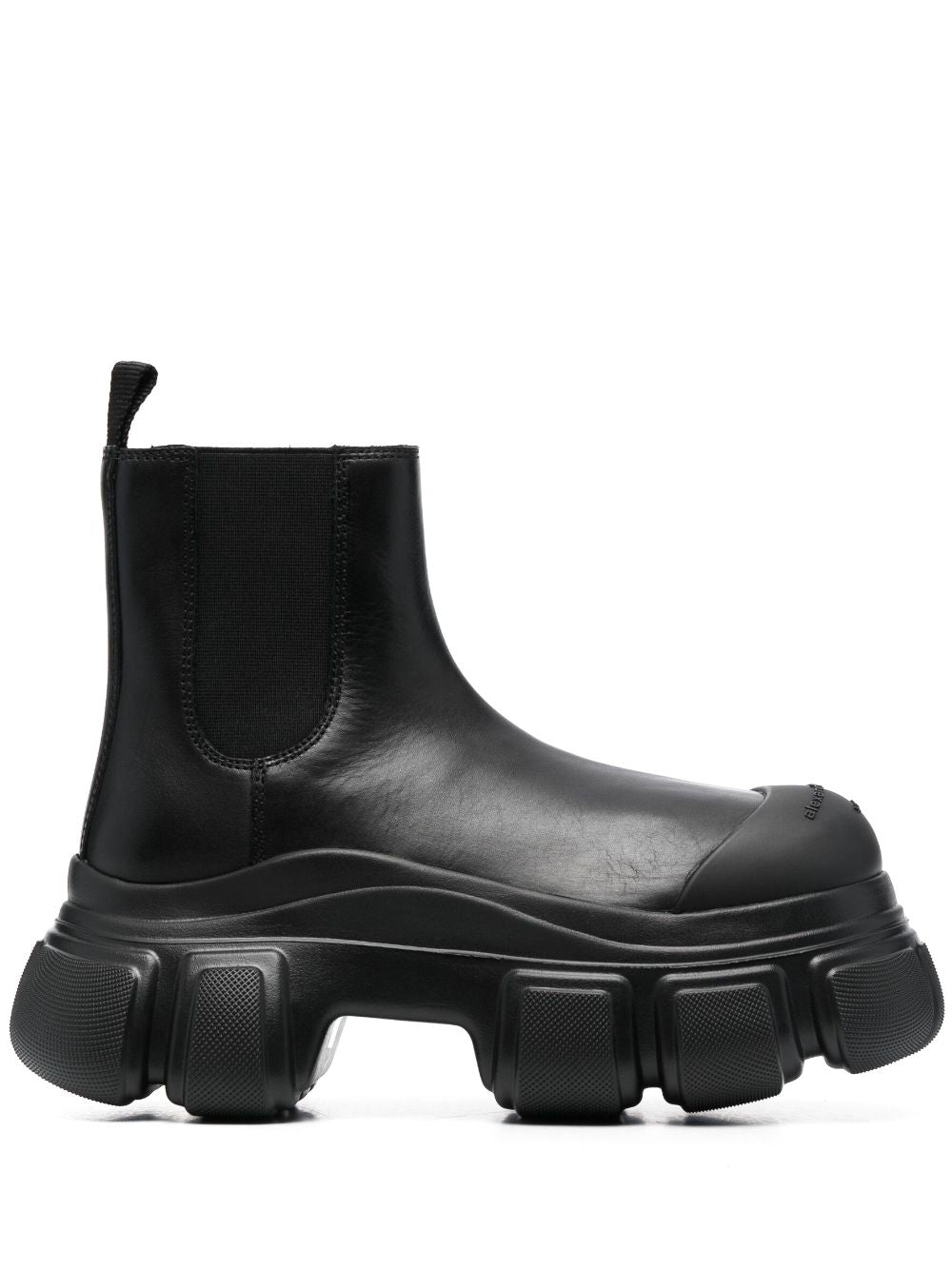 Storm leather ankle boots from ALEXANDER WANG featuring black, calf leather, smooth grain, pull-tab at the heel, round toe, slip-on style, elasticated side panels, contrasting rubber sole and chunky rubber sole.