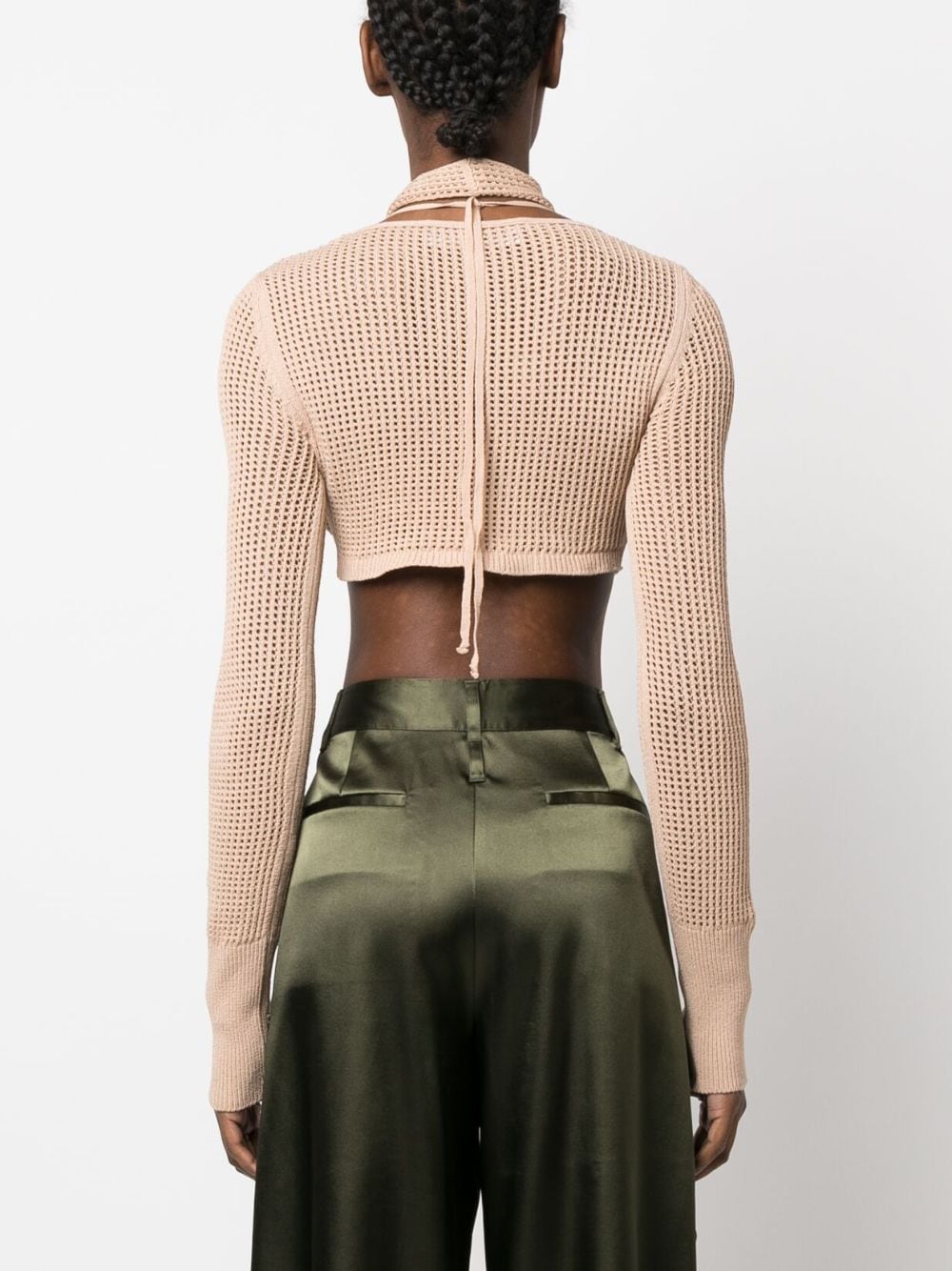 open-knit halterneck crop top from ANDREADAMO featuring blush beige, open knit, semi-sheer construction, knot detailing, halterneck tie fastening, long sleeves and cropped.