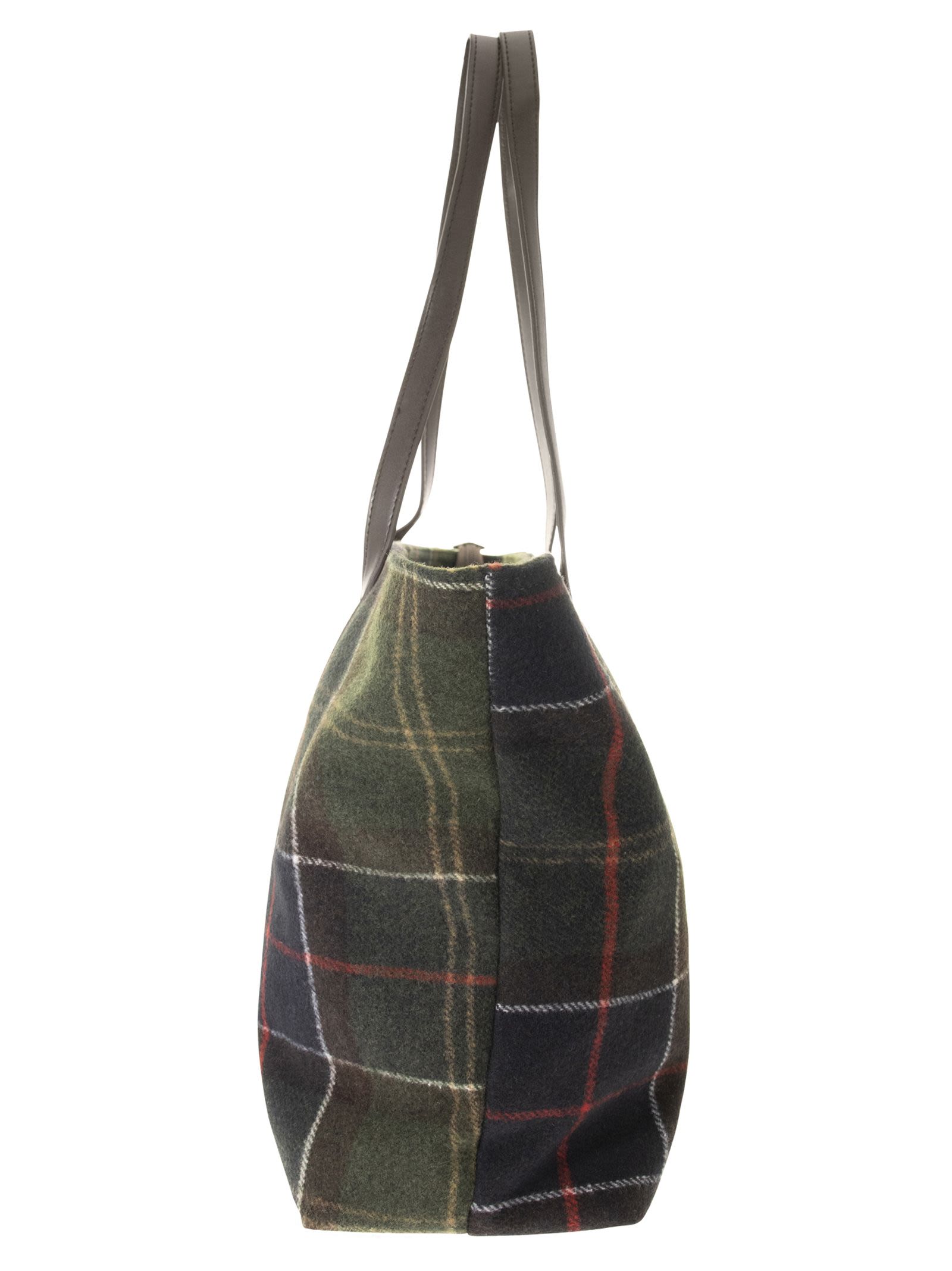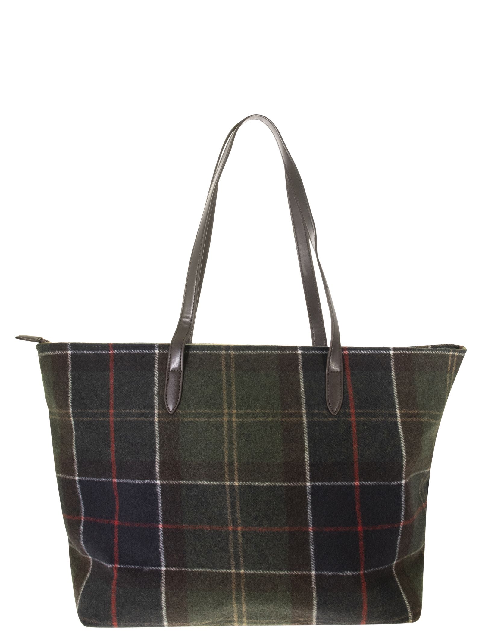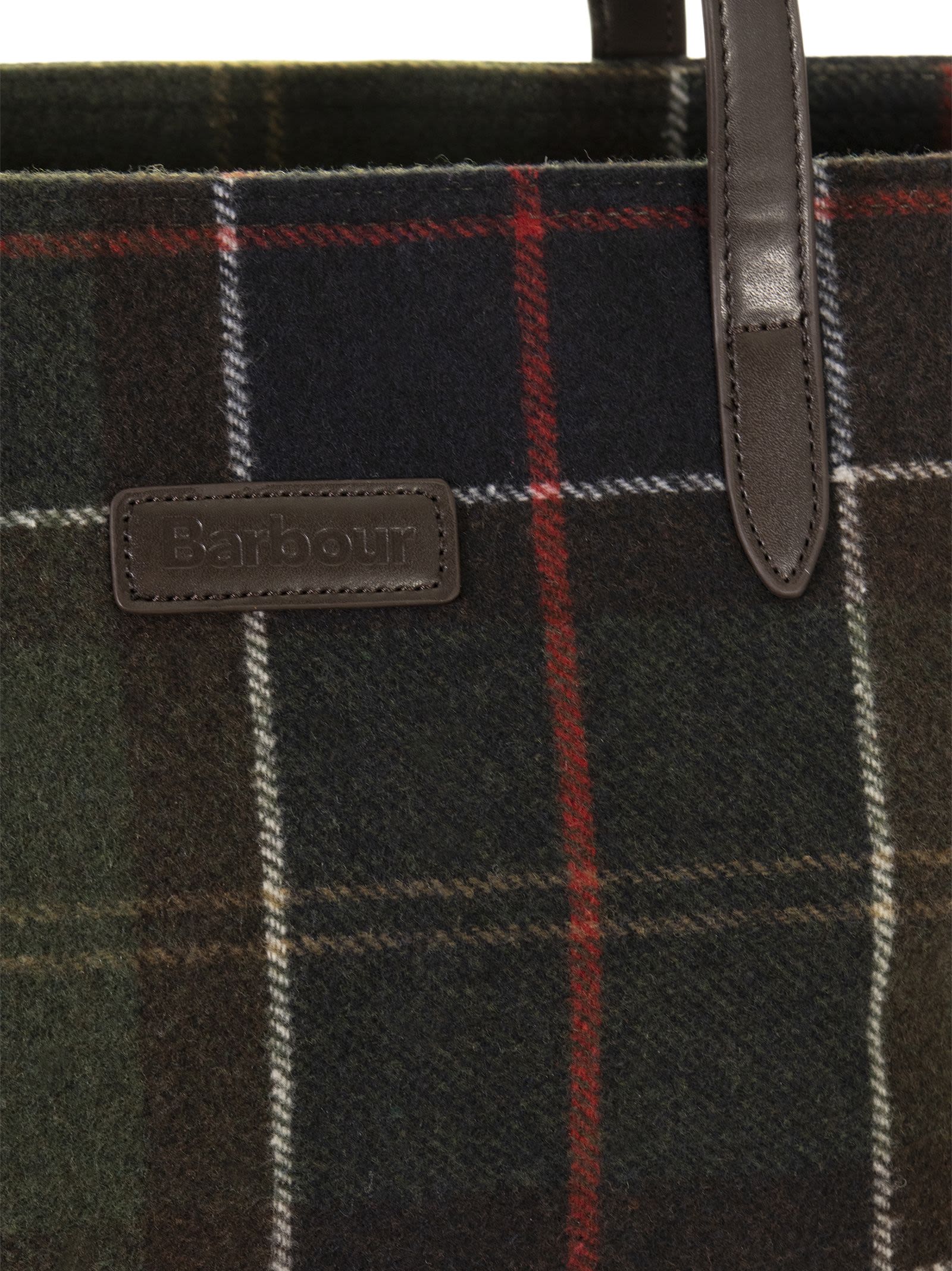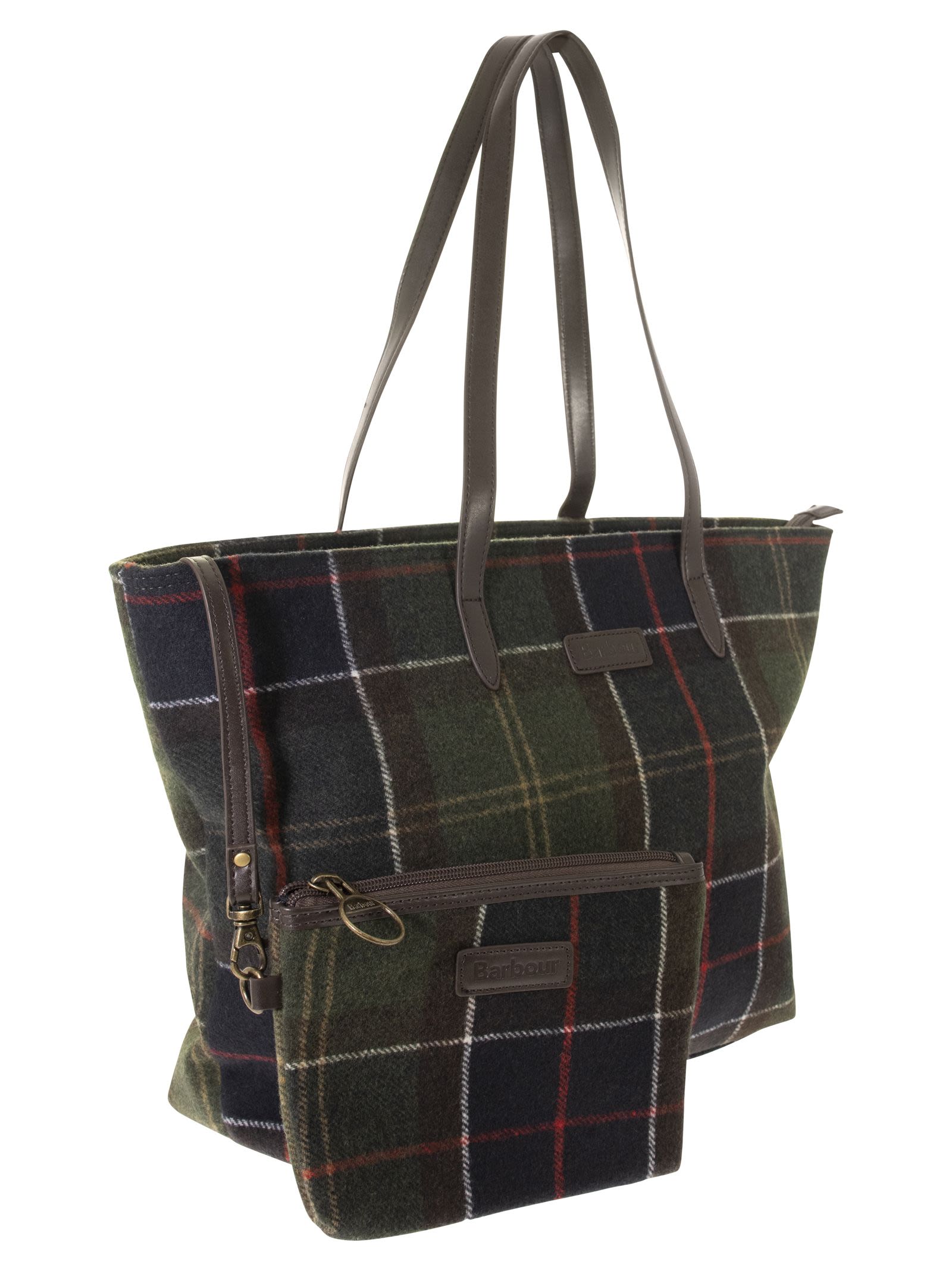 This versatile tote bag is crafted with a Barbour tartan exterior and leather straps. It unzips to reveal a large main compartment with an internal valuables pocket and a separate detachable pouch. This elegant bag is finished with an embossed leather badge on the outer front. - Leather badge and straps DESIGNER ID: LBA0304 LBA TN11