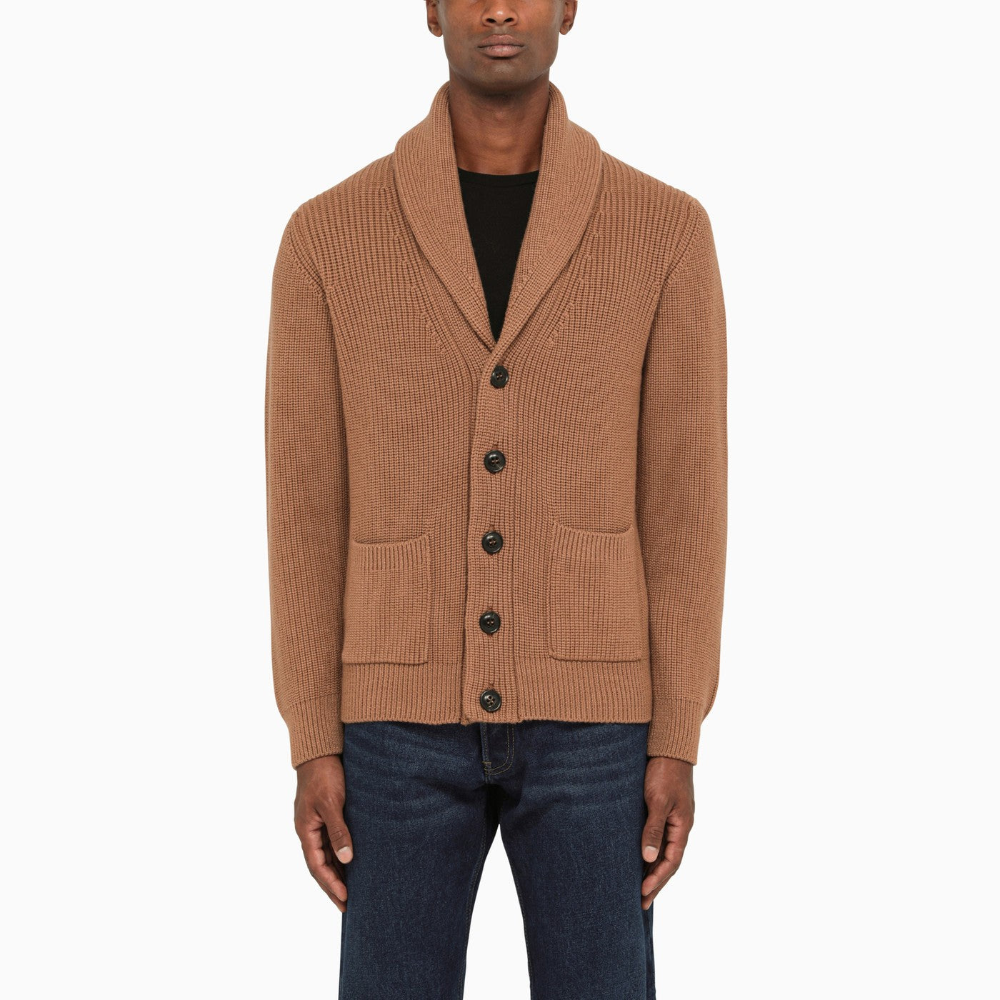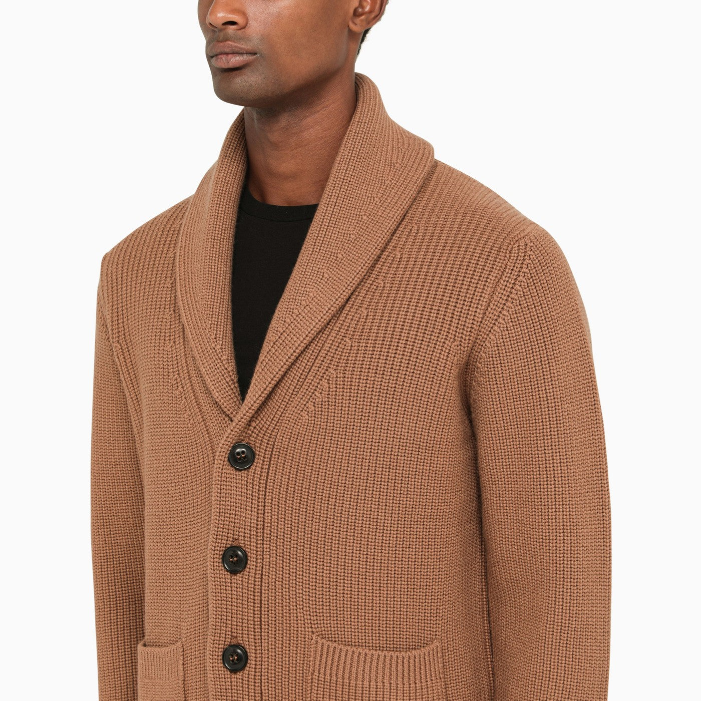 Drumhor's camel-coloured merino wool cardigan features a ribbed design, shawl collar and two front pockets