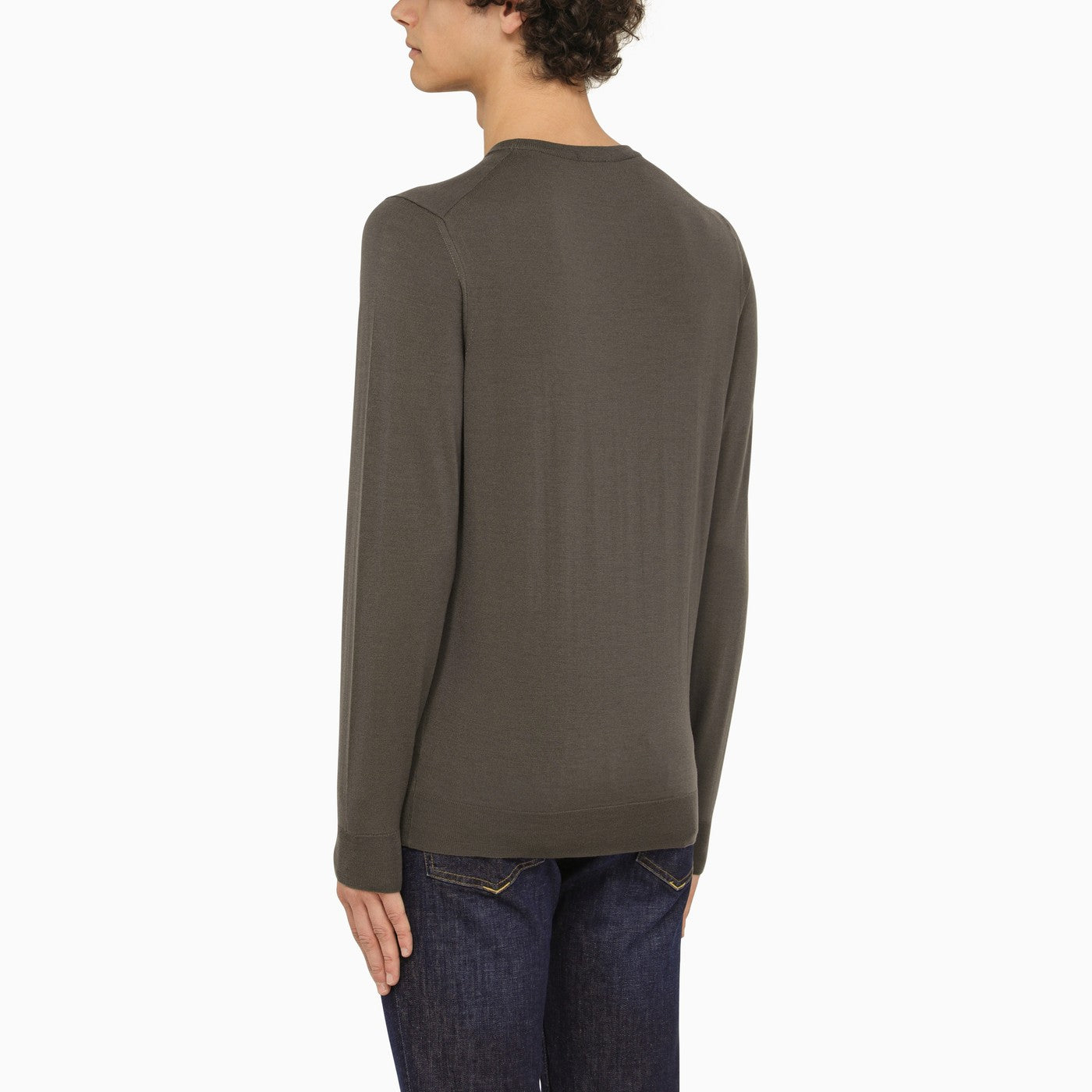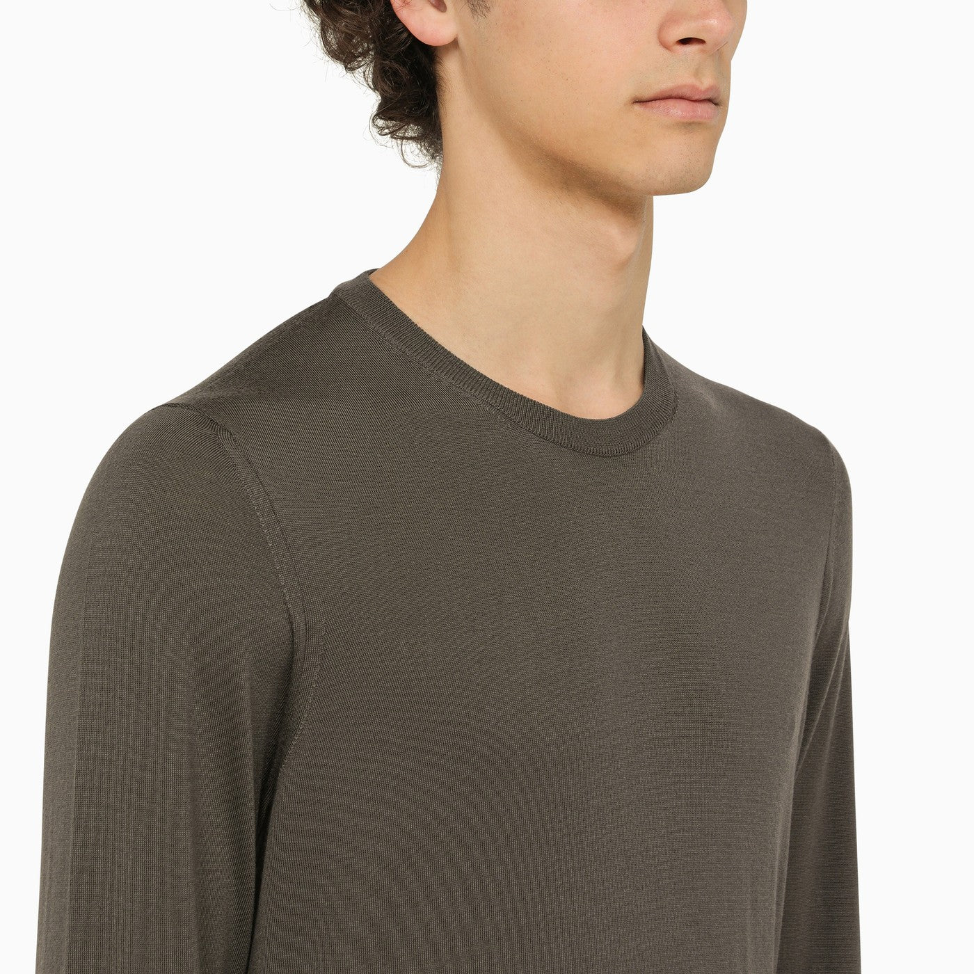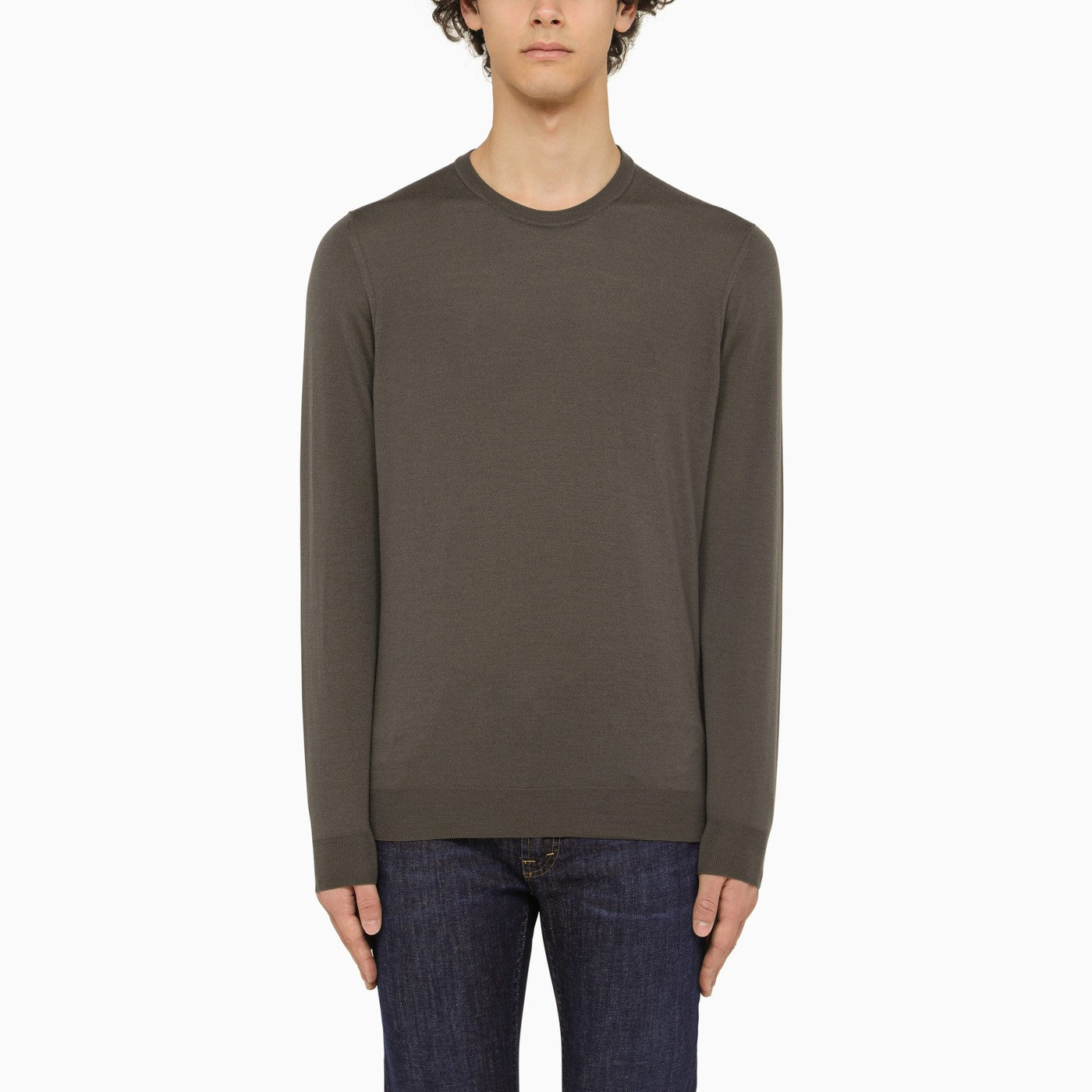 Grey wool lightweight crewneck sweater by Drumohr featuring long sleeves and ribbed trim. Regular fit.