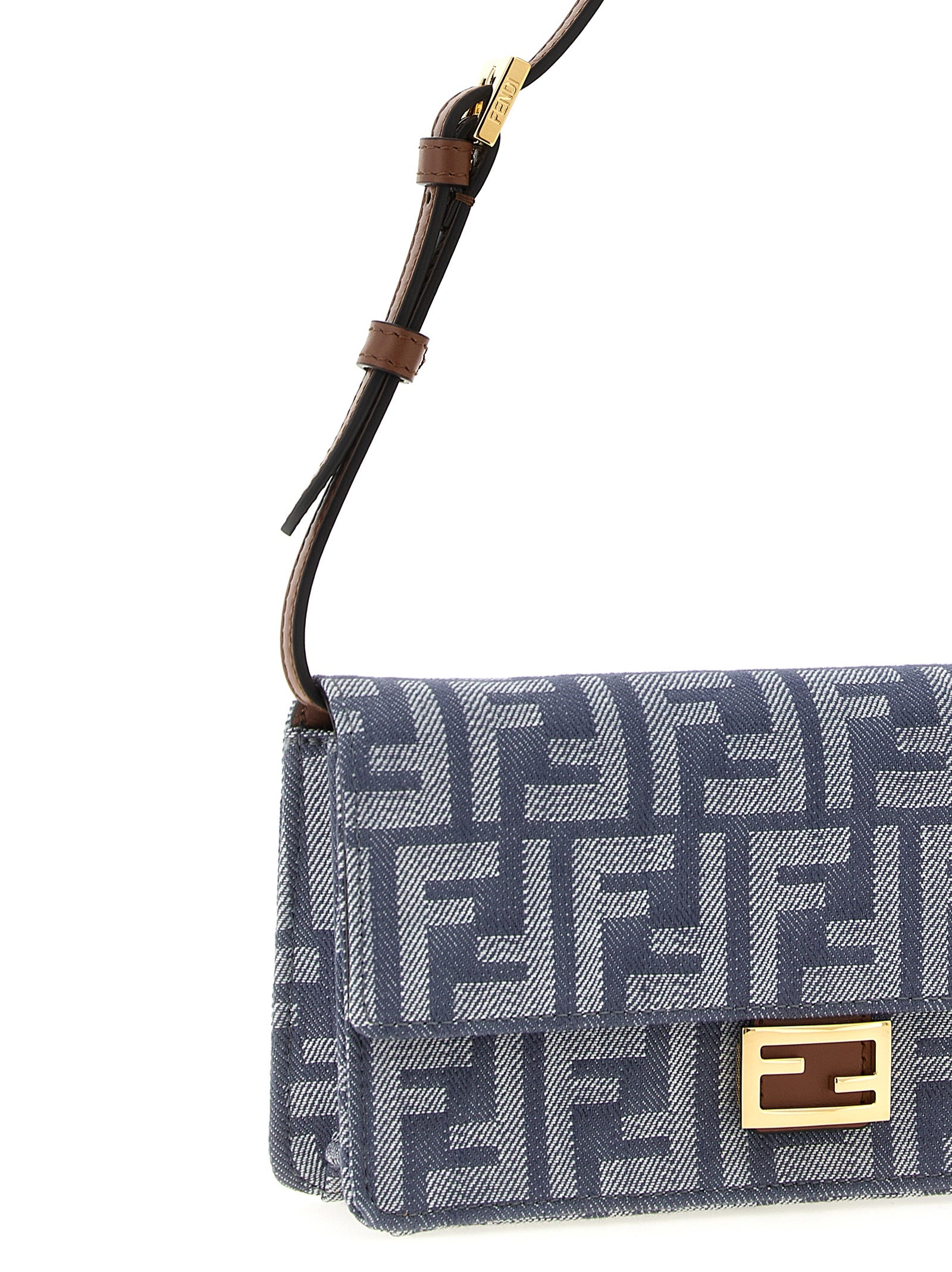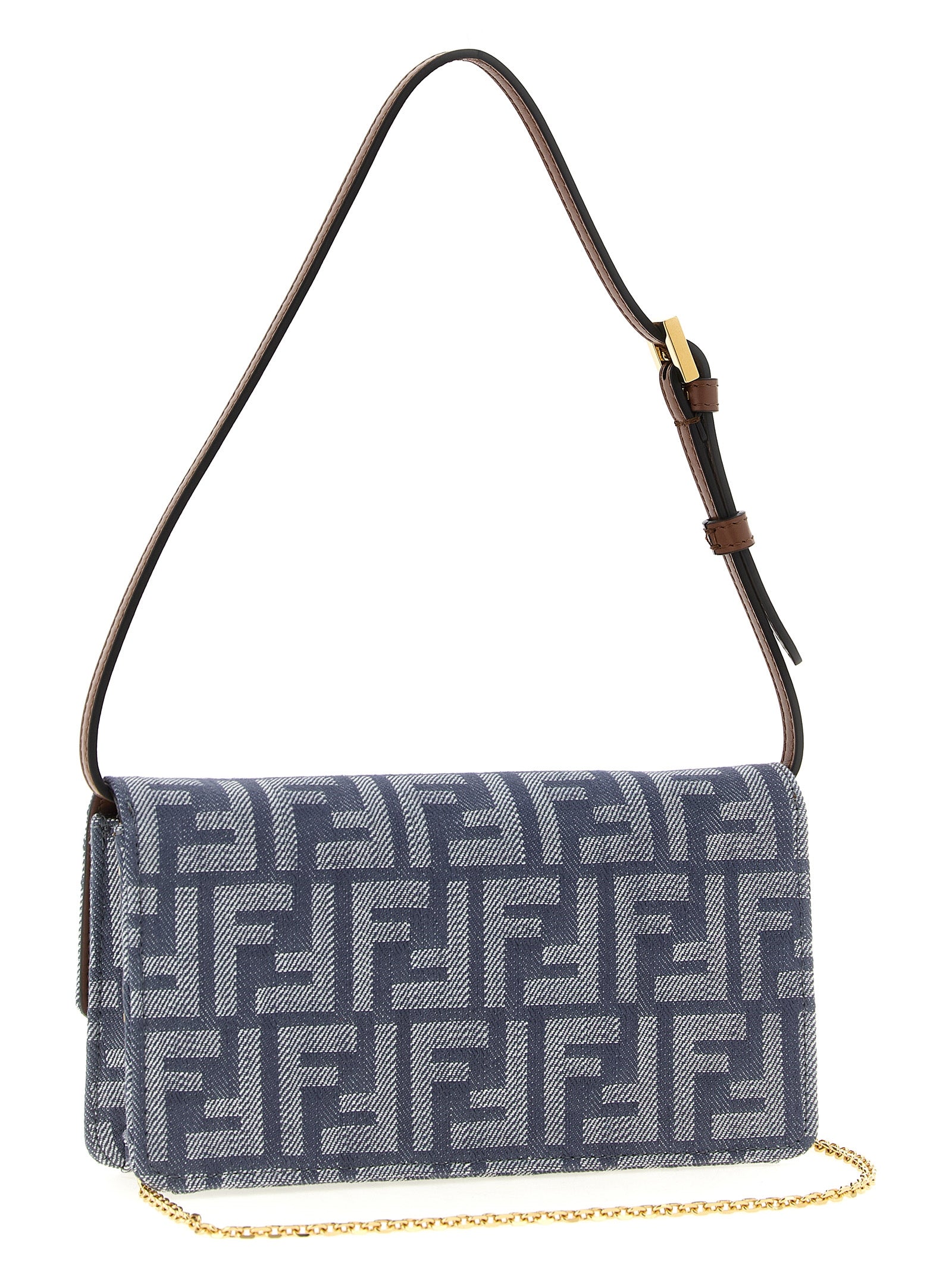 'Baguette' wallet on chain in FF jacquard with denim effect, flap closure with snap button and front metal logo, leather interior, adjustable and removable leather handle, removable chain shoulder strap.