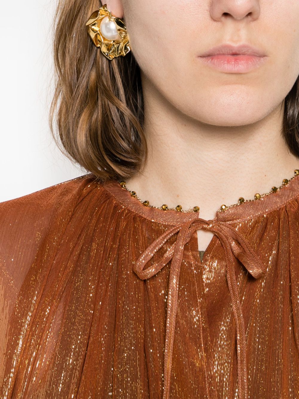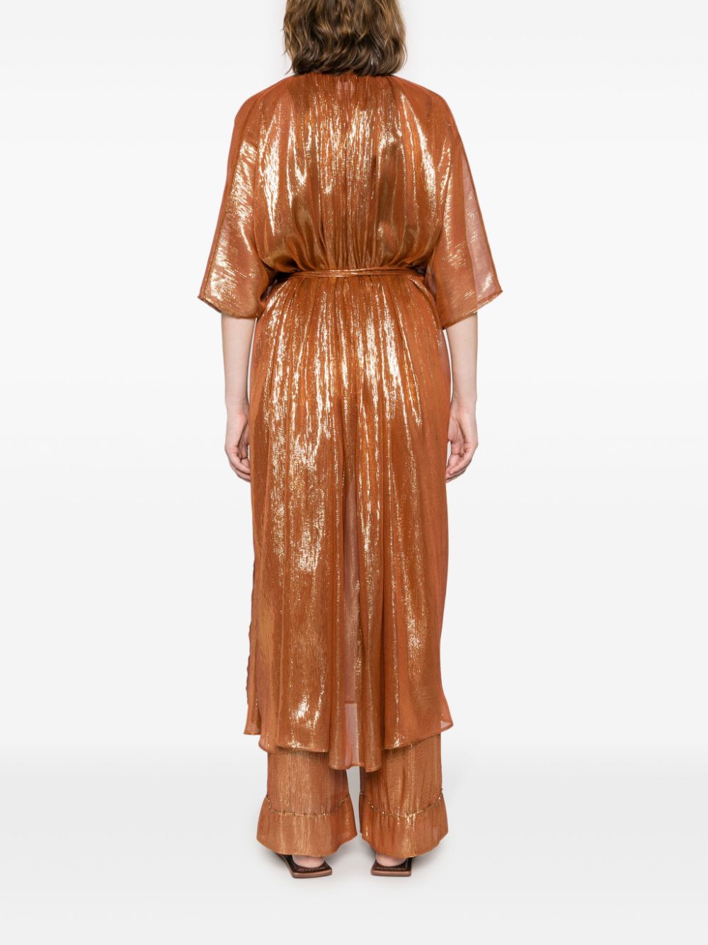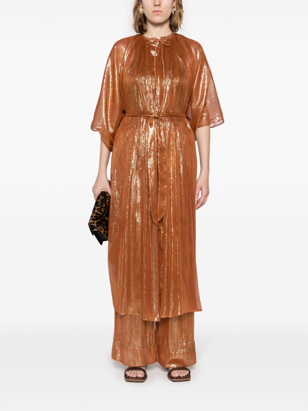 bronze-tone silk blend metallic threading semi-sheer construction vertical stripe pattern bead detailing gathered tie neck arm openings side slits straight hem detachable belt long length