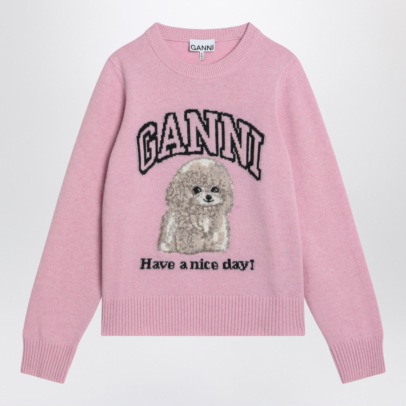 Ganni round-neck sweater in pink wool blend, featuring a front intarsia with a poodle and logo lettering, long sleeves, ribbed edges, and a regular fit.
